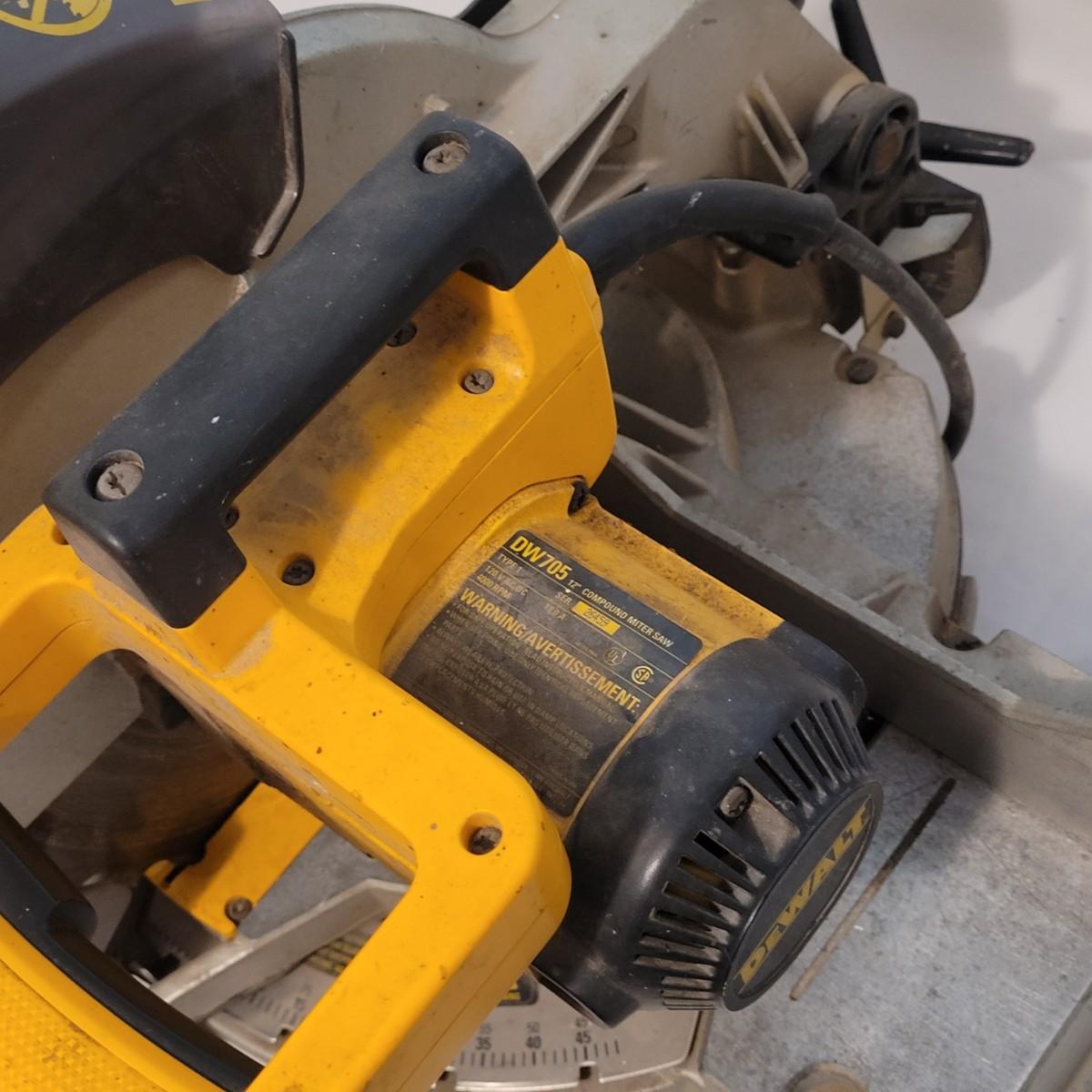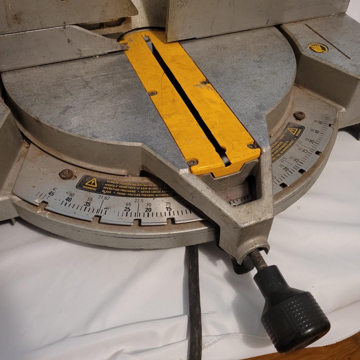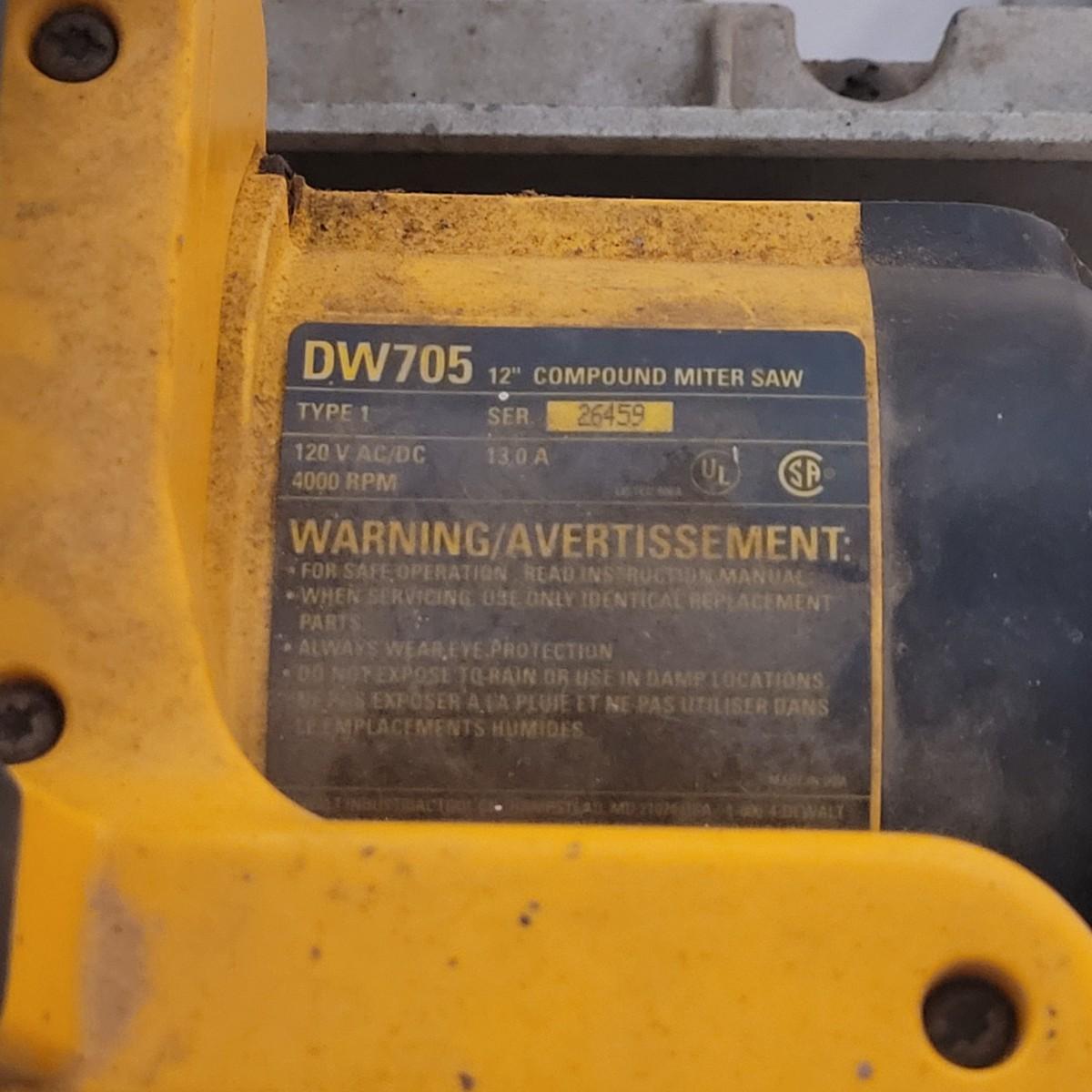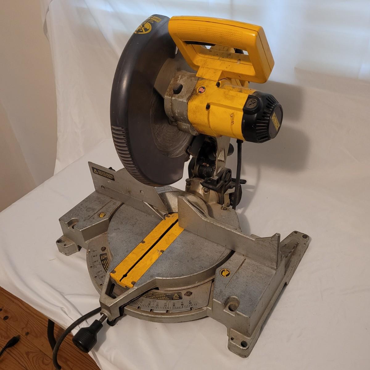DeWalt brand 12" circular miter saw. Has a 15 Amp motor and operates at 4,000 RPM.