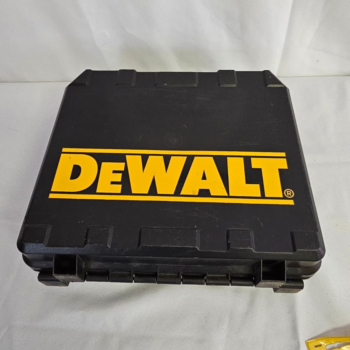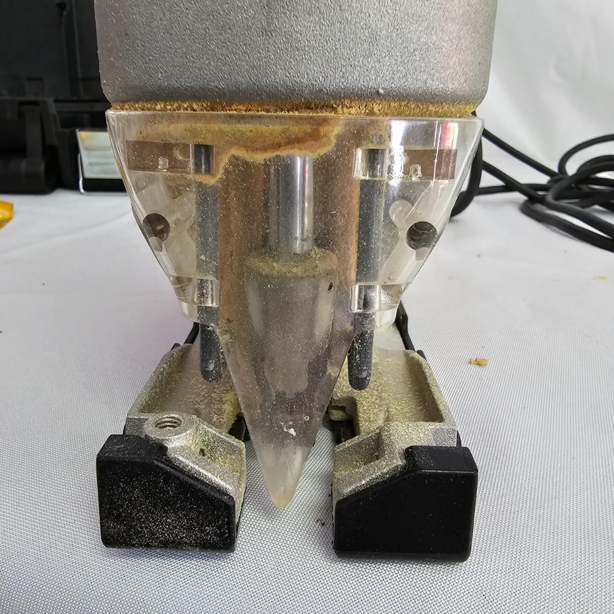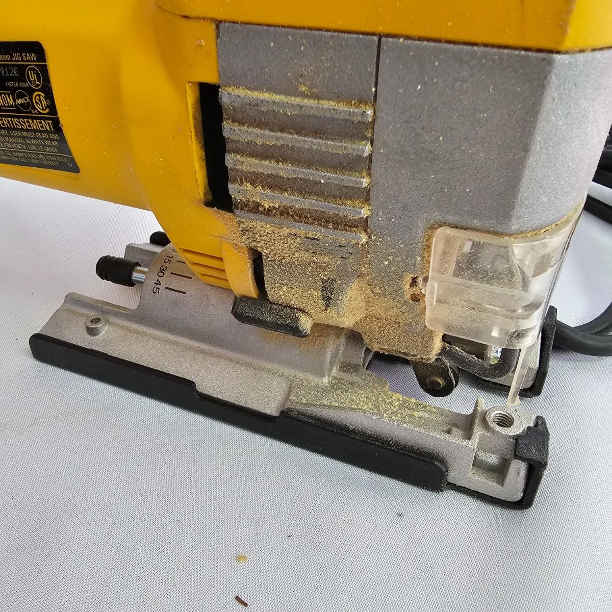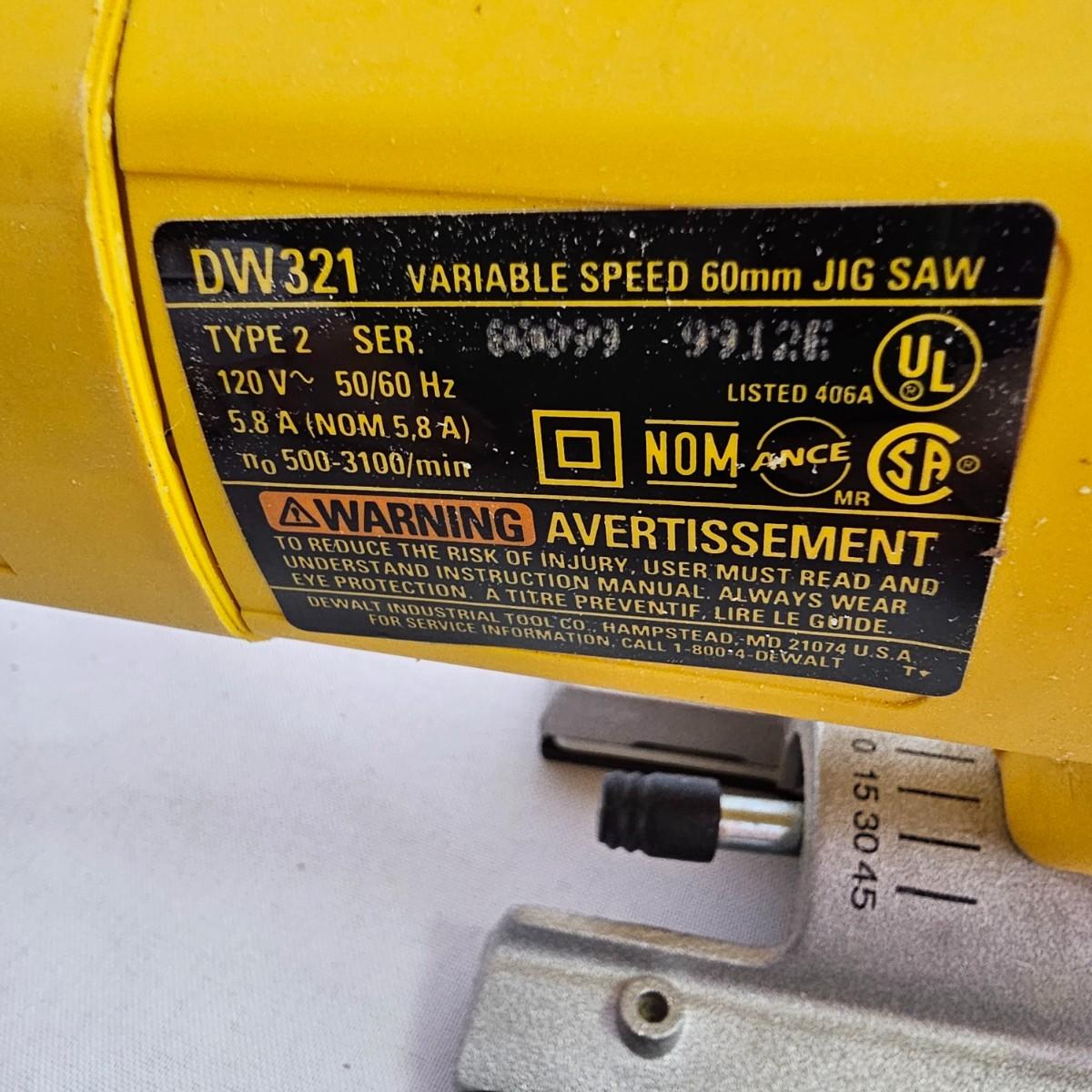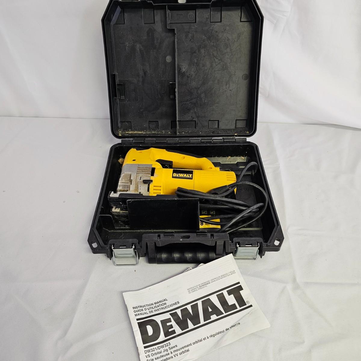 An orbital jigsaw with case by DeWalt. Variable speed, comes with several extra blades. Item powered on when plugged in. See photos for details. Shipping available.