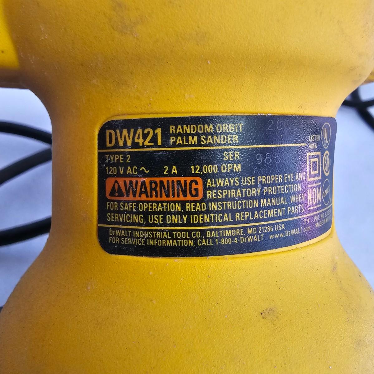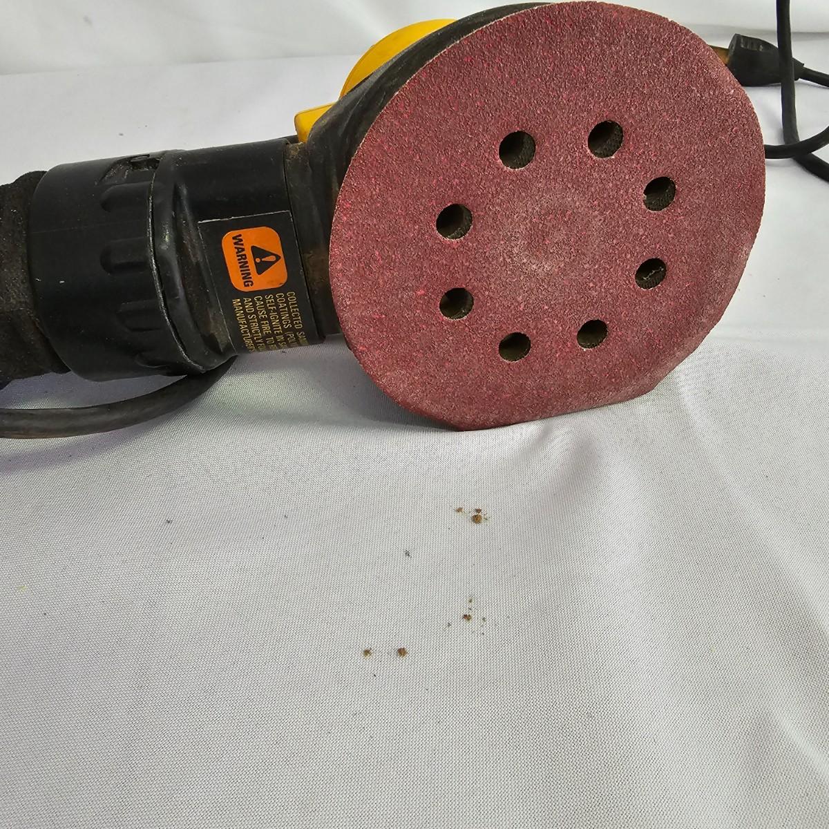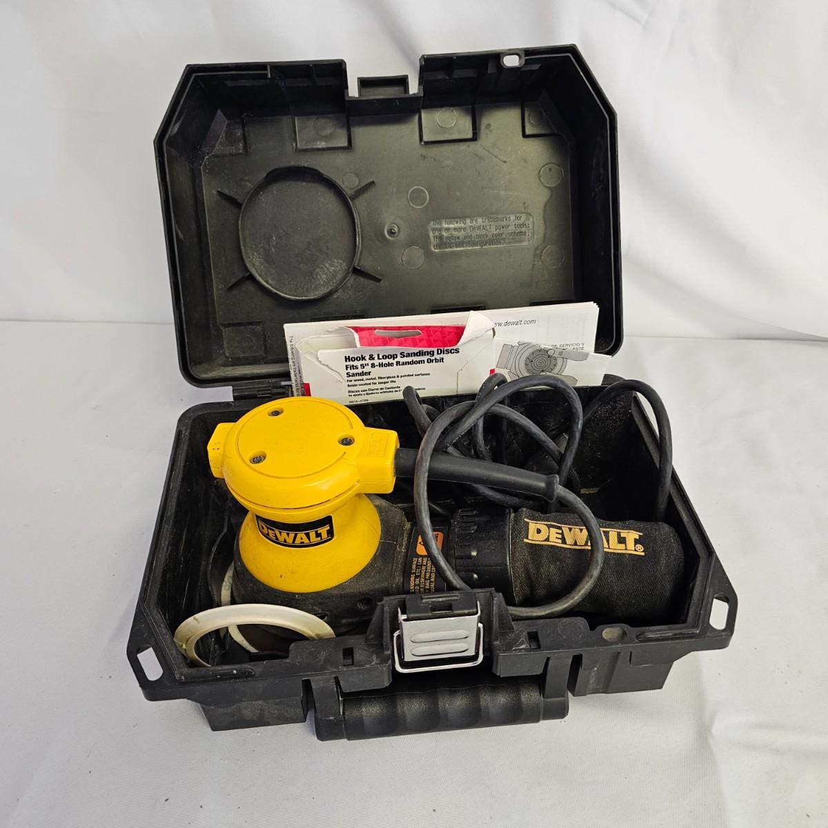 Random orbit palm sander by DeWalt. Uses 5" hook & loop discs, some extra included. Also has manual and hardshell case. Powered on when plugged in. See photos for details. Shipping available.