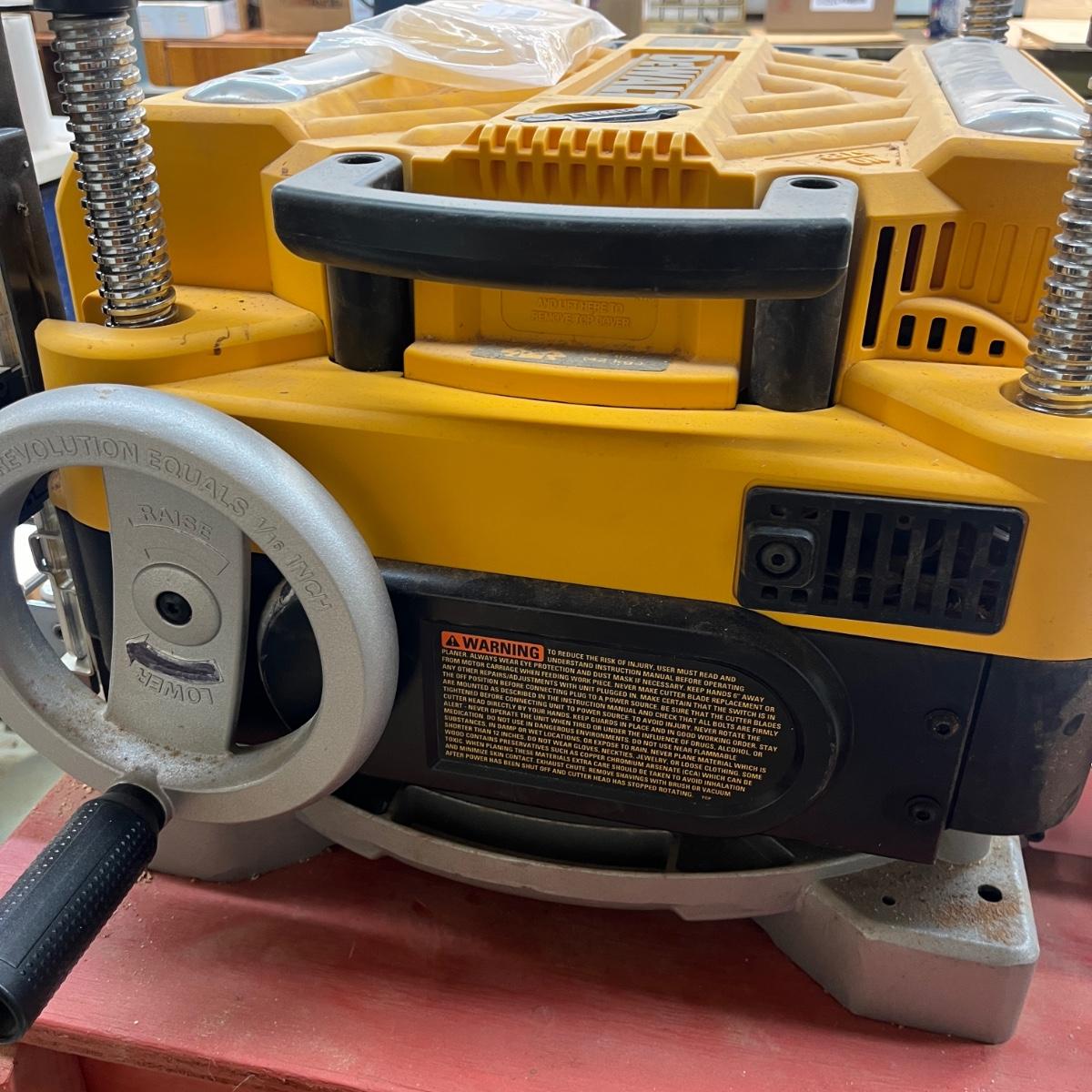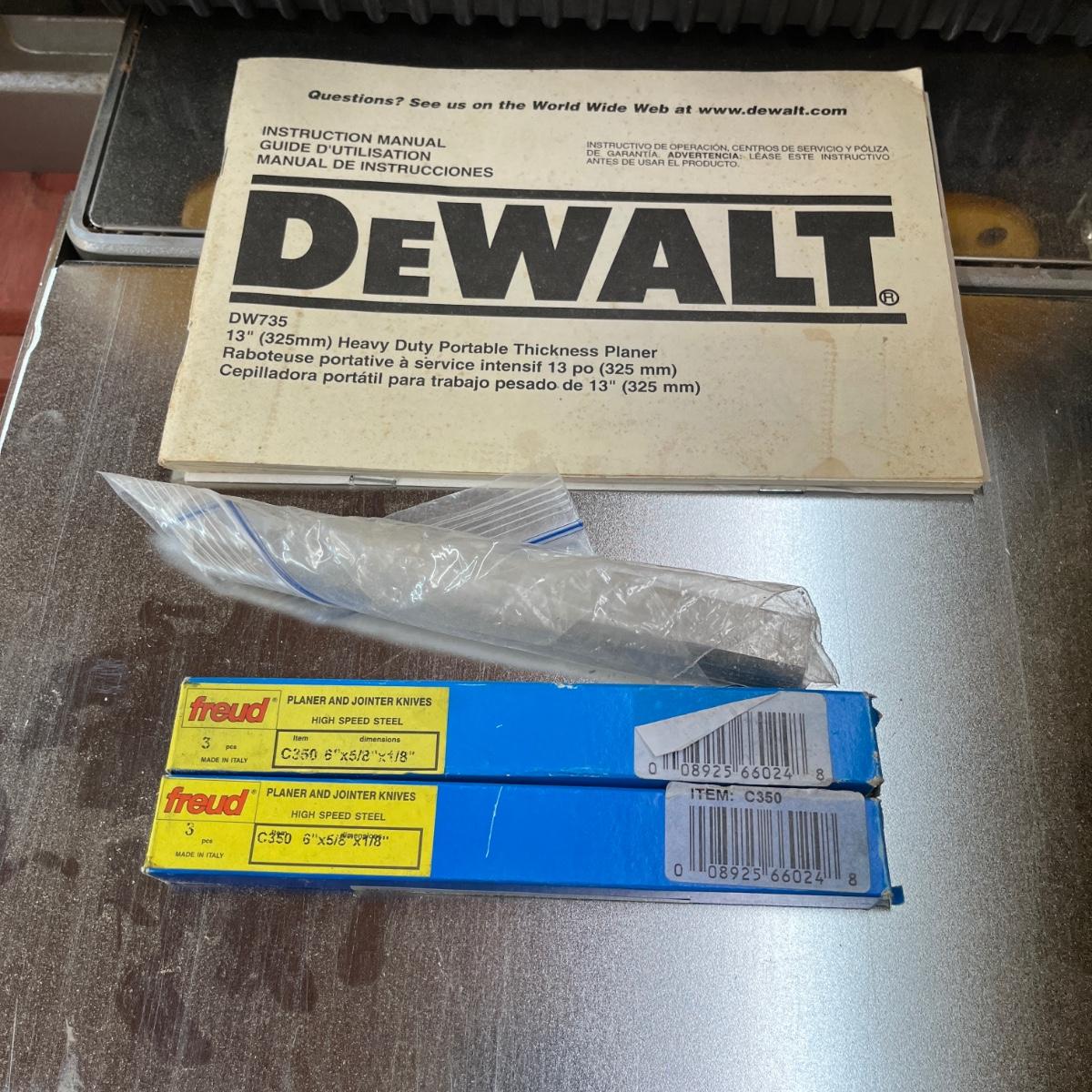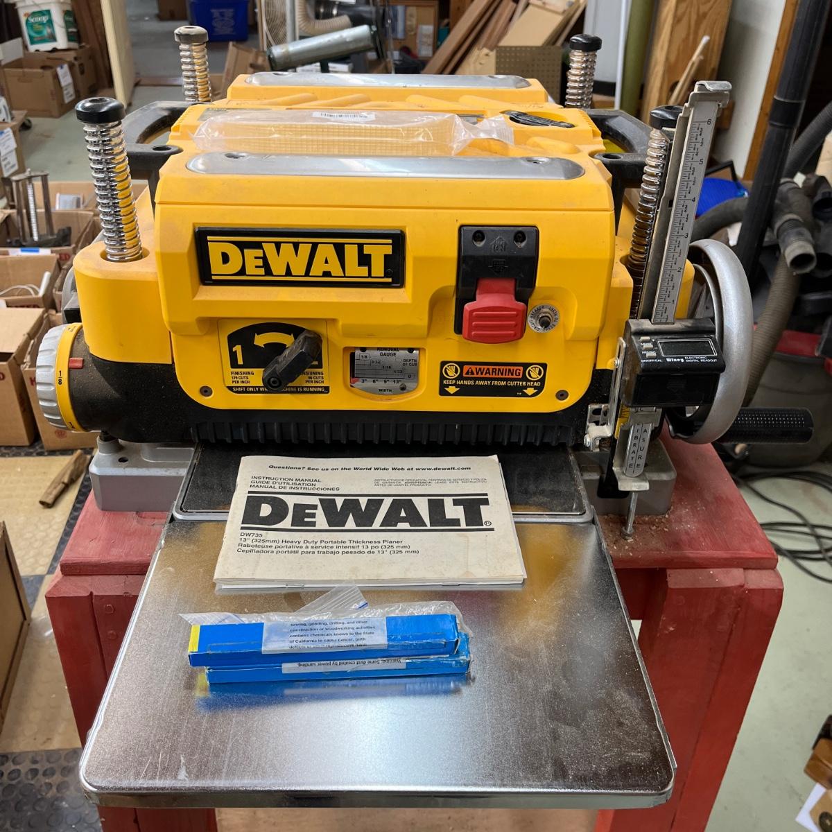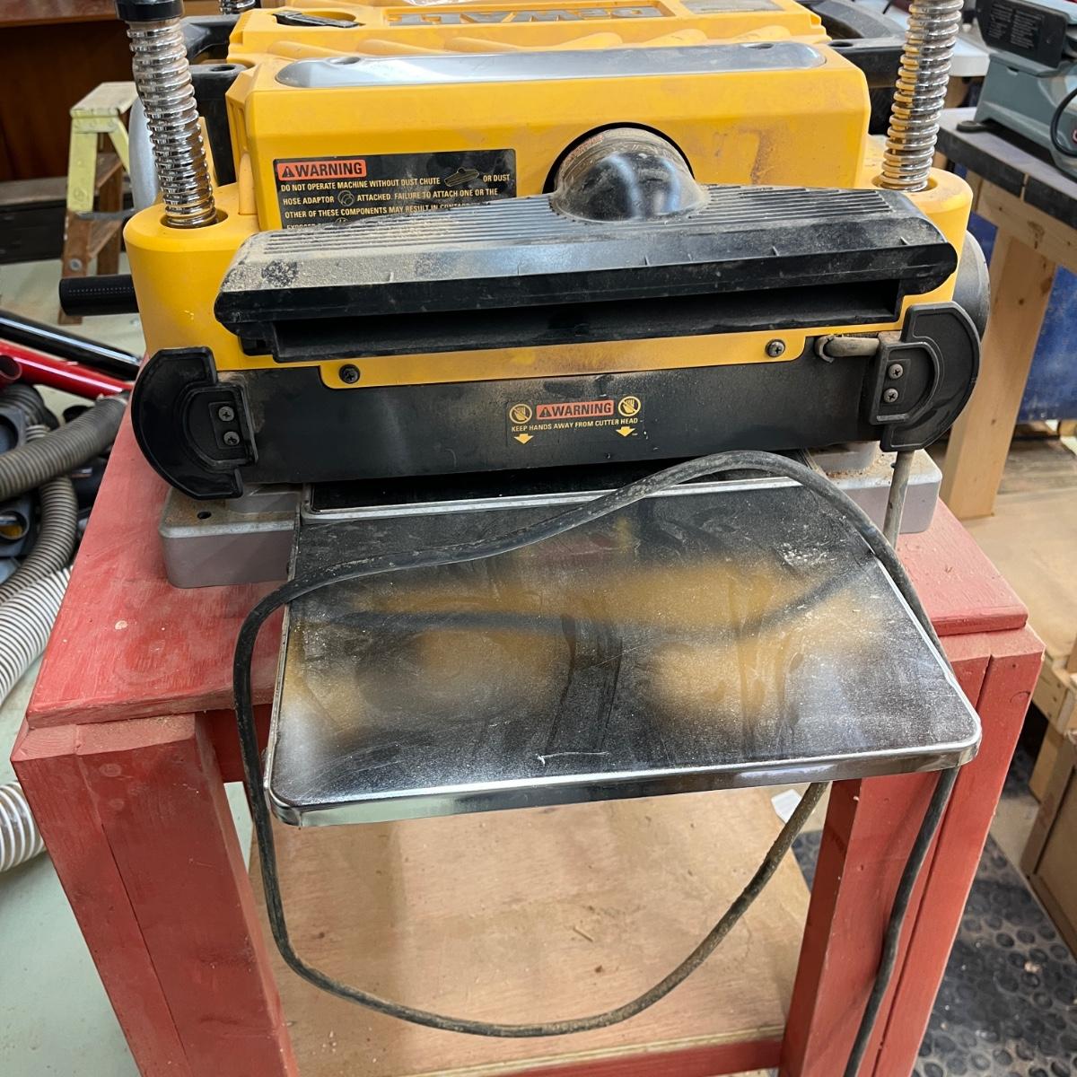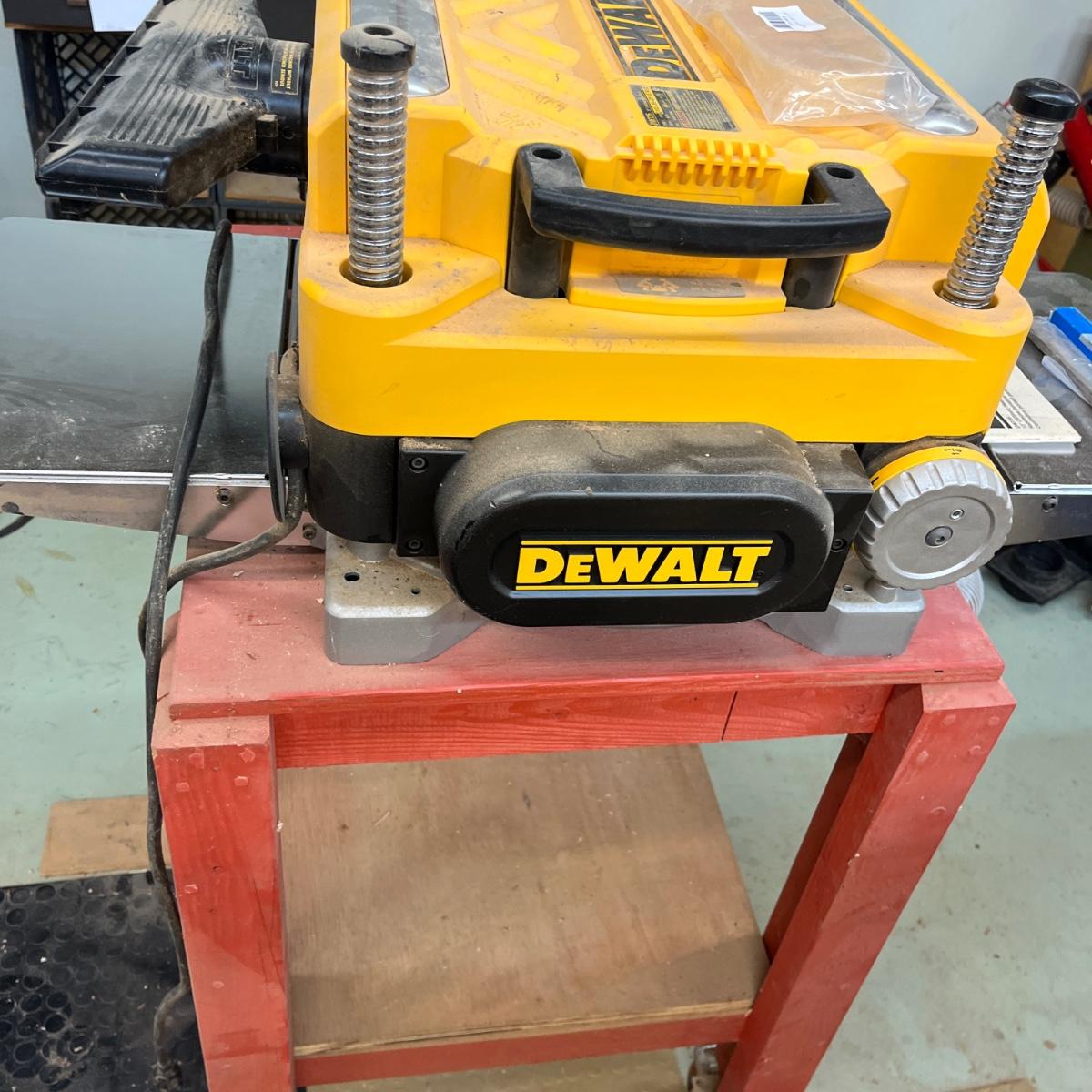 This Dewalt planer is sitting on a rolling wooden stand and includes extra belt and blades. Machine powered on when plugged in. Planer and stand together measure 38” x 26” x 50”H.
