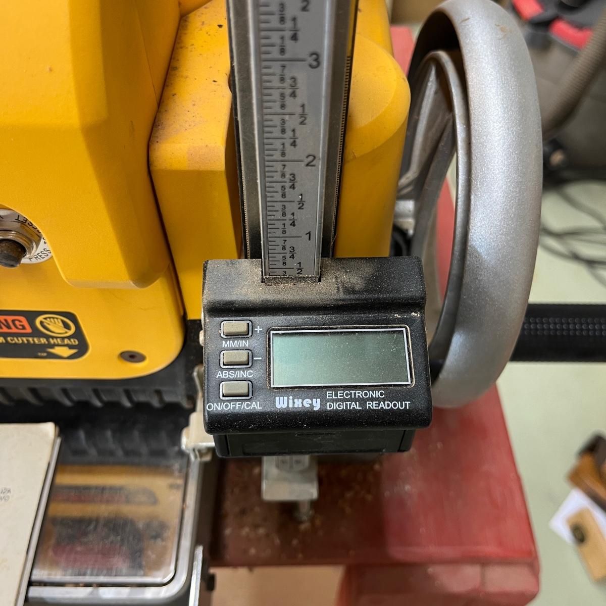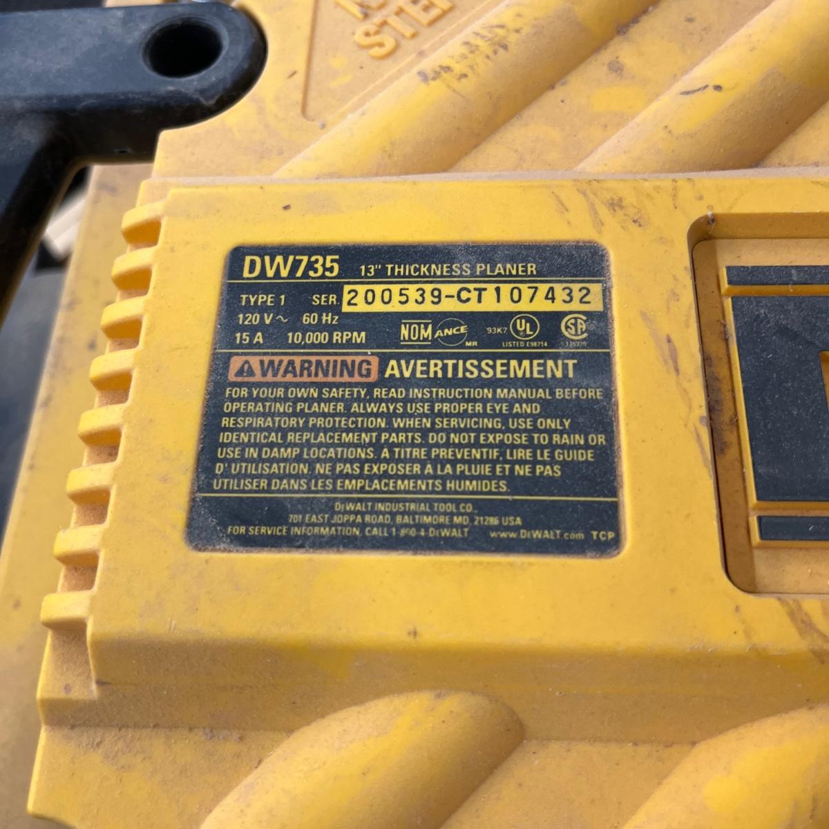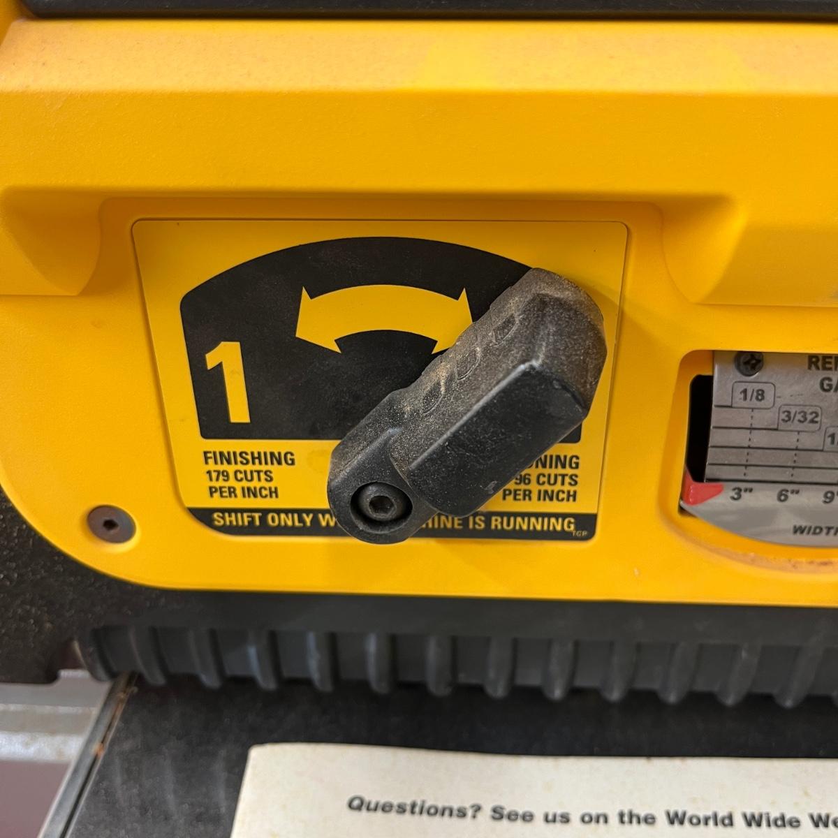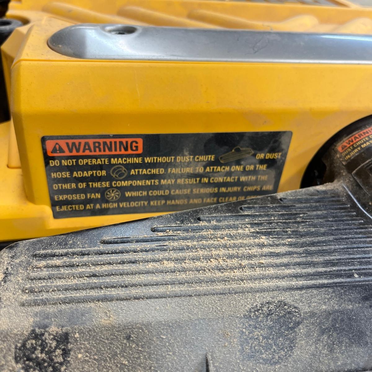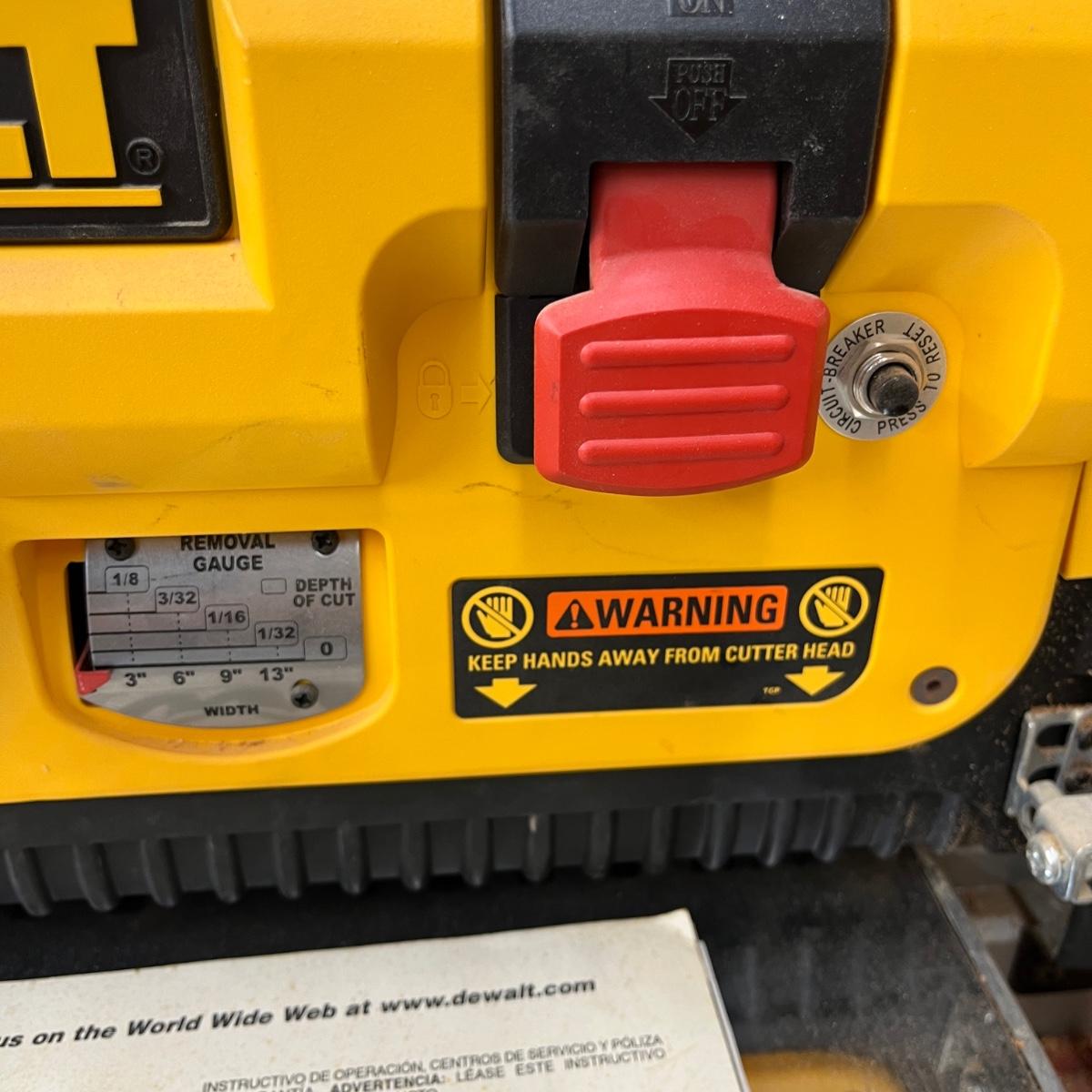 This Dewalt planer is sitting on a rolling wooden stand and includes extra belt and blades. Machine powered on when plugged in. Planer and stand together measure 38” x 26” x 50”H.