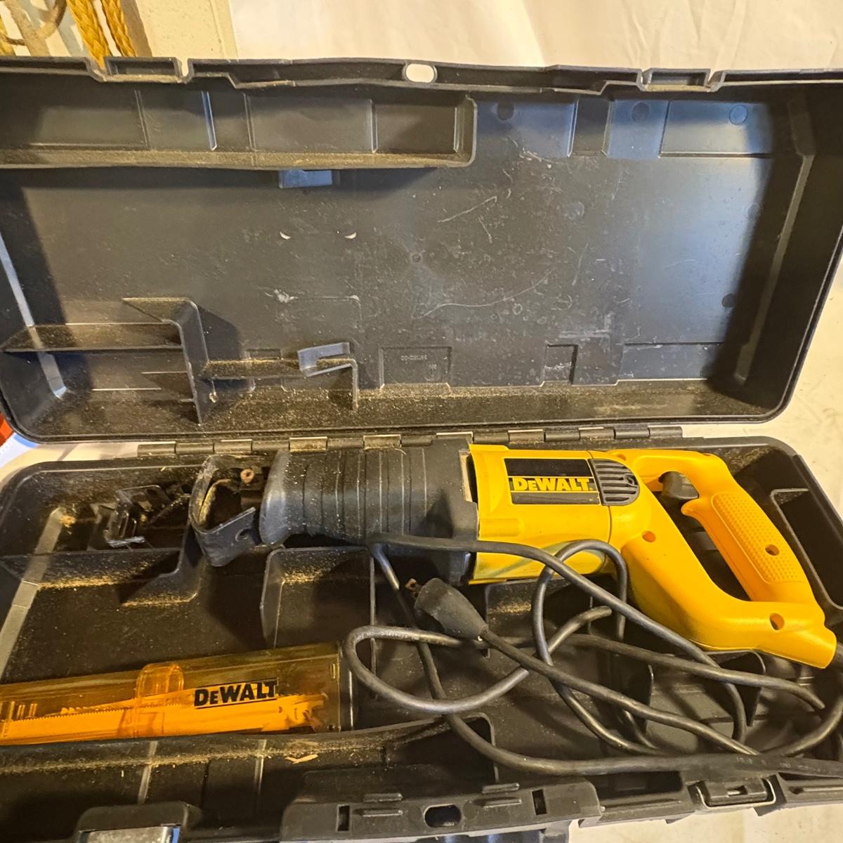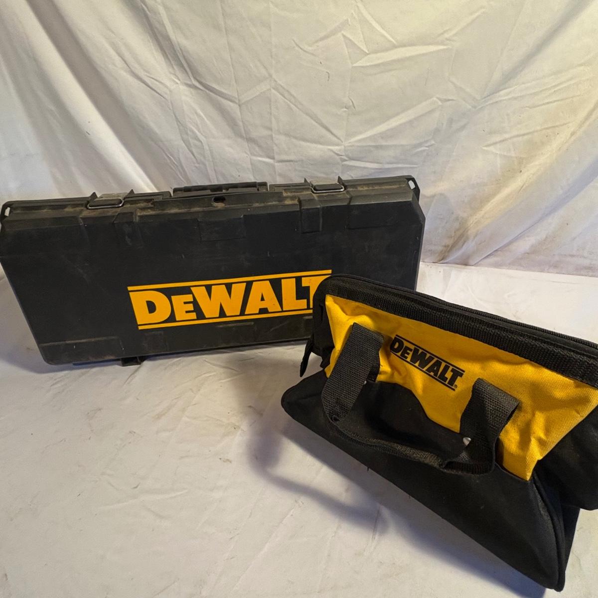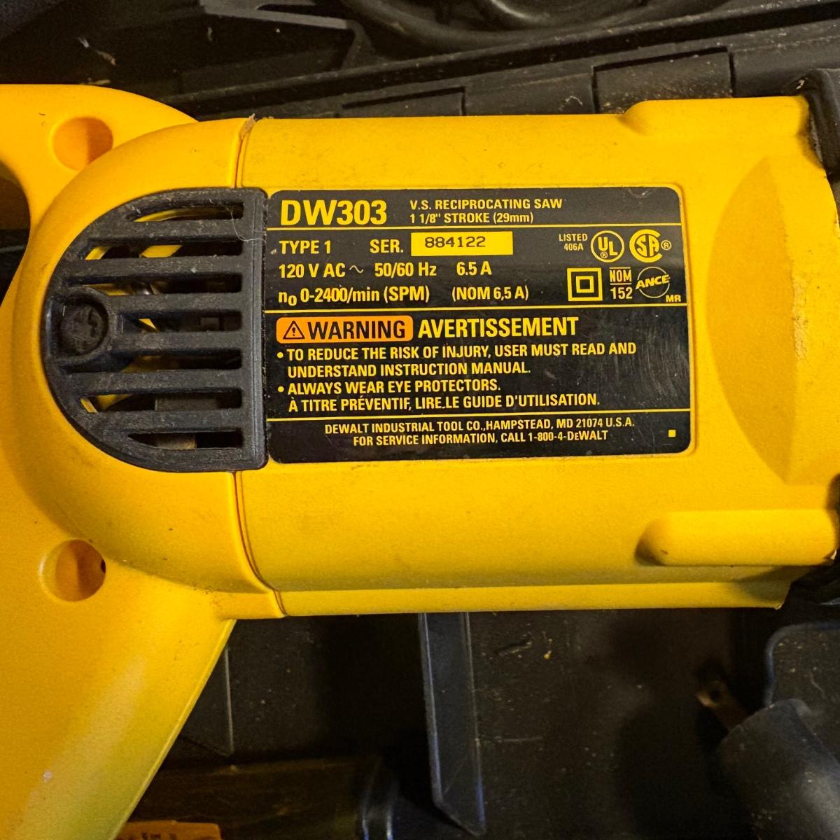 DW303 1 1/8” stroke reciprocating saw in hard case (22.5” x 5” x 11”H) with plastic container of blades. DW106 3/8” VSR drill with canvas bag (13” x 9” x 7.5”H). Both items powered up when plugged in.