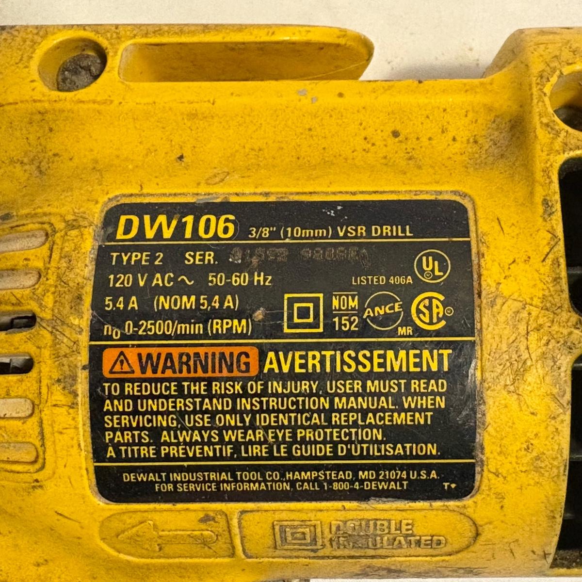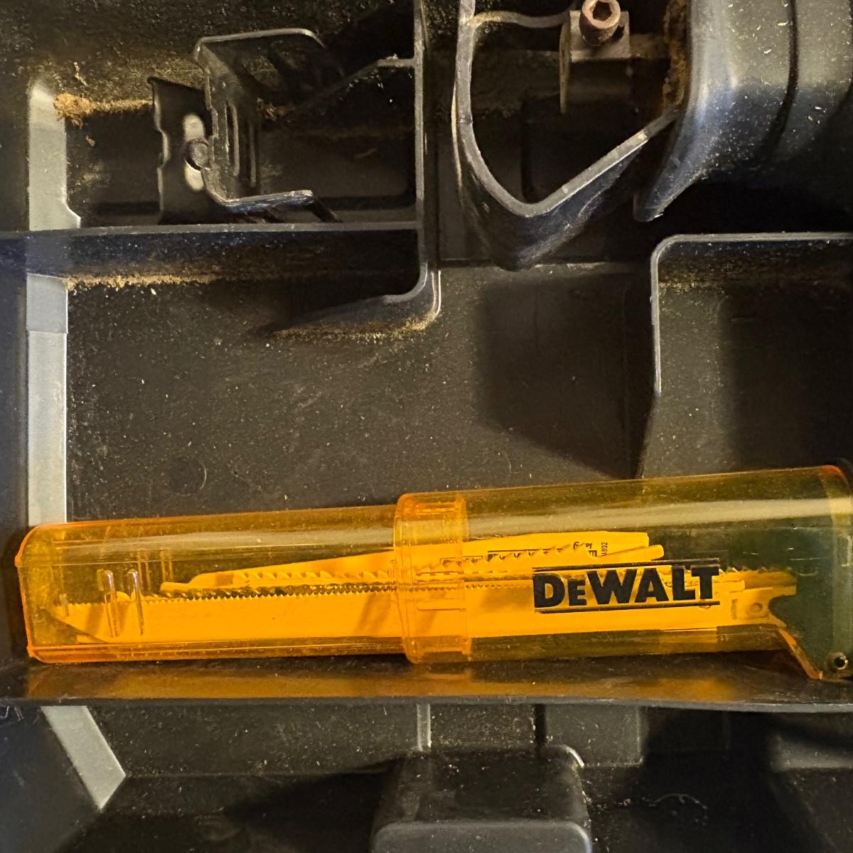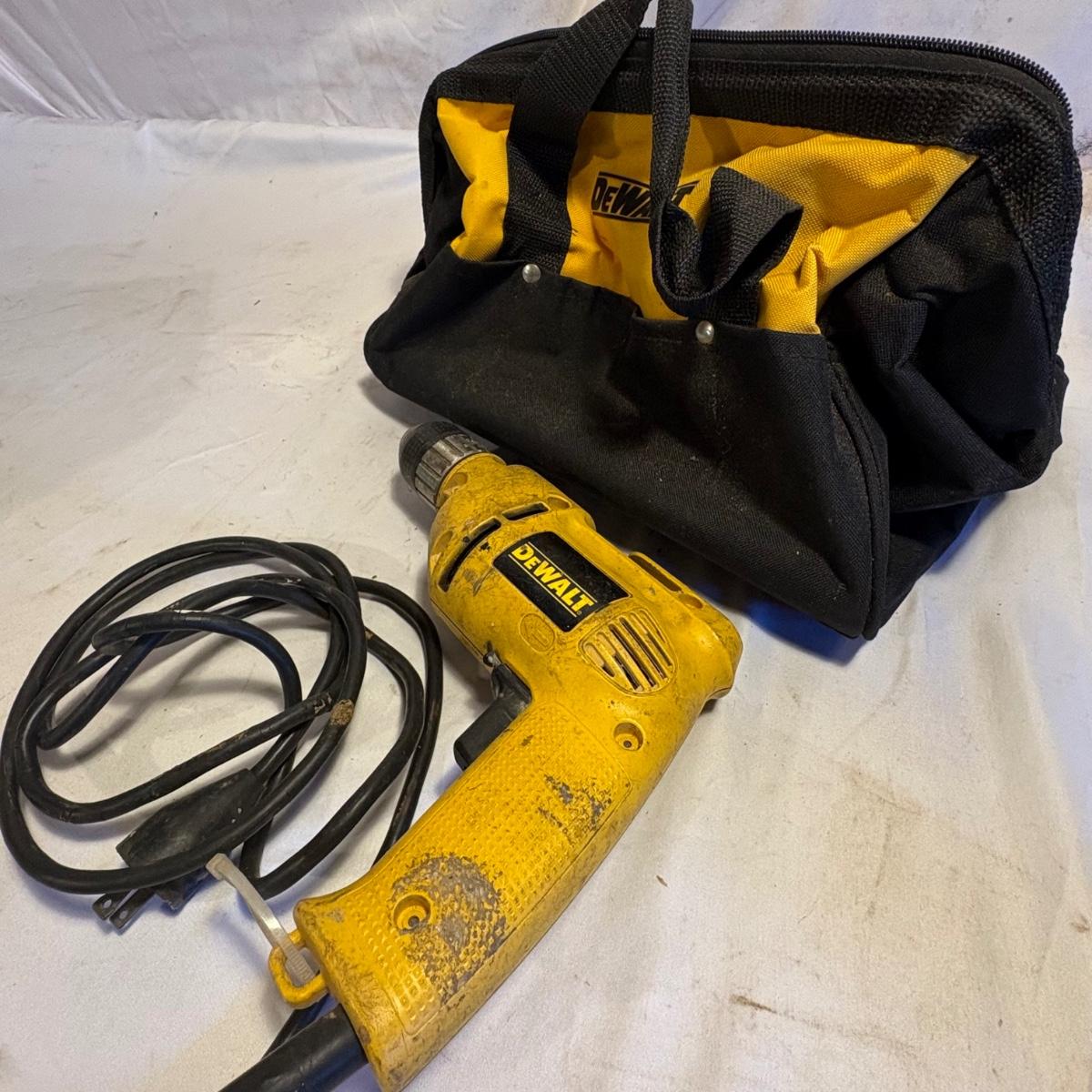 DW303 1 1/8” stroke reciprocating saw in hard case (22.5” x 5” x 11”H) with plastic container of blades. DW106 3/8” VSR drill with canvas bag (13” x 9” x 7.5”H). Both items powered up when plugged in.