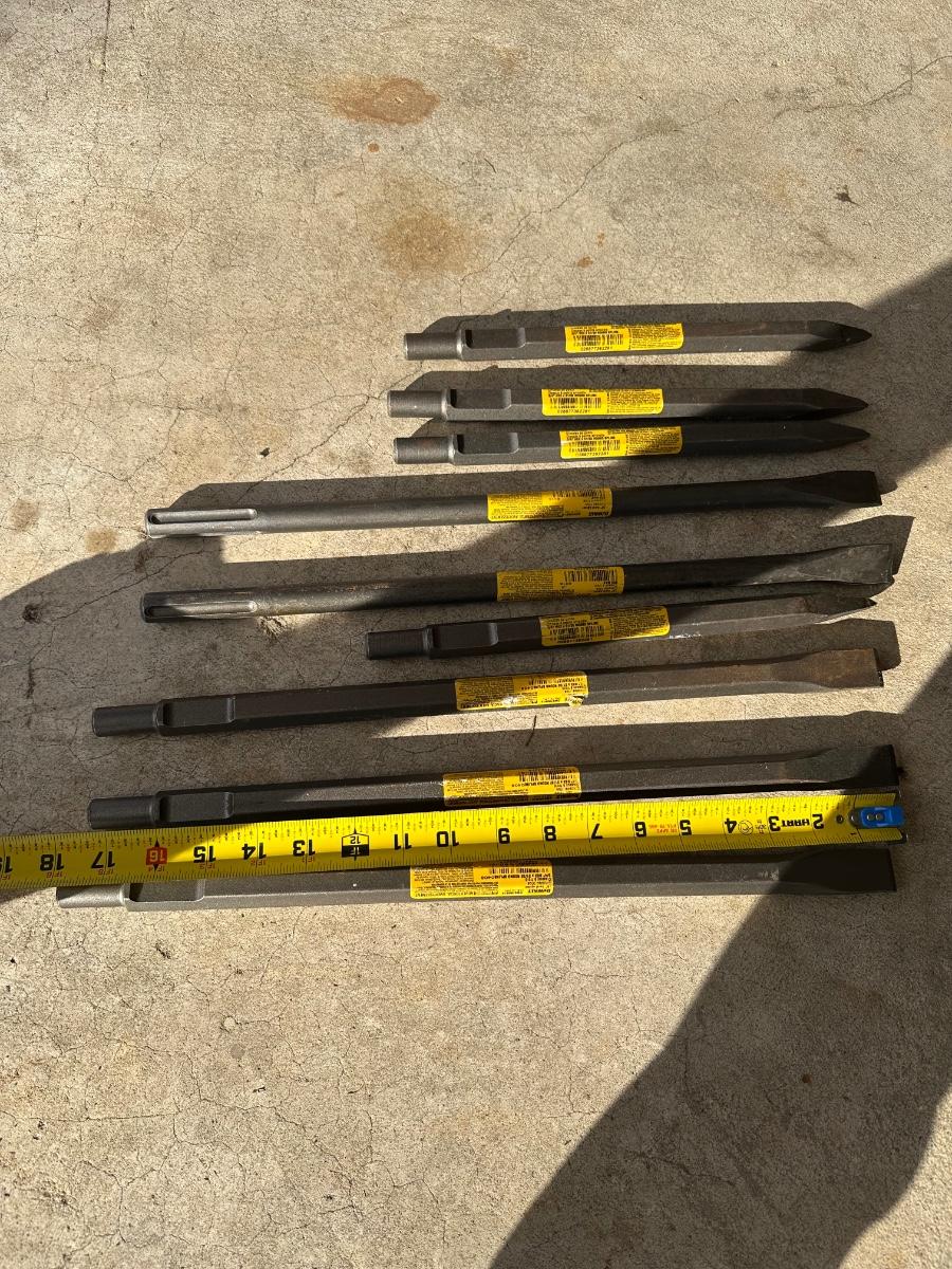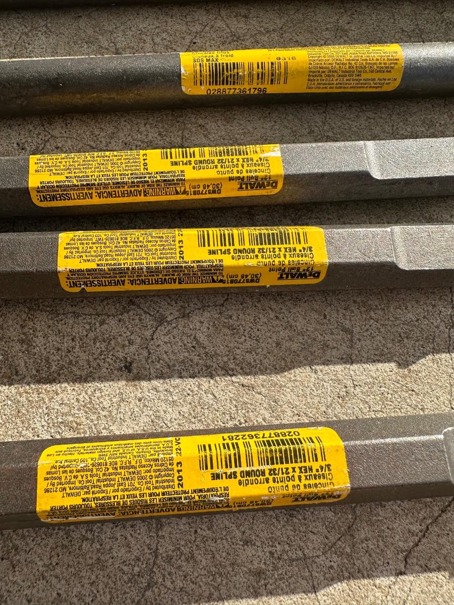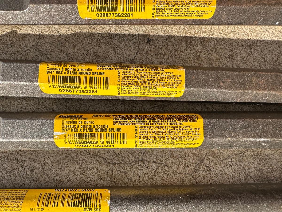 Large mixed DeWalt demolition chisel lot including pointed and flat chisels for heavy concrete and masonry work. Assorted lengths and tip styles. Industrial-grade steel with SDS-Max and 3/4″ hex shanks (as labeled). Ideal for jackhammers, rotary hammers, or demolition jobs.