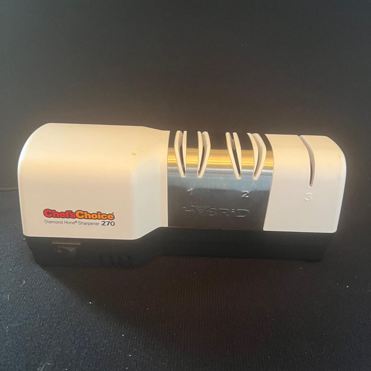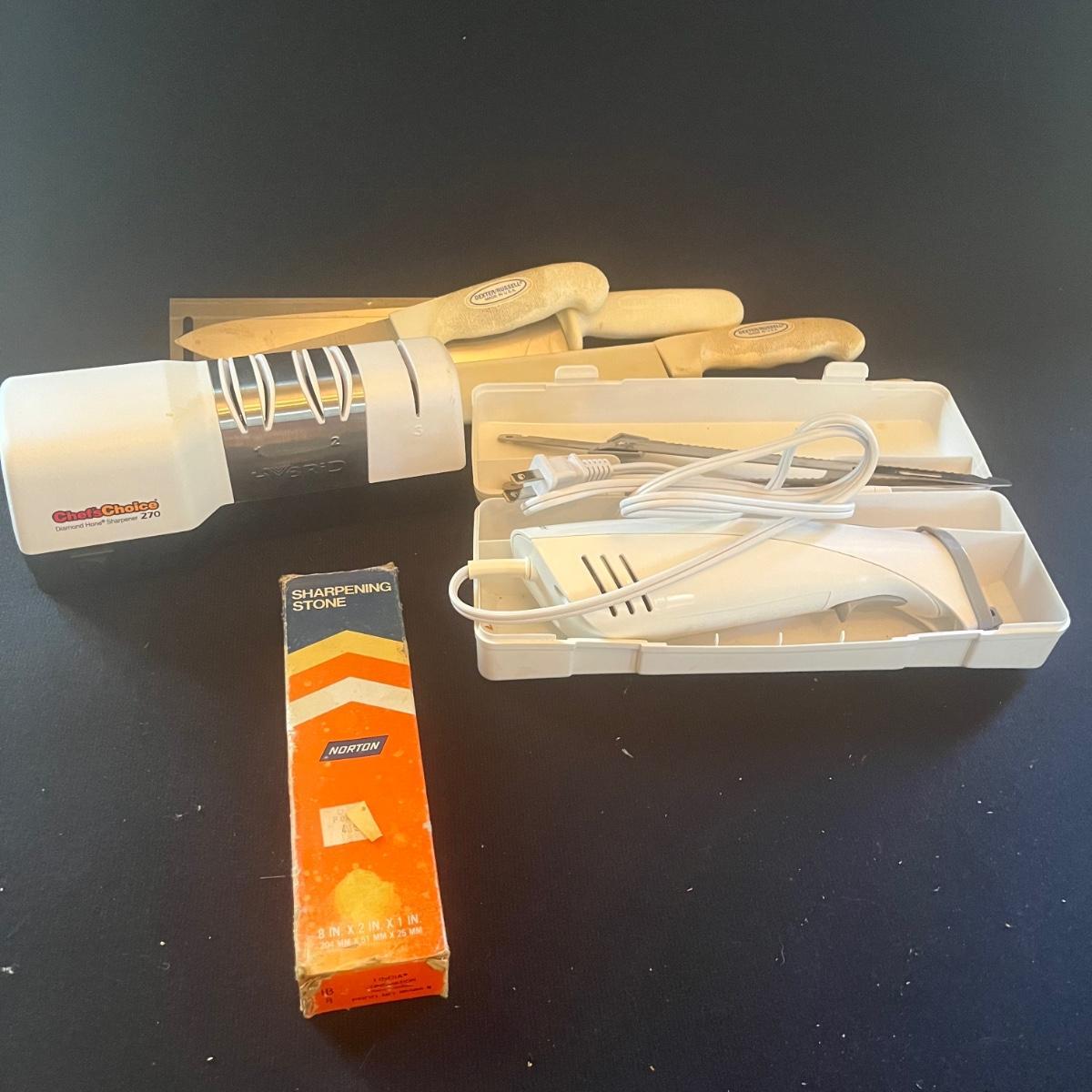 Lot includes three Dexter Russell knives, Hamilton Beach electric knife, Chefs Choice Diamond Hone sharpener and a sharpening stone. Sharpener and knife both powered on when tested. Longest Dexter Russell knife measures 15” long.