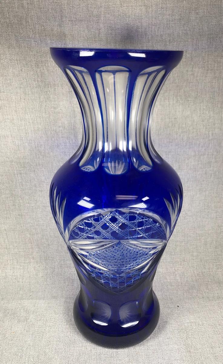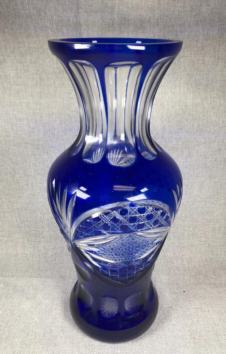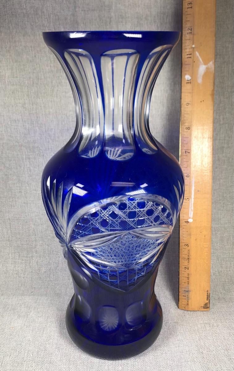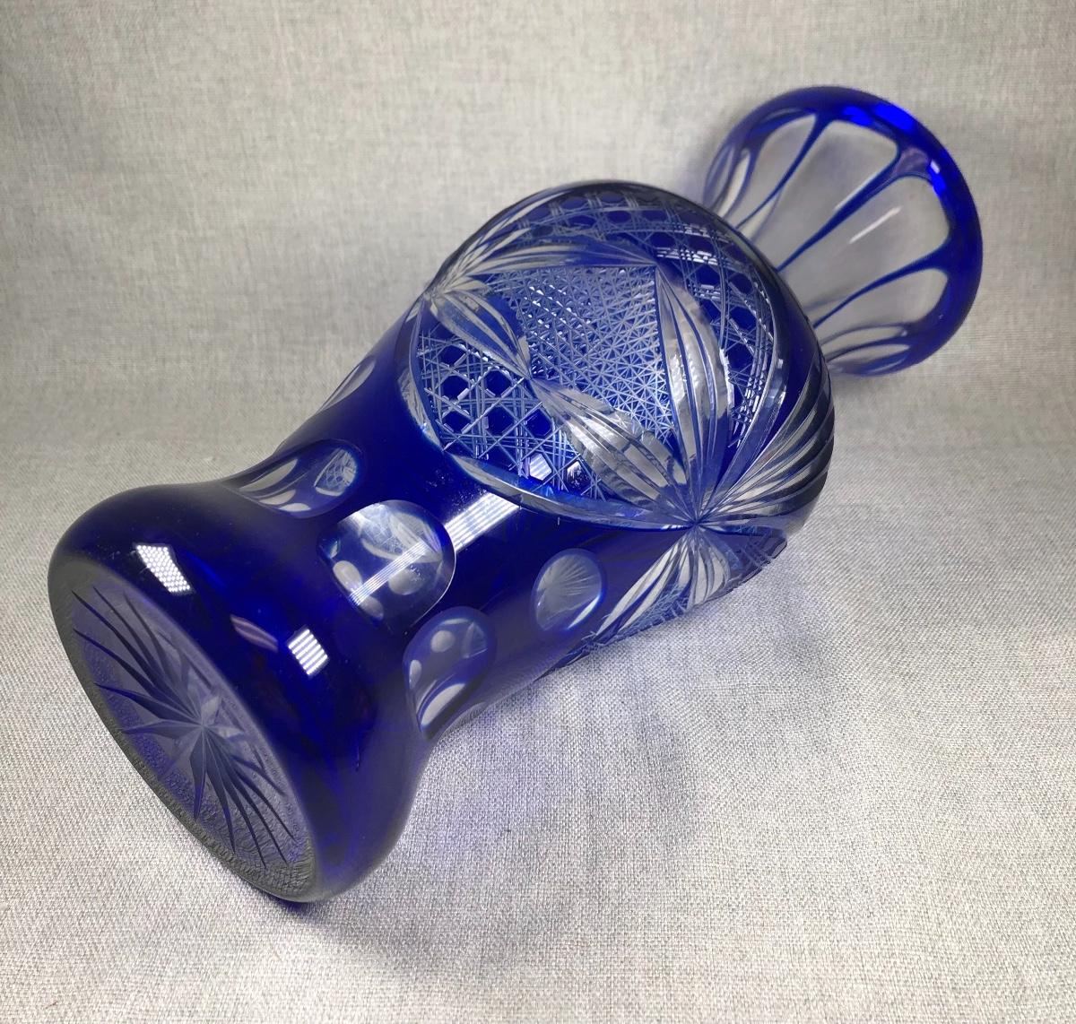 Cobalt Blue Cut to Clear Crystal Glass Flower Vase