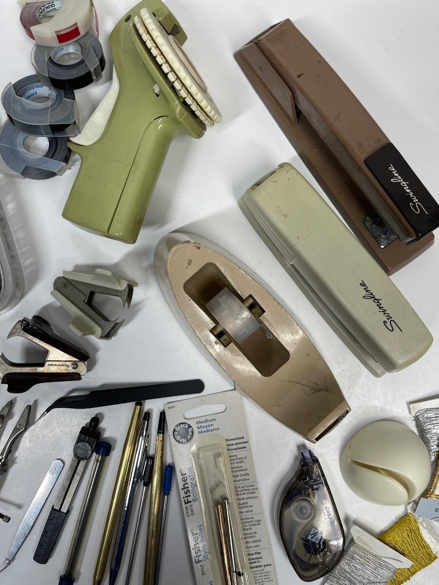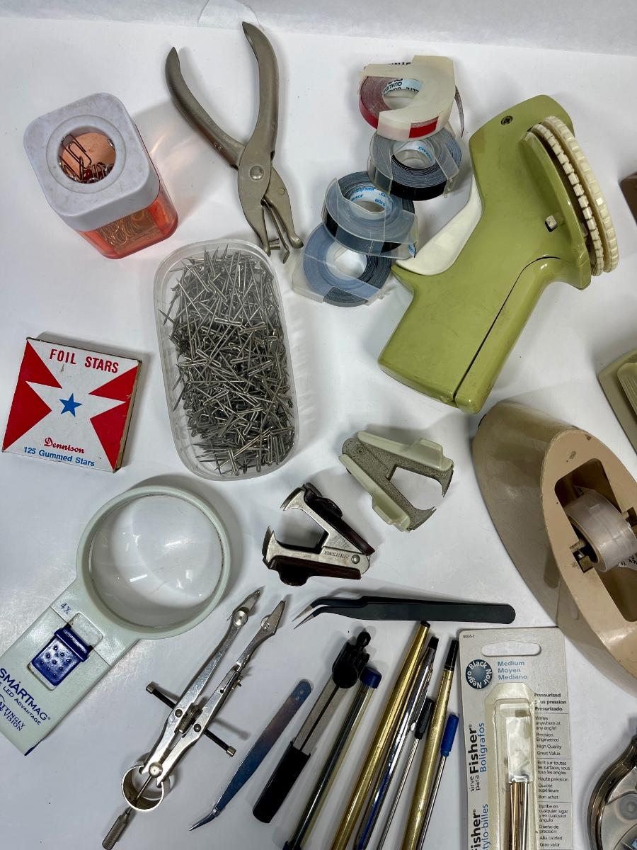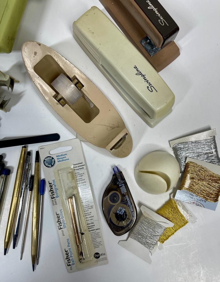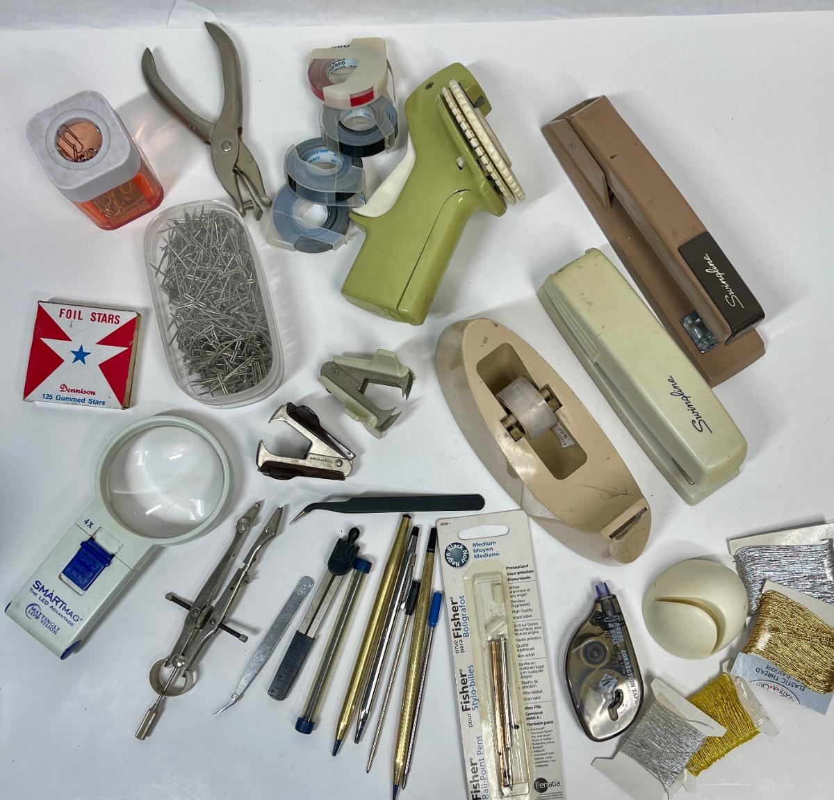 See photos for what's included: pens, pen refills, white-out tape dispensers, staplers, staple pullers. drafting compass, paper clip dispenser, and more.
