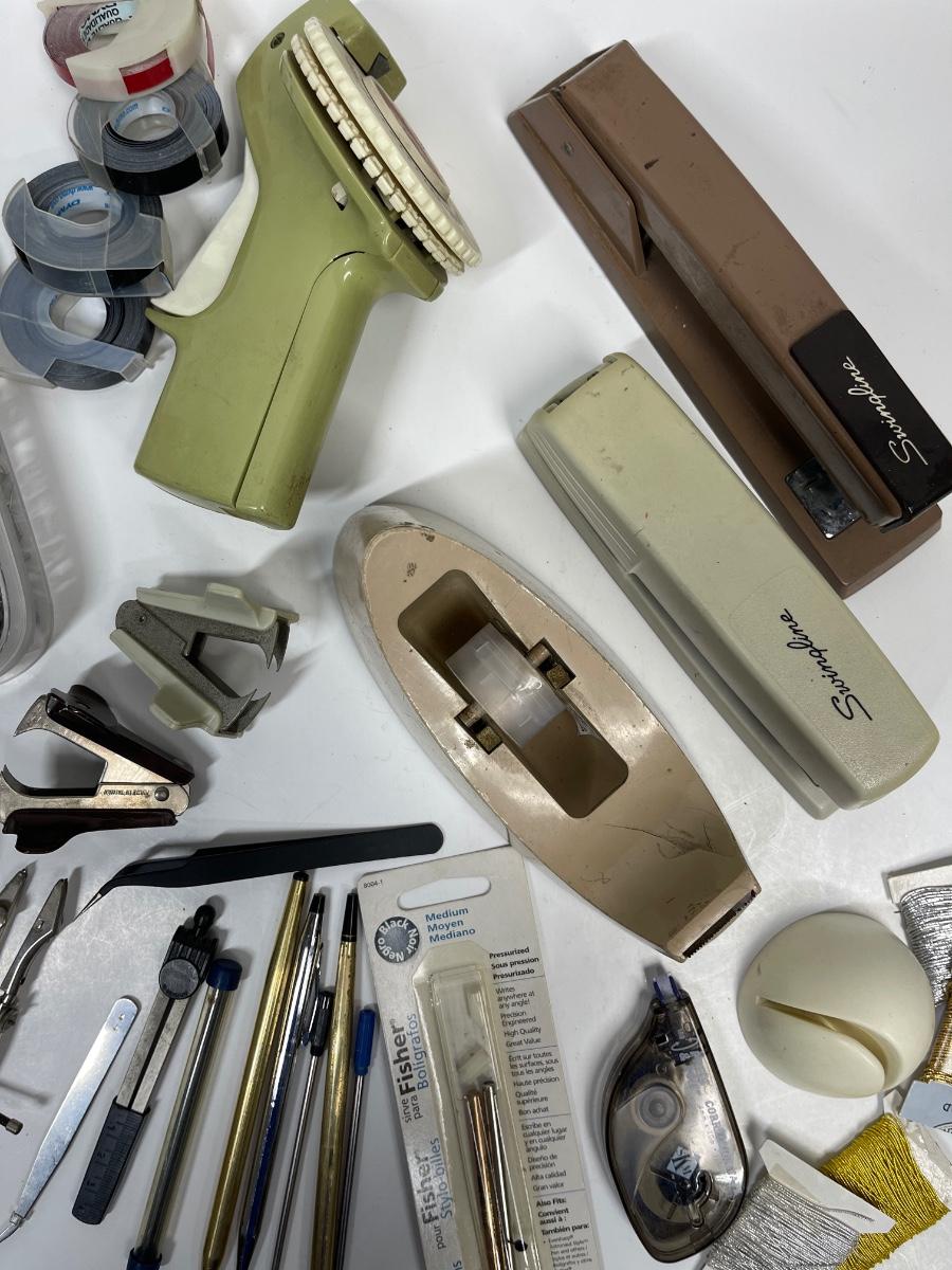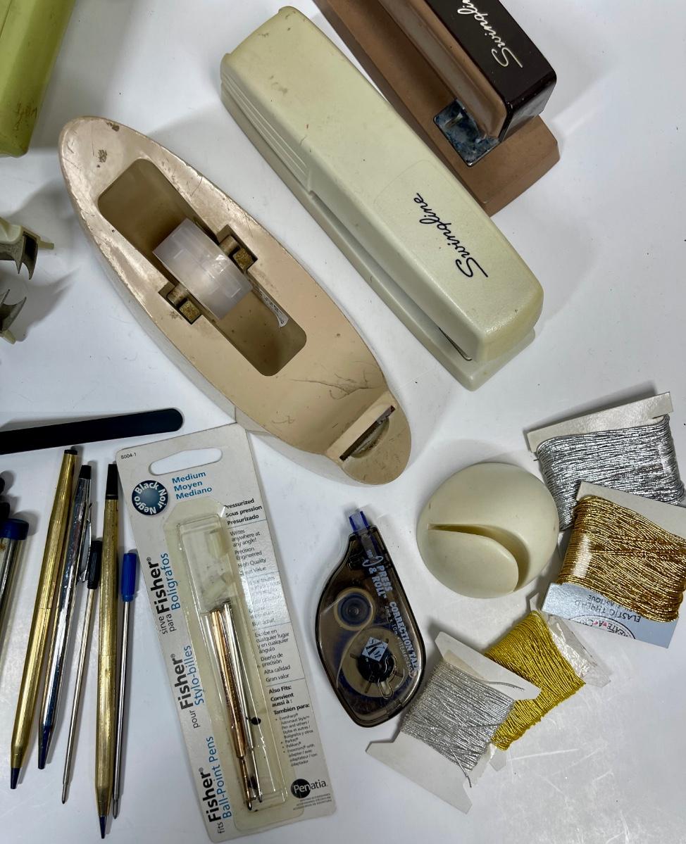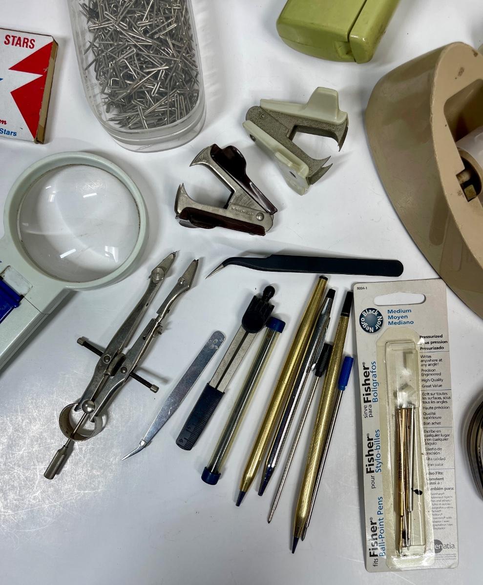 See photos for what's included: pens, pen refills, white-out tape dispensers, staplers, staple pullers. drafting compass, paper clip dispenser, and more.