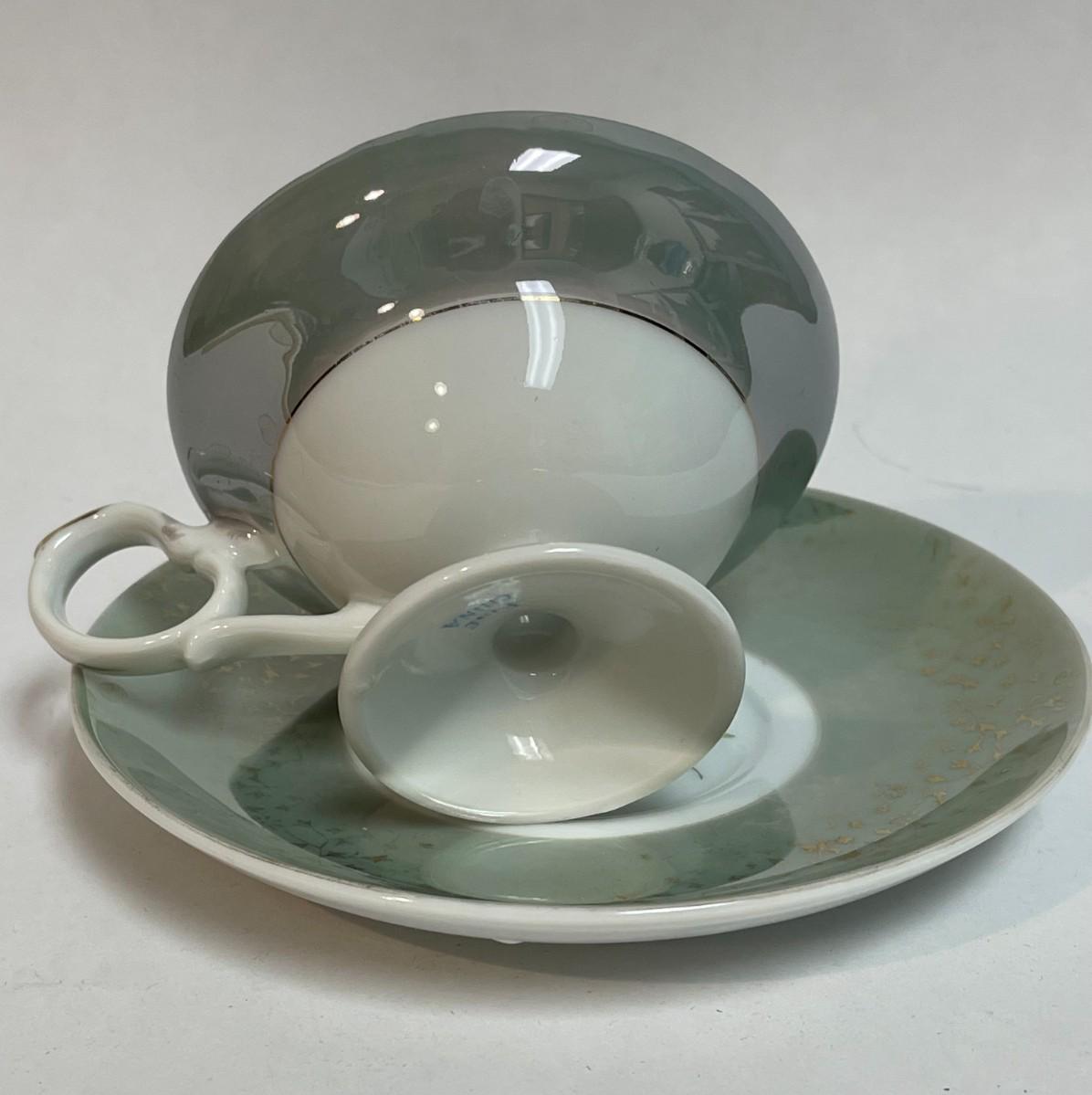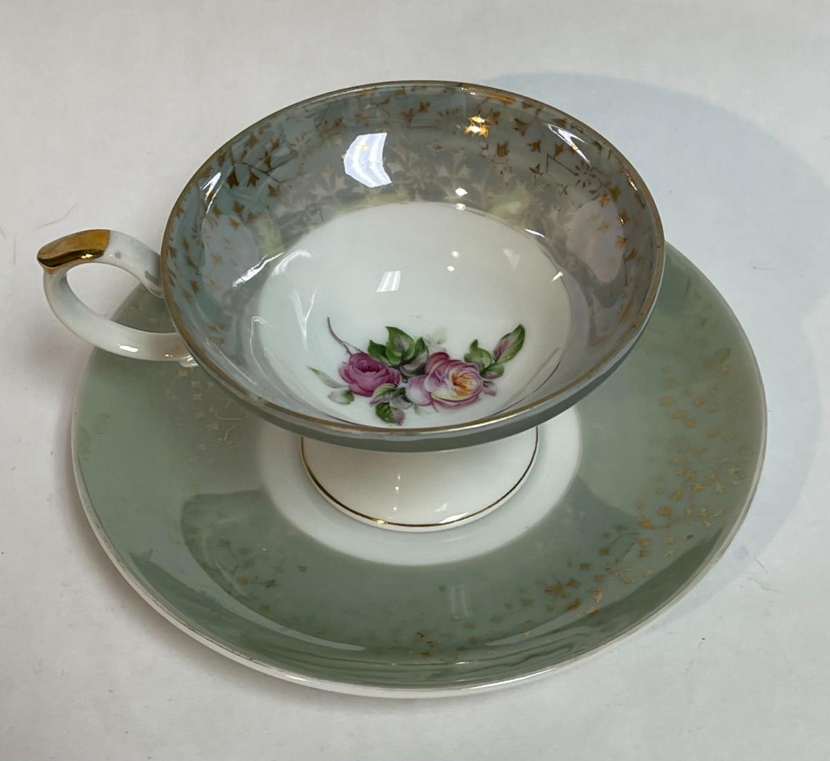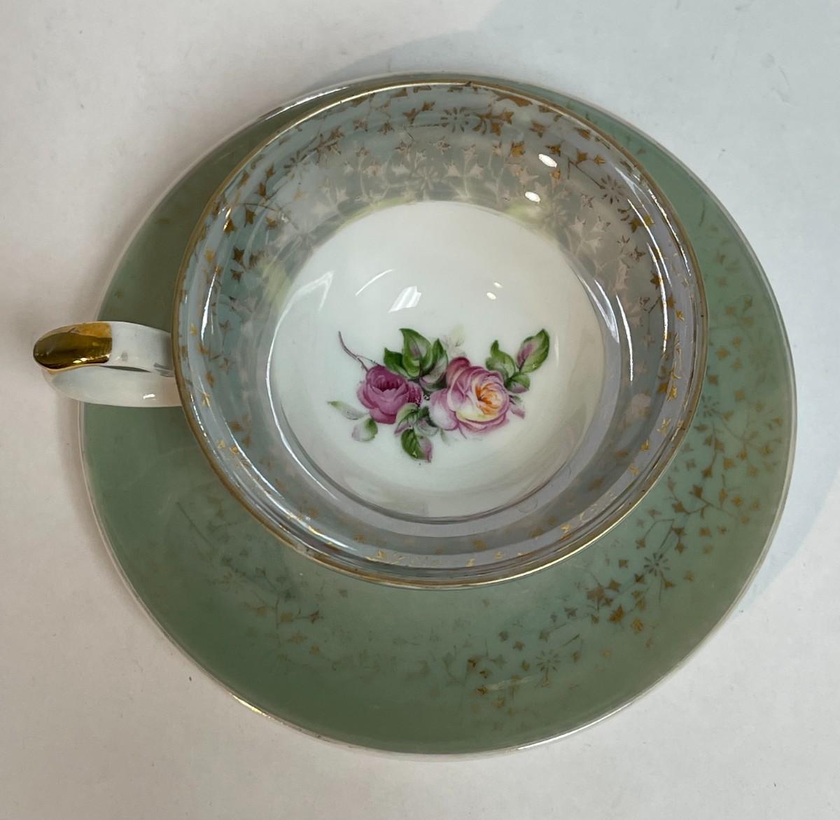 Fine China Teacup & Saucer set sage green border with pink roses