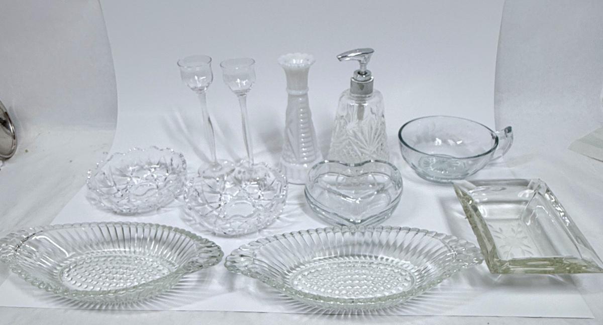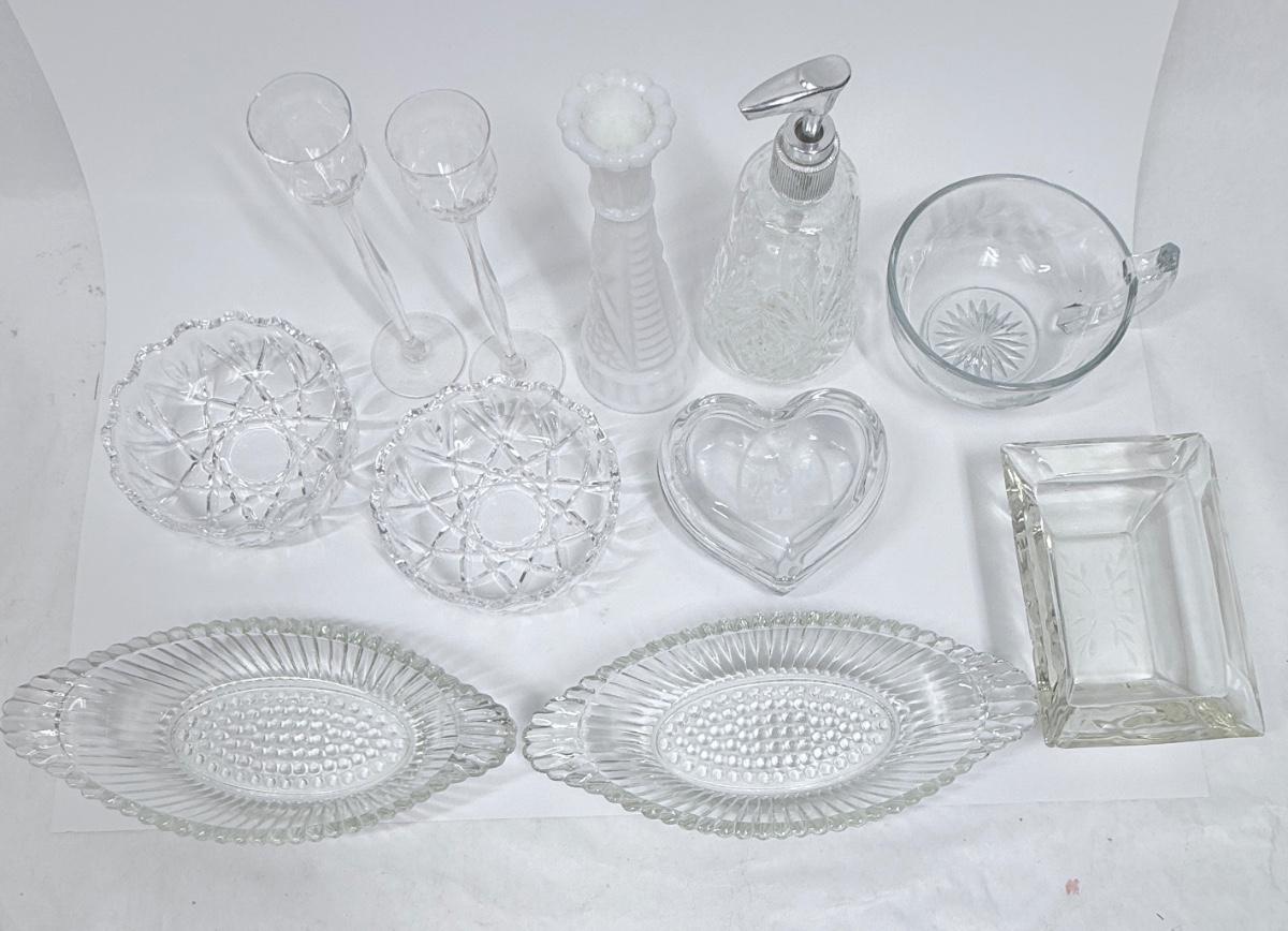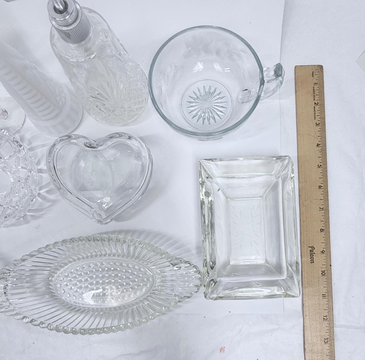Vintage Glass Lot - dishes, vase, soap dispenser, Trinket Box, Cordials, Ashtray Dessert Bowls