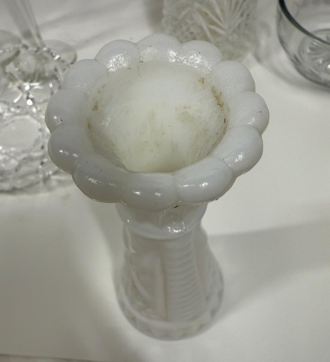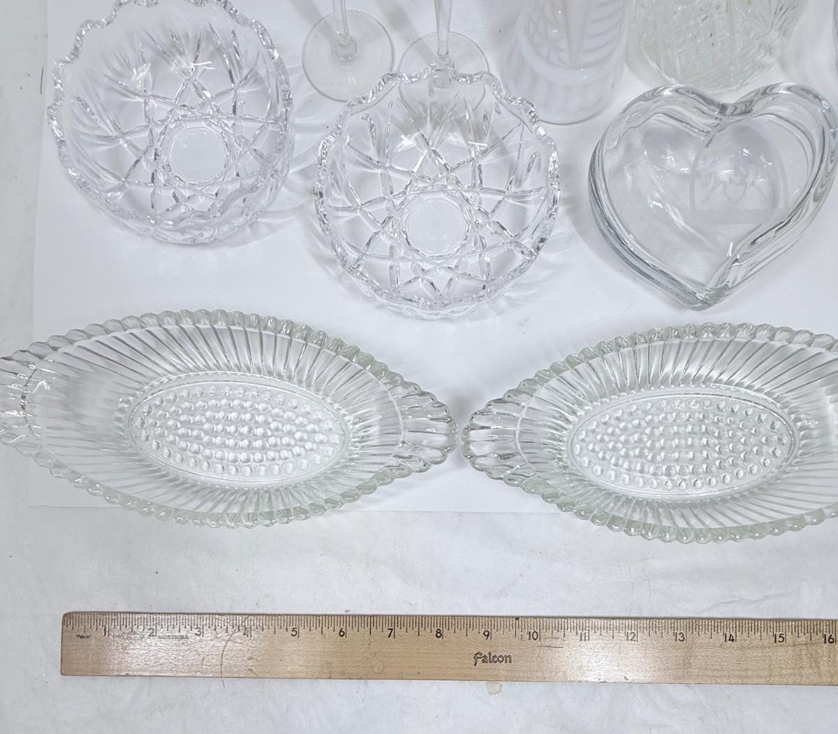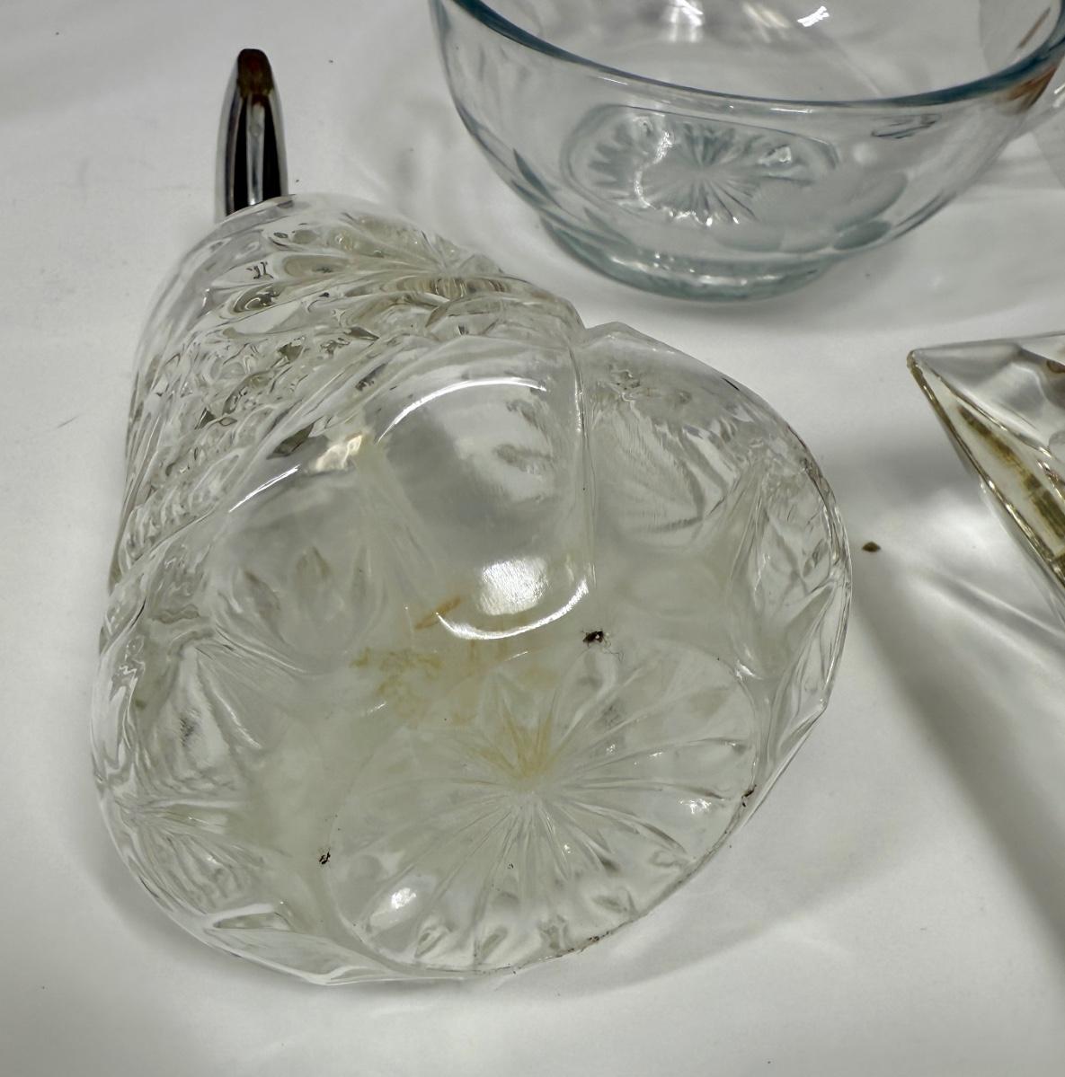 Vintage Glass Lot - dishes, vase, soap dispenser, Trinket Box, Cordials, Ashtray Dessert Bowls