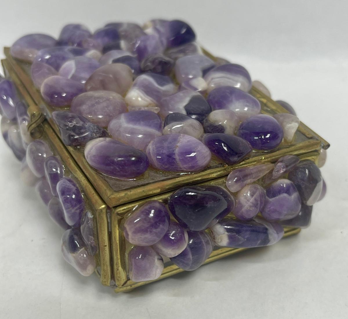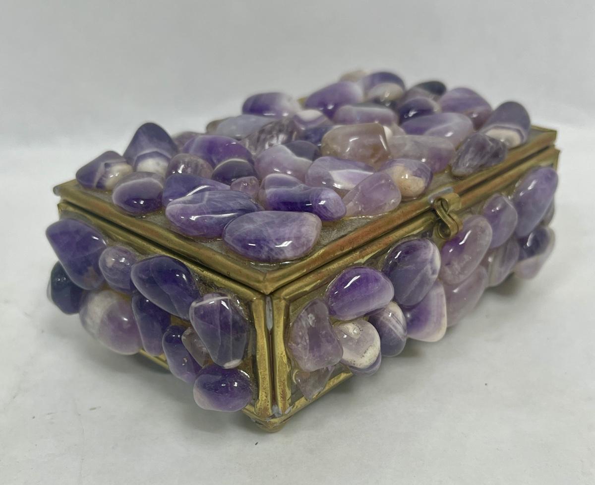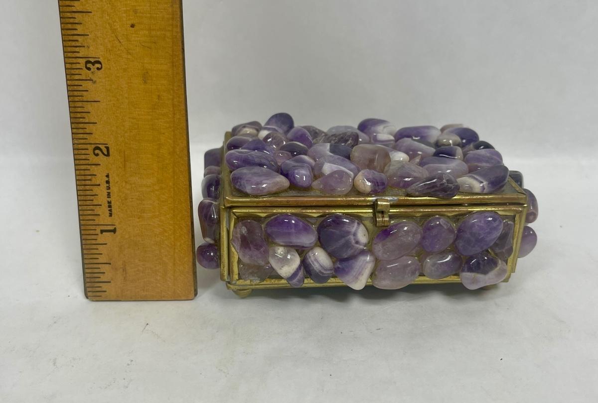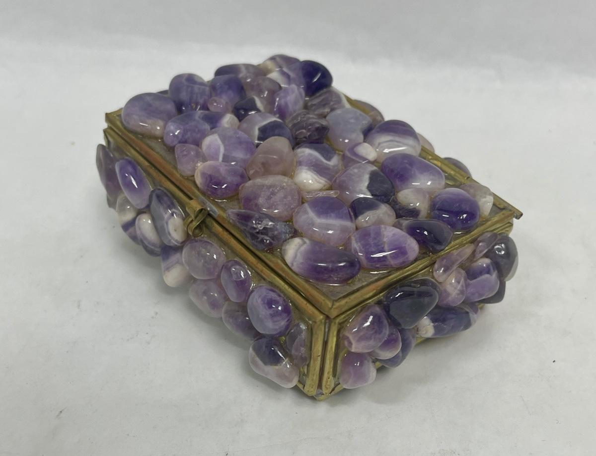 Purple stones cover the outside of the small trinket box. Mirrors inside the box. Good condition except for 1 missing foot on the bottom of the box (see photos).