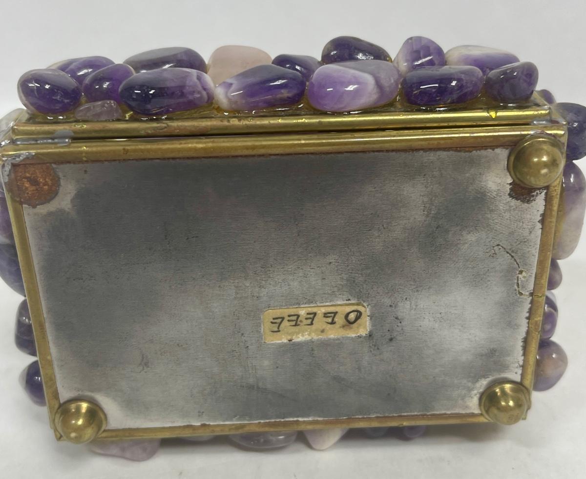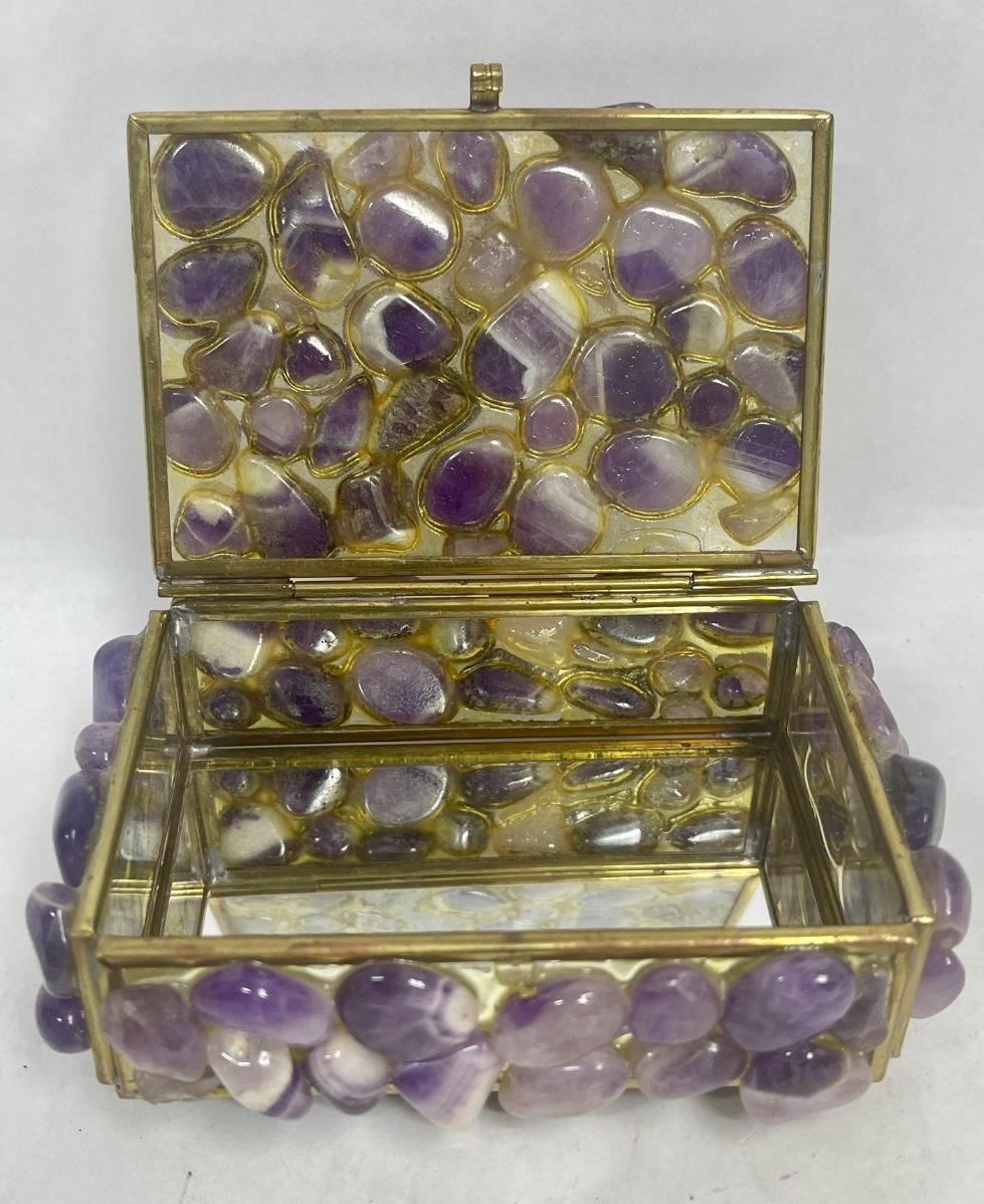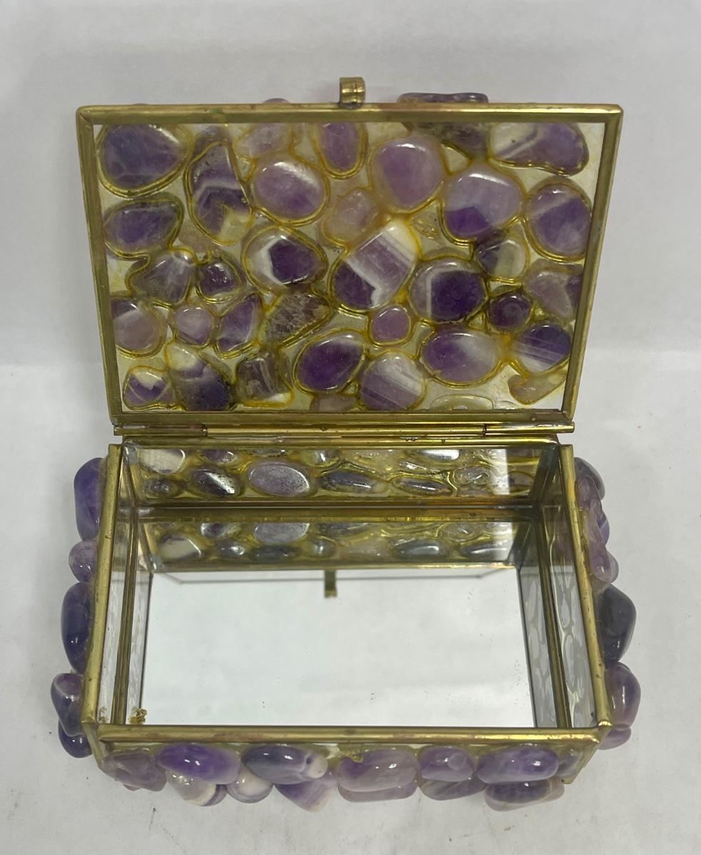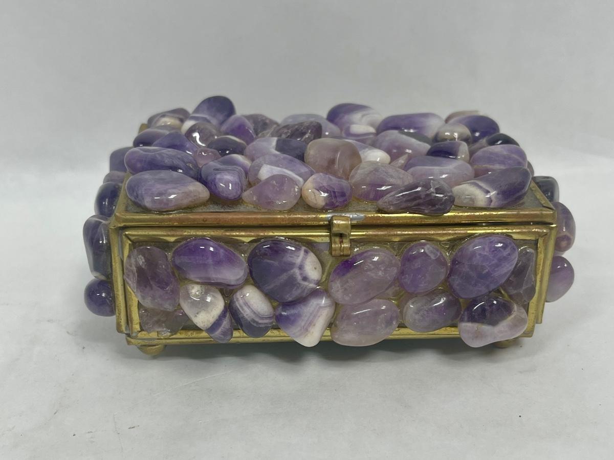 Purple stones cover the outside of the small trinket box. Mirrors inside the box. Good condition except for 1 missing foot on the bottom of the box (see photos).