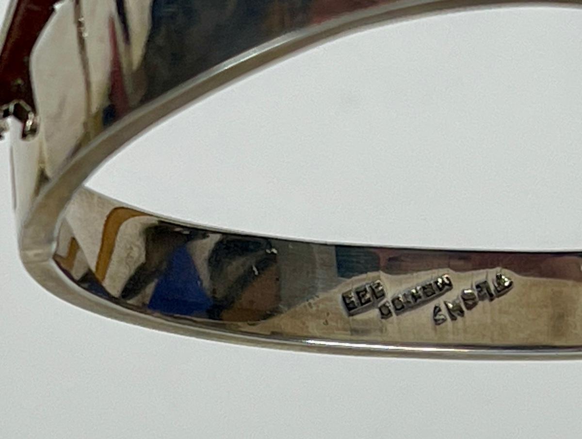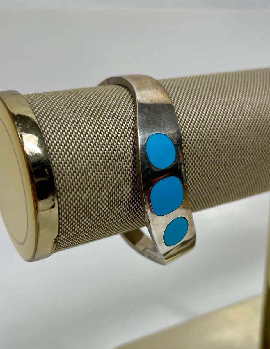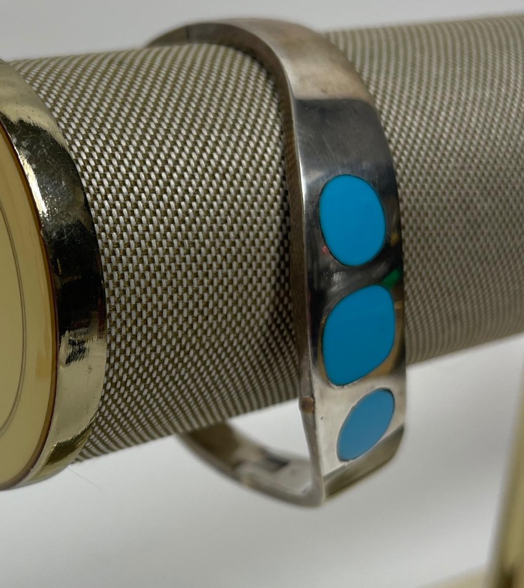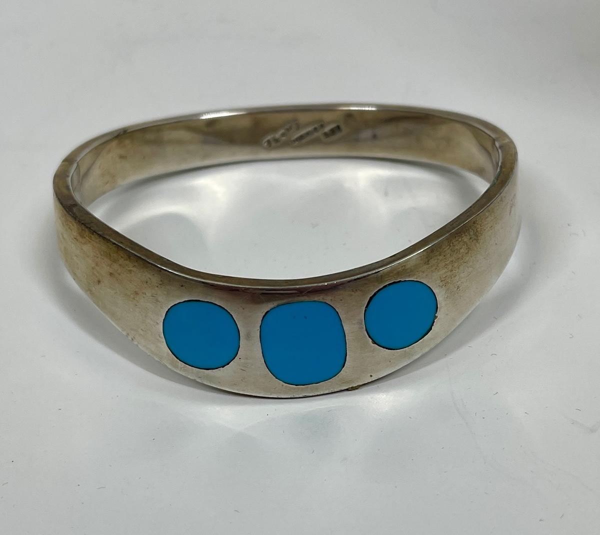 Vintage Taxco Mexico 925 Sterling Silver Turquoise Inlay Hinged Bracelet