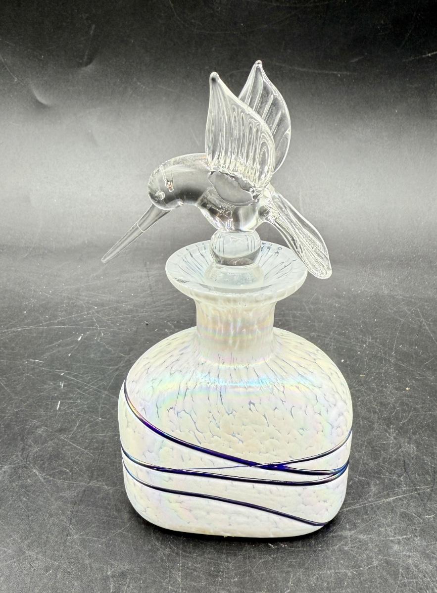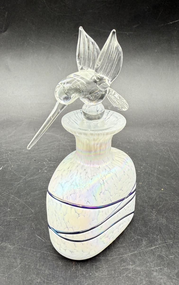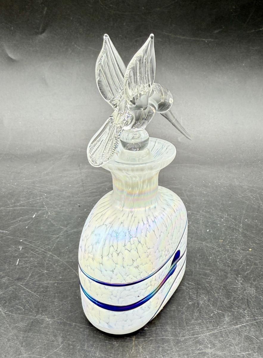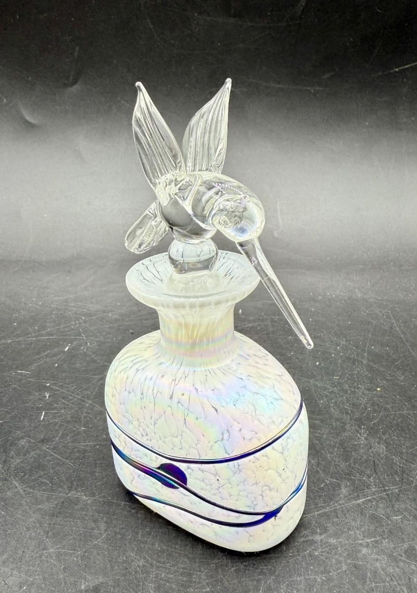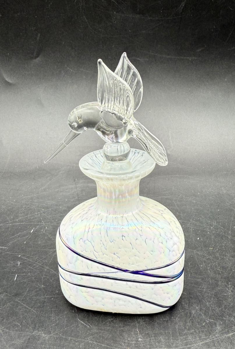 Vintage Murano Blown Glass Perfume Bottle With Hummingbird Stopper Iridescent White & Blue