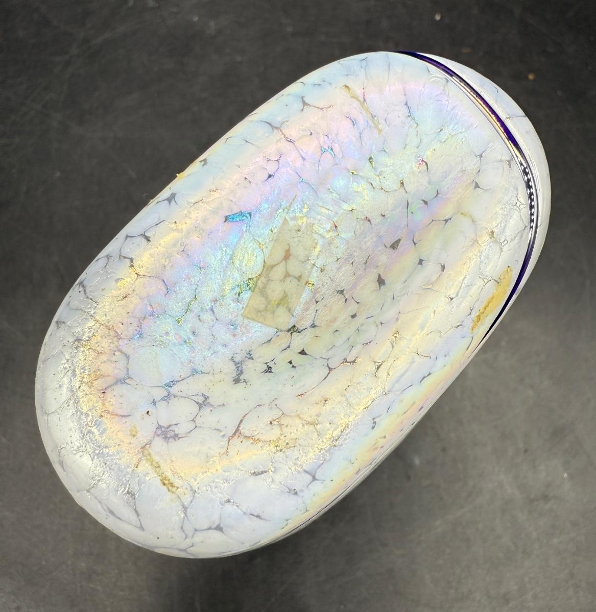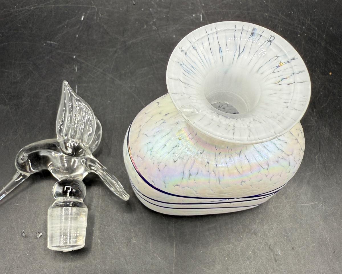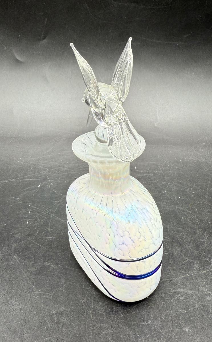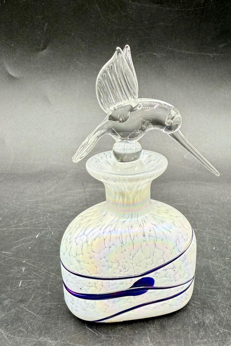 Vintage Murano Blown Glass Perfume Bottle With Hummingbird Stopper Iridescent White & Blue