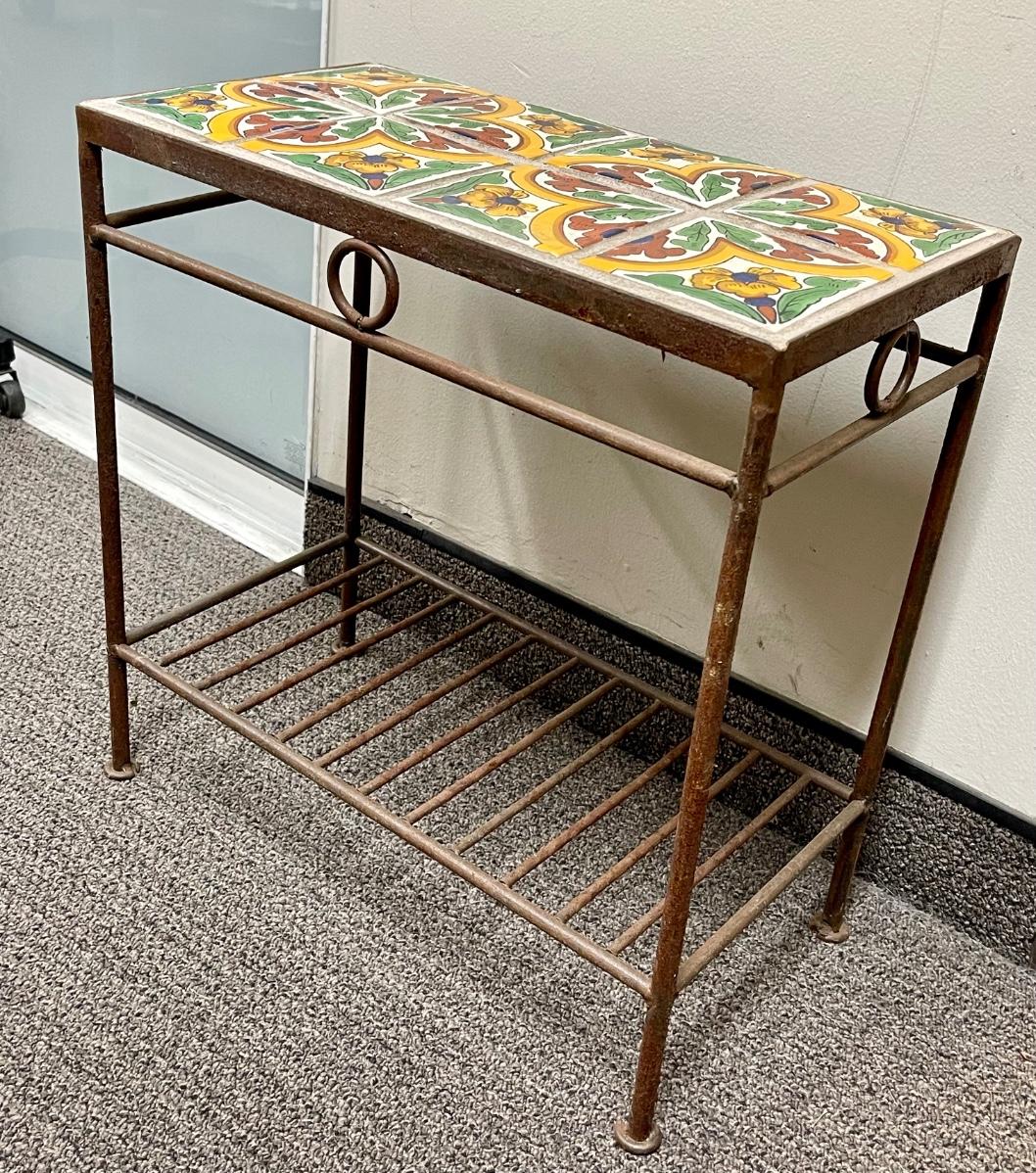 Rust Patina due to being kept on outdoor patio, but otherwise like new. Tabletop is approx. 10" x 18", table is approx. 19" tall.