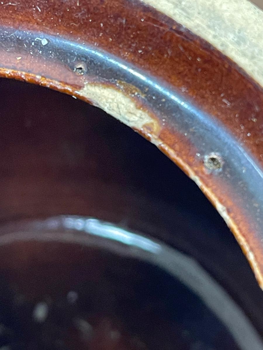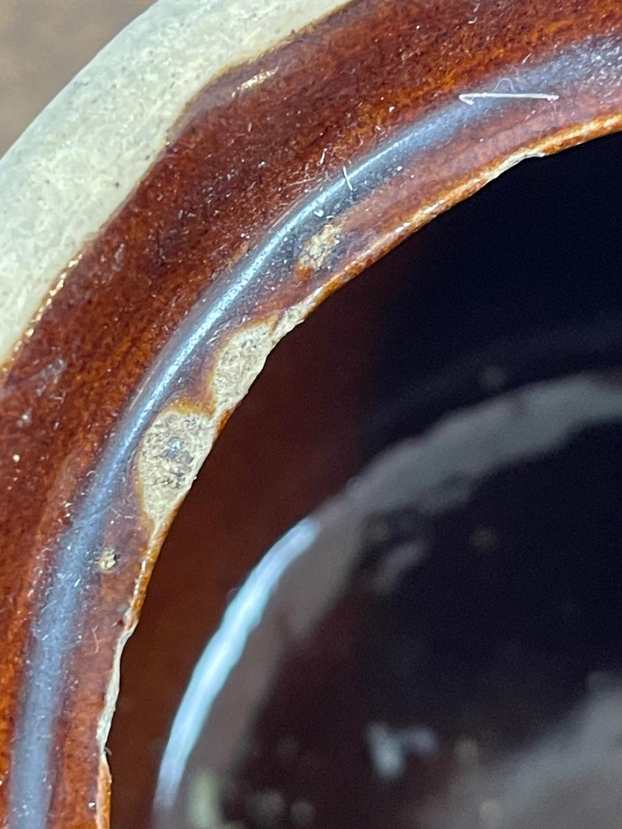 Vintage Stoneware Pottery Bean Pot with Lid and Single Handle Crown #2 Robinson Ransbottom. In good vintage condition. Some minor chipping along inside edge. Displays well.