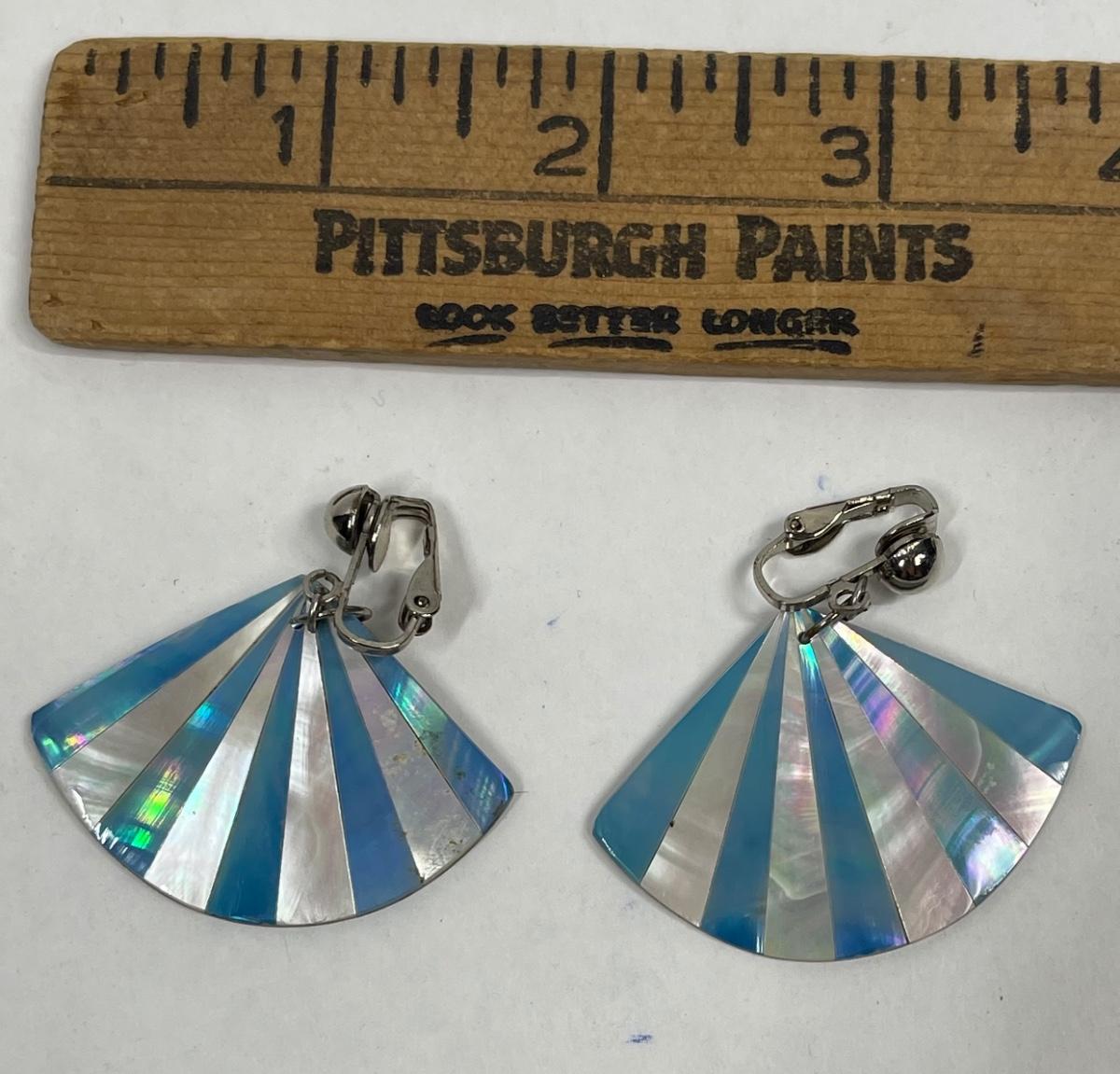 Blue and silver-tone fan-shaped pattern. Good vintage condition.