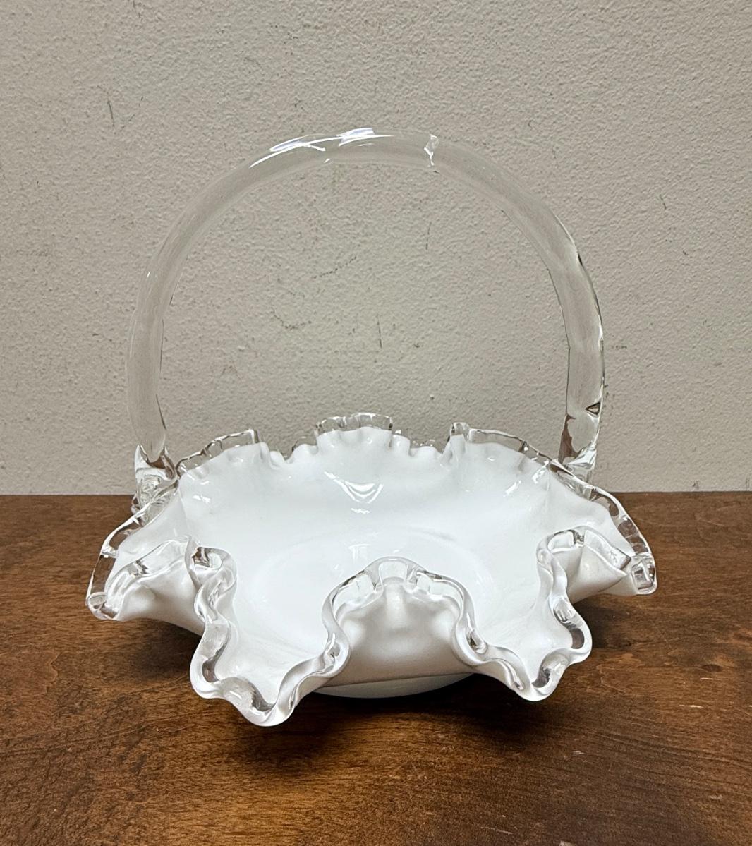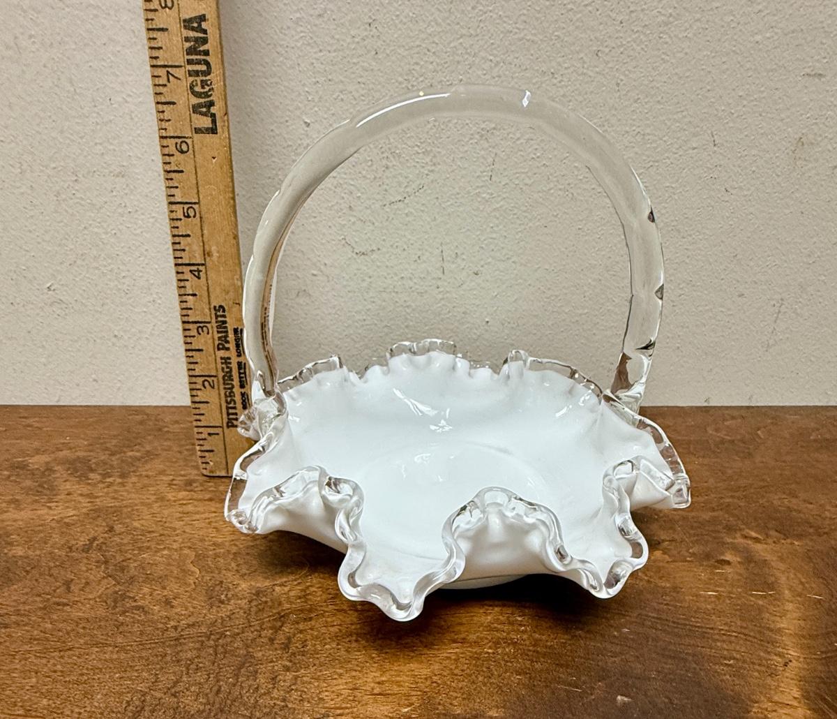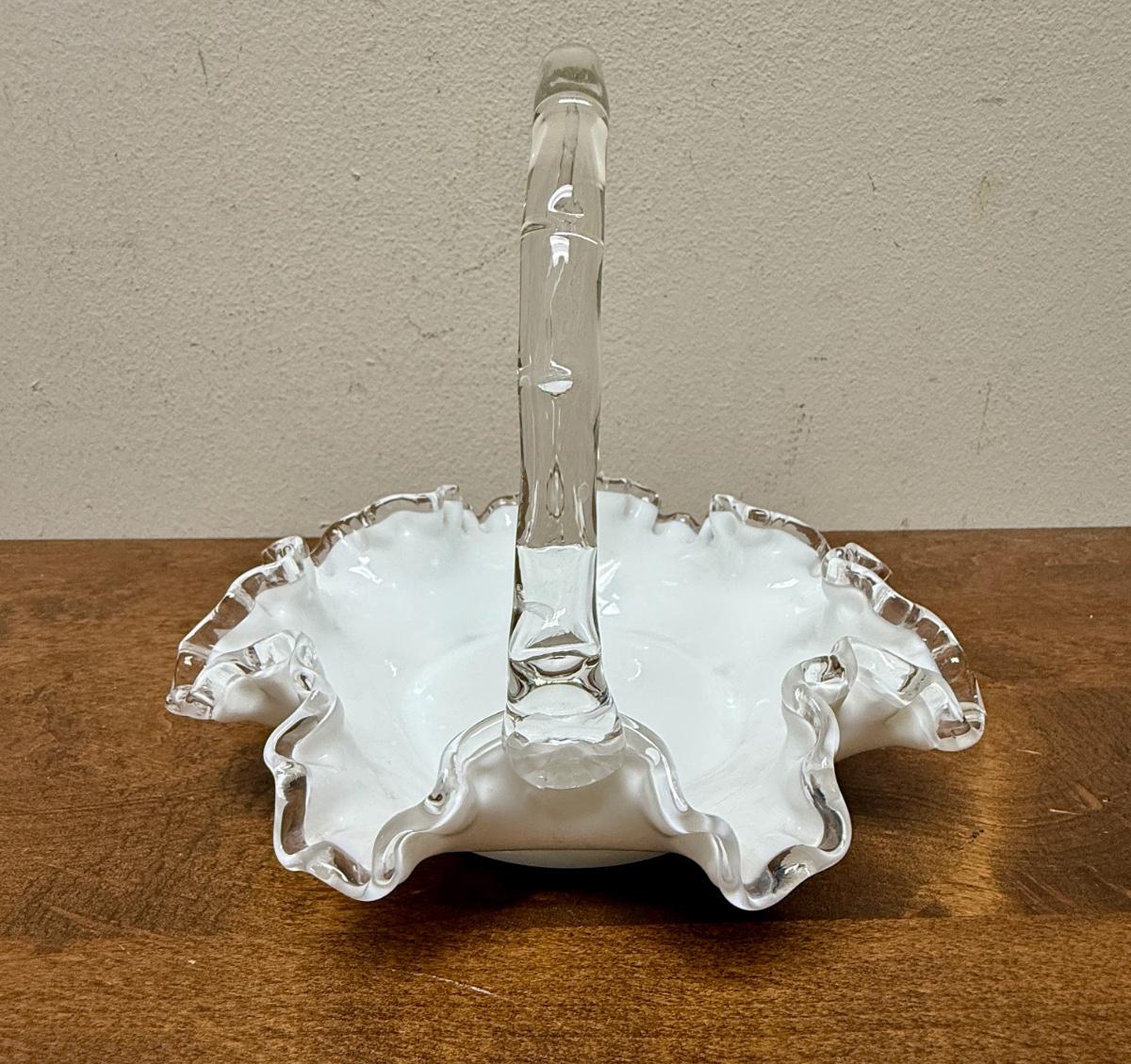 Vintage Fenton Silver Crest Ruffle Rim Bowl Basket Handle 8" White Milk Glass