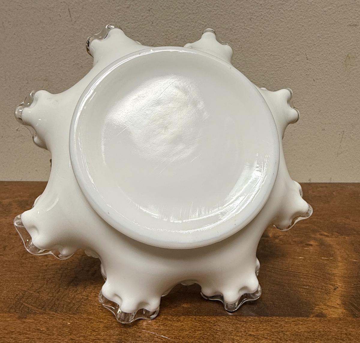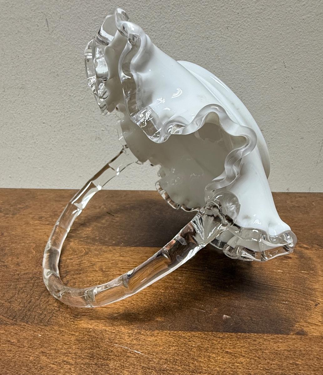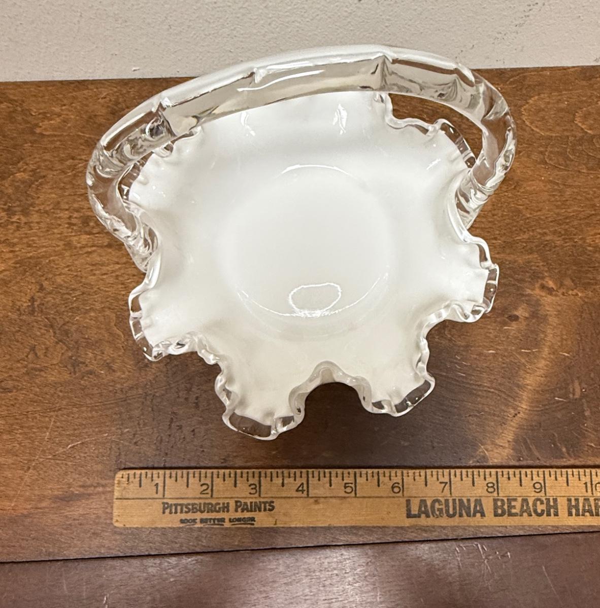 Vintage Fenton Silver Crest Ruffle Rim Bowl Basket Handle 8" White Milk Glass