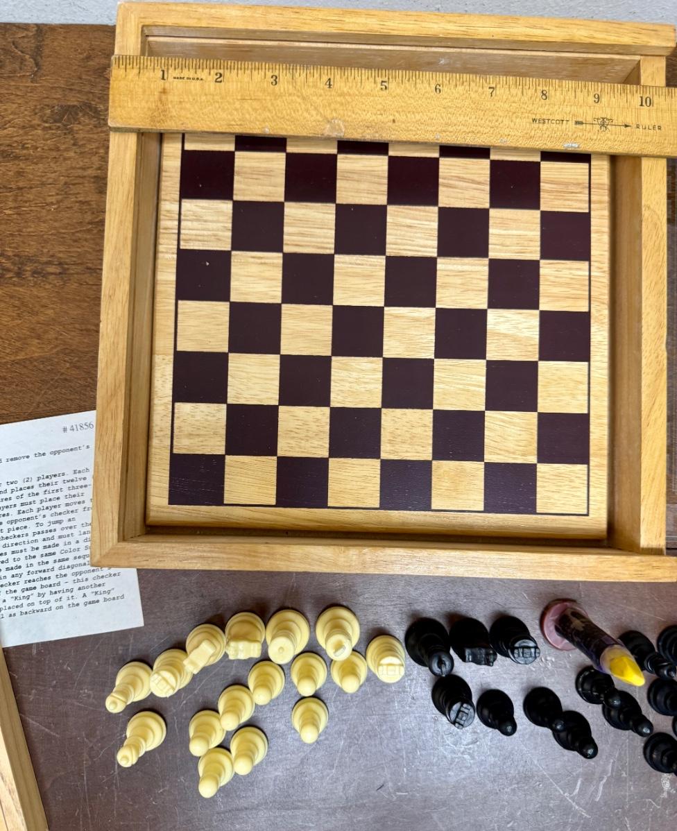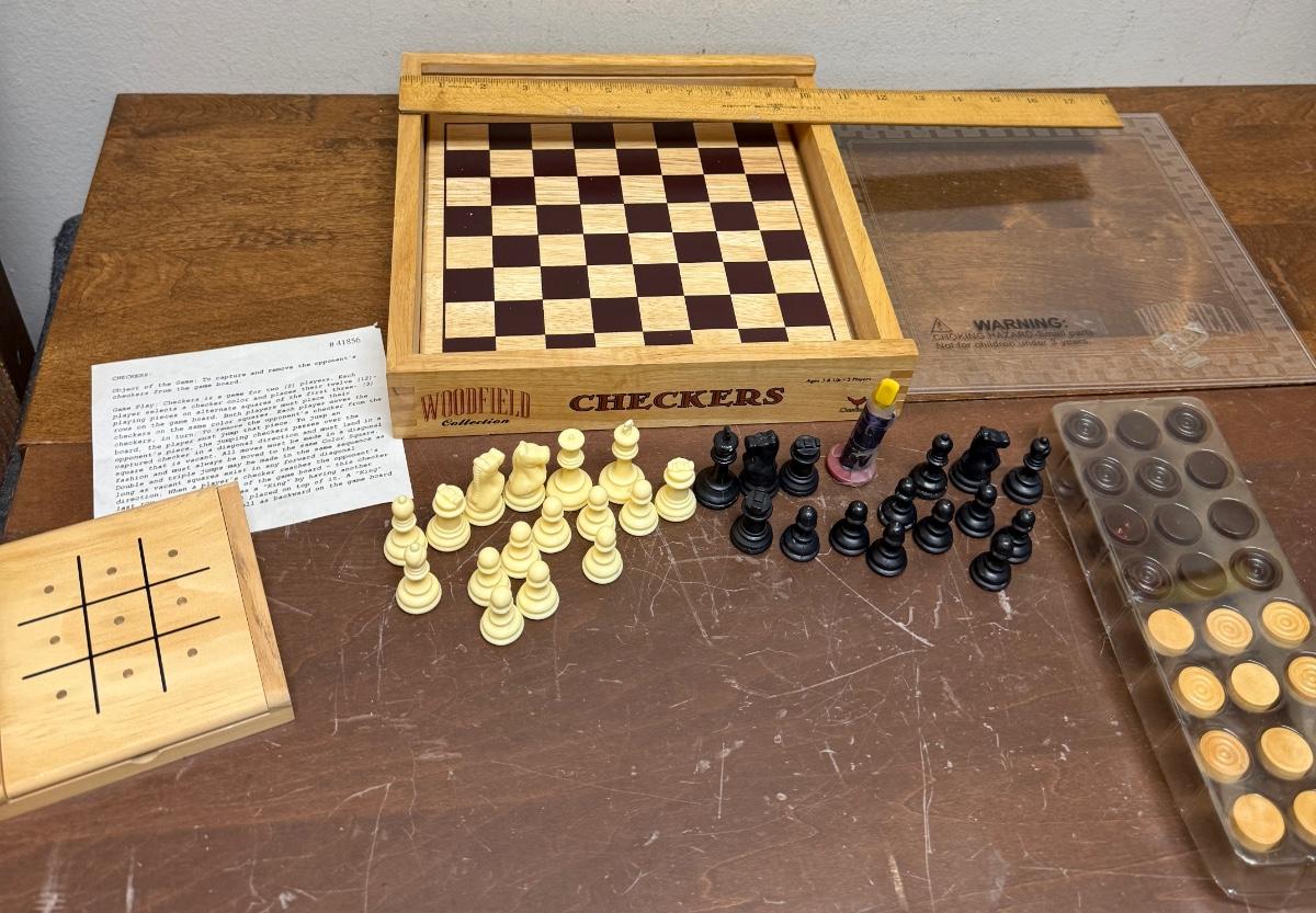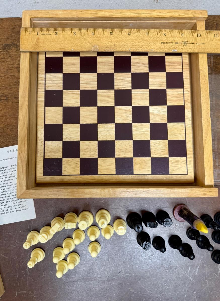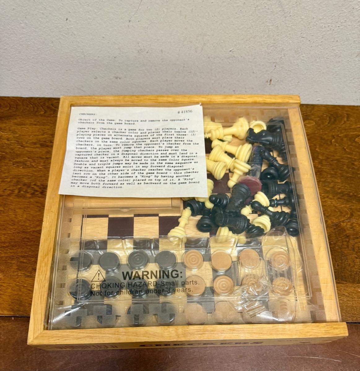 Sliding clear plastic cover. Includes pieces for checkers and chess (missing the black queen). Also included is a small hinged lid Tic-Tac-Toe box with 10 pieces.
