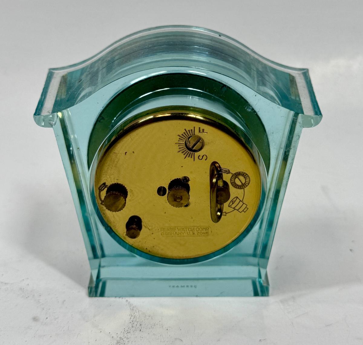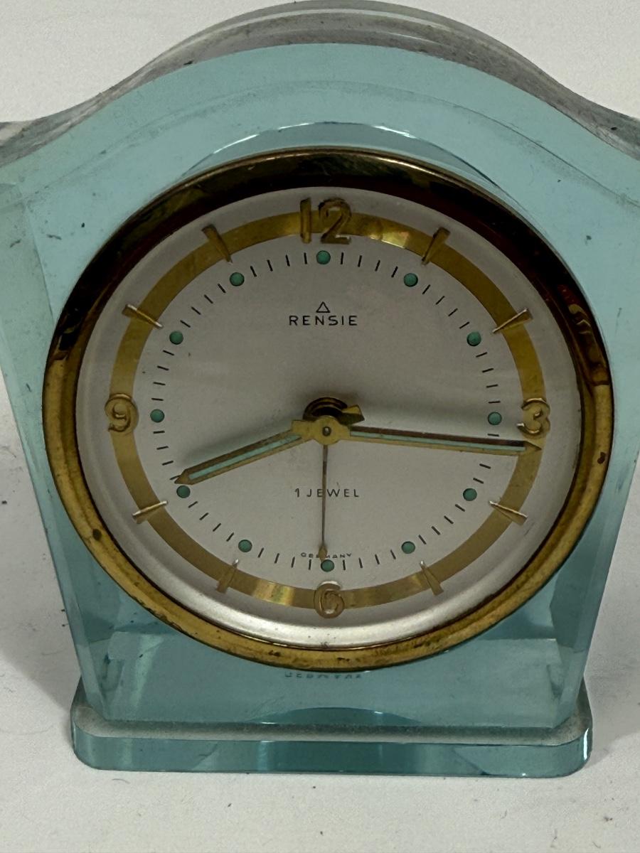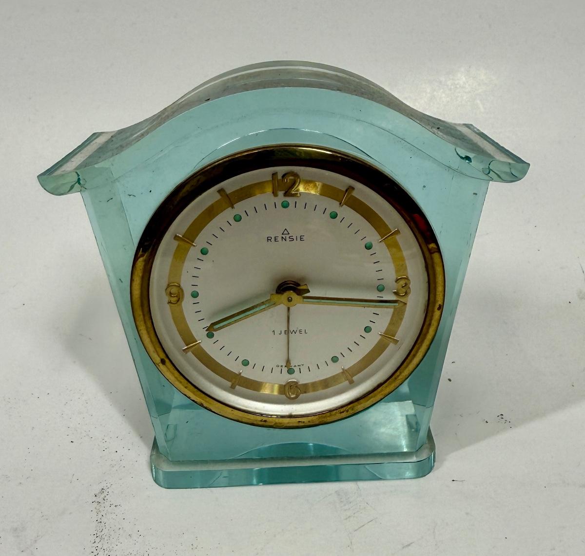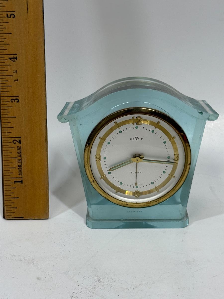 1 Jewel wind-up alarm clock. Pale blue lucite case. Approx. 3.5" tall, made by Rensie Watch Company is US Occupied Germany. Tested, clock and alarm function as expected.