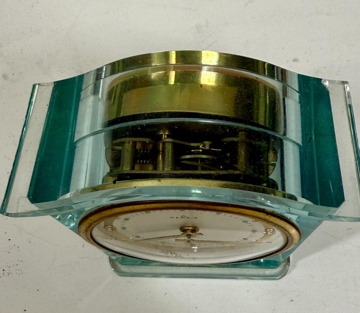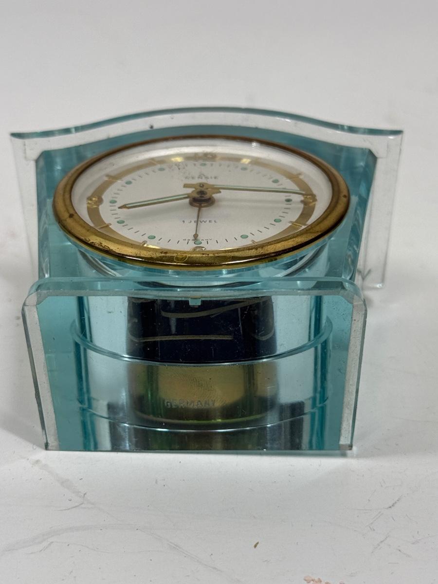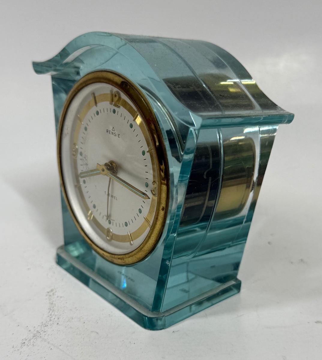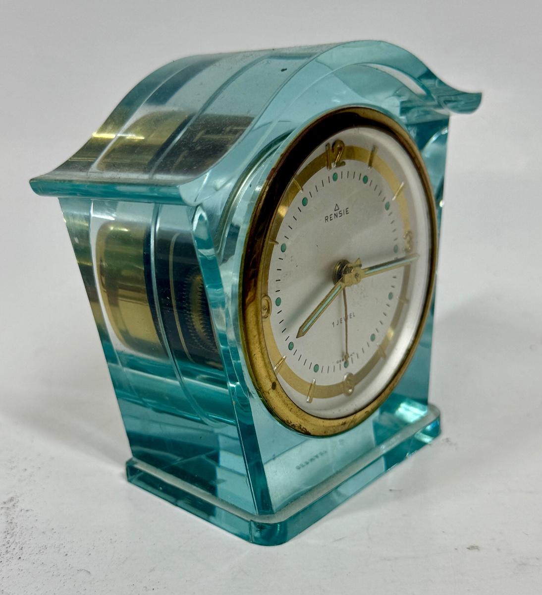 1 Jewel wind-up alarm clock. Pale blue lucite case. Approx. 3.5" tall, made by Rensie Watch Company is US Occupied Germany. Tested, clock and alarm function as expected.