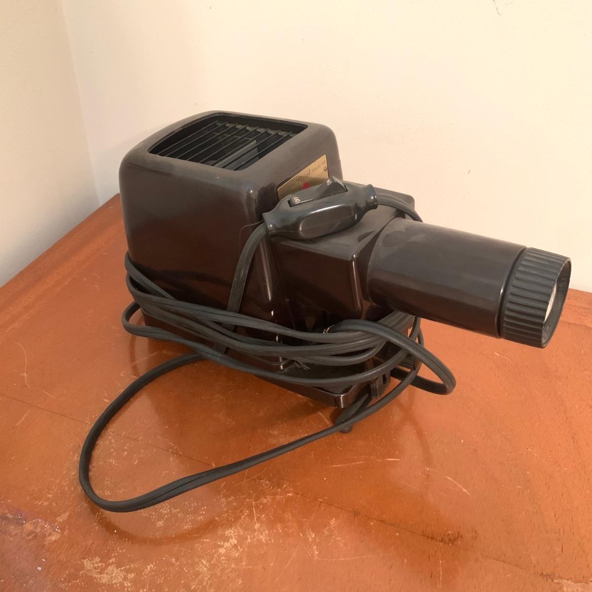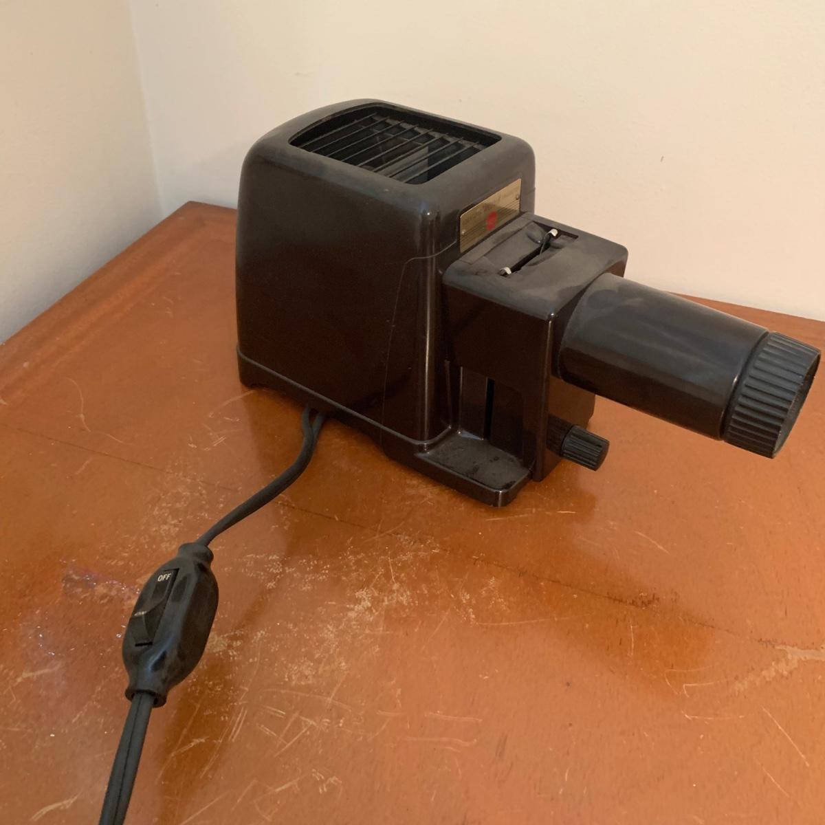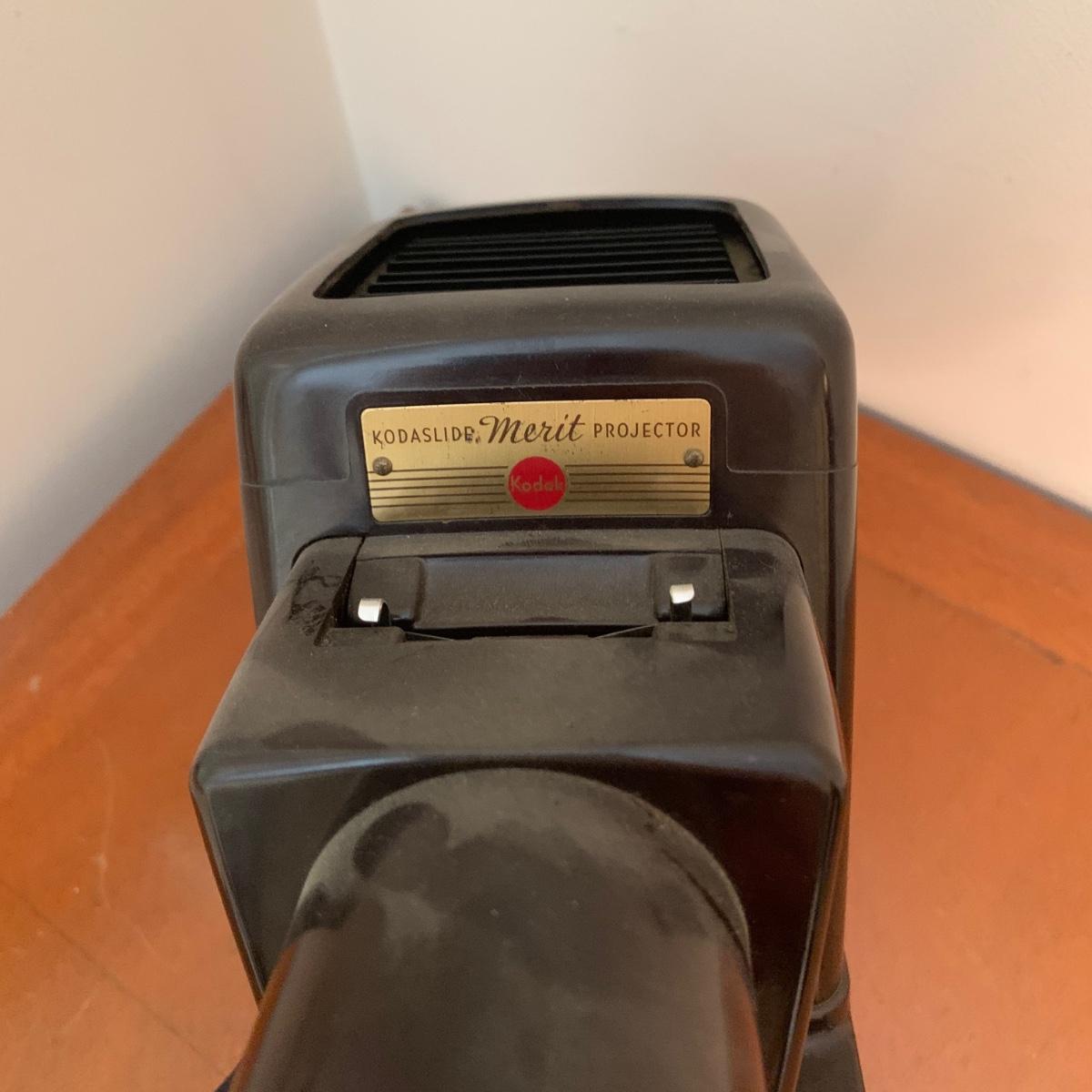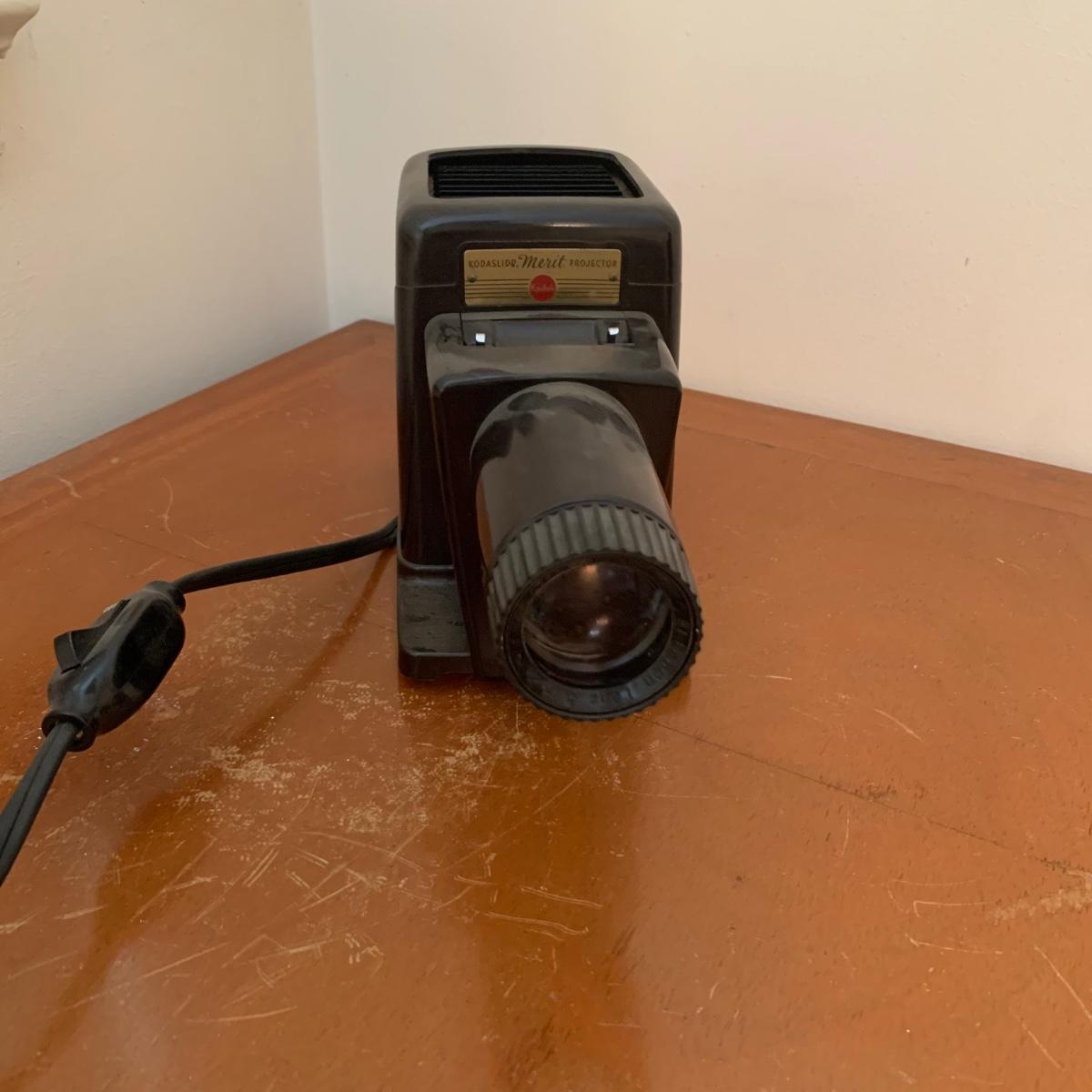 This lot includes one Kodak Kodaslide Merit Projector and three boxes of slides. Projector was plugged in and powers on. Slides are used. The projector measures about 12in x 6in. Shipping available.