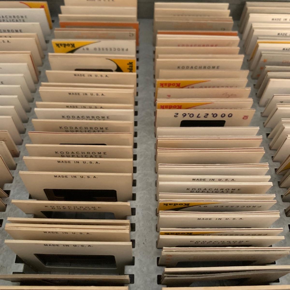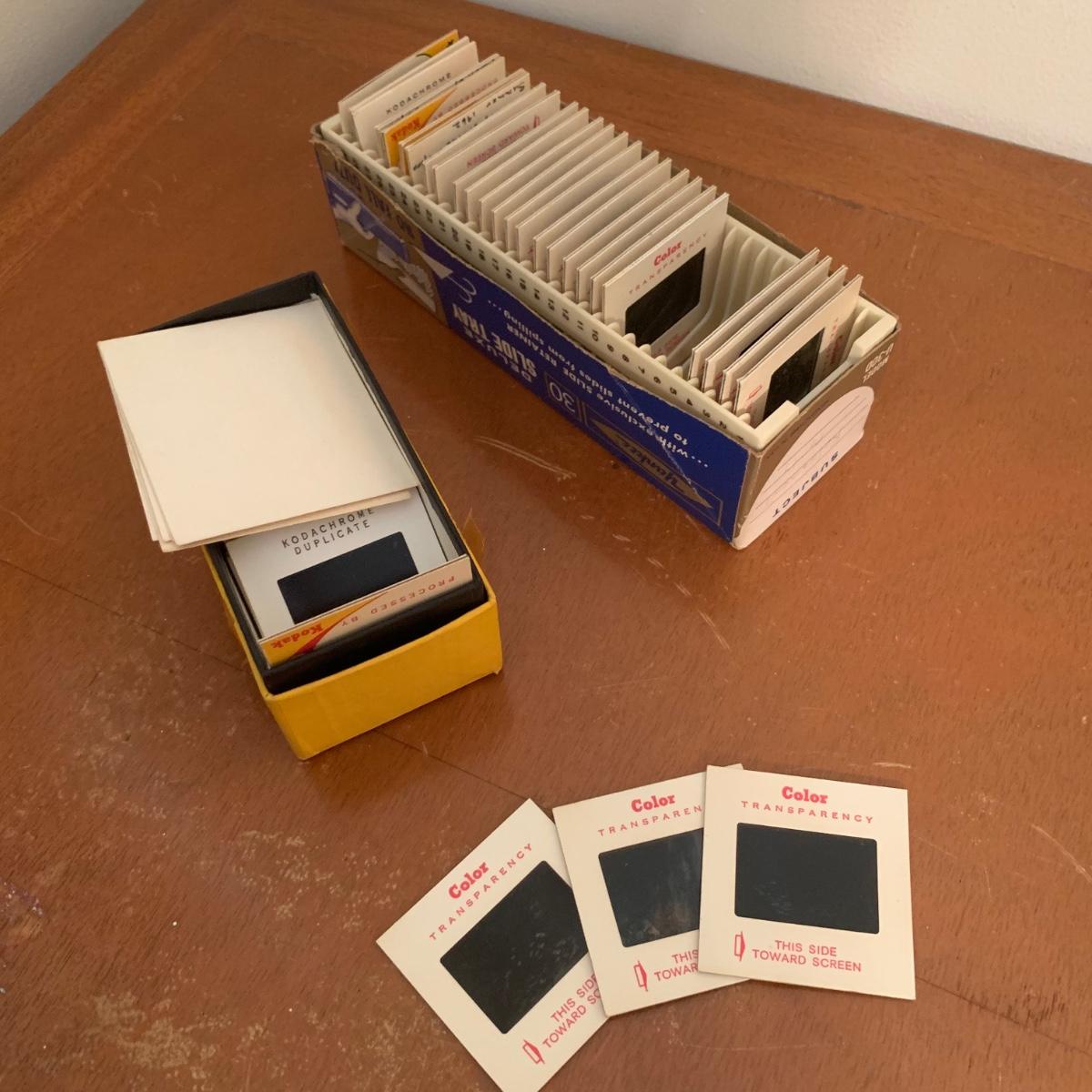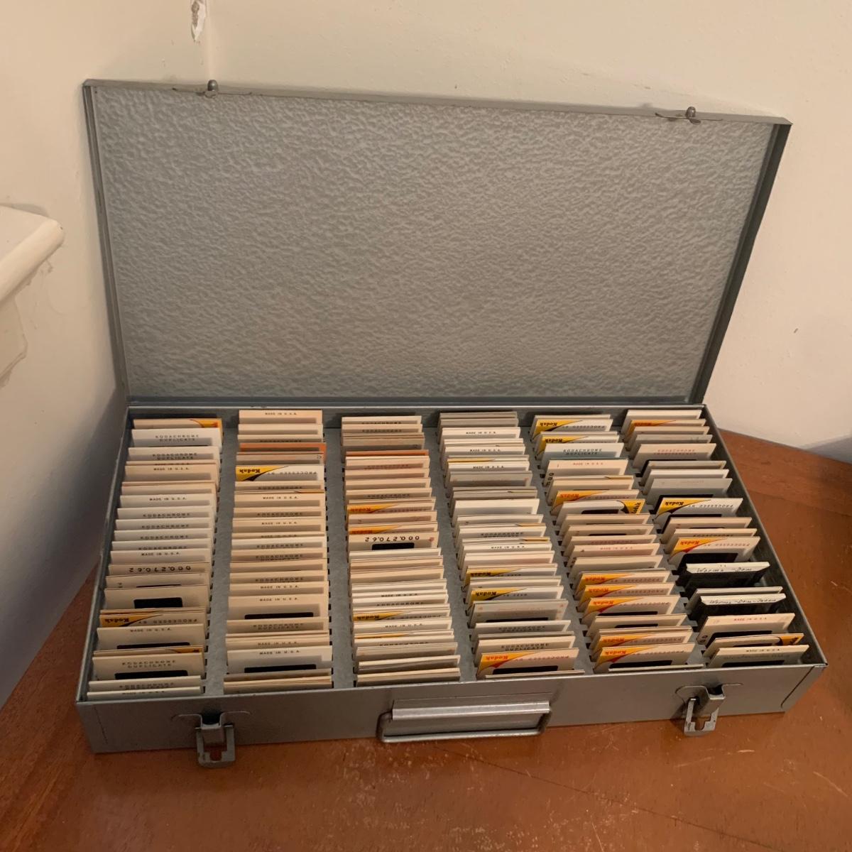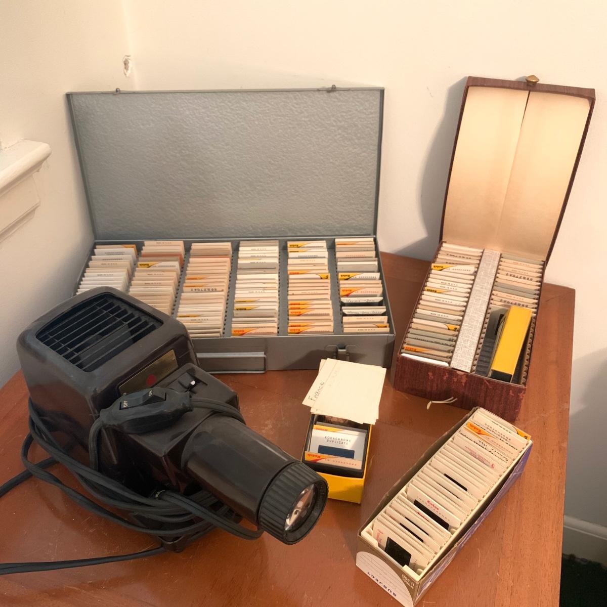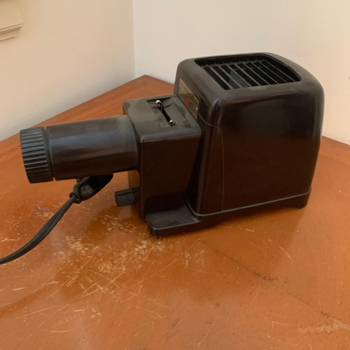 This lot includes one Kodak Kodaslide Merit Projector and three boxes of slides. Projector was plugged in and powers on. Slides are used. The projector measures about 12in x 6in. Shipping available.