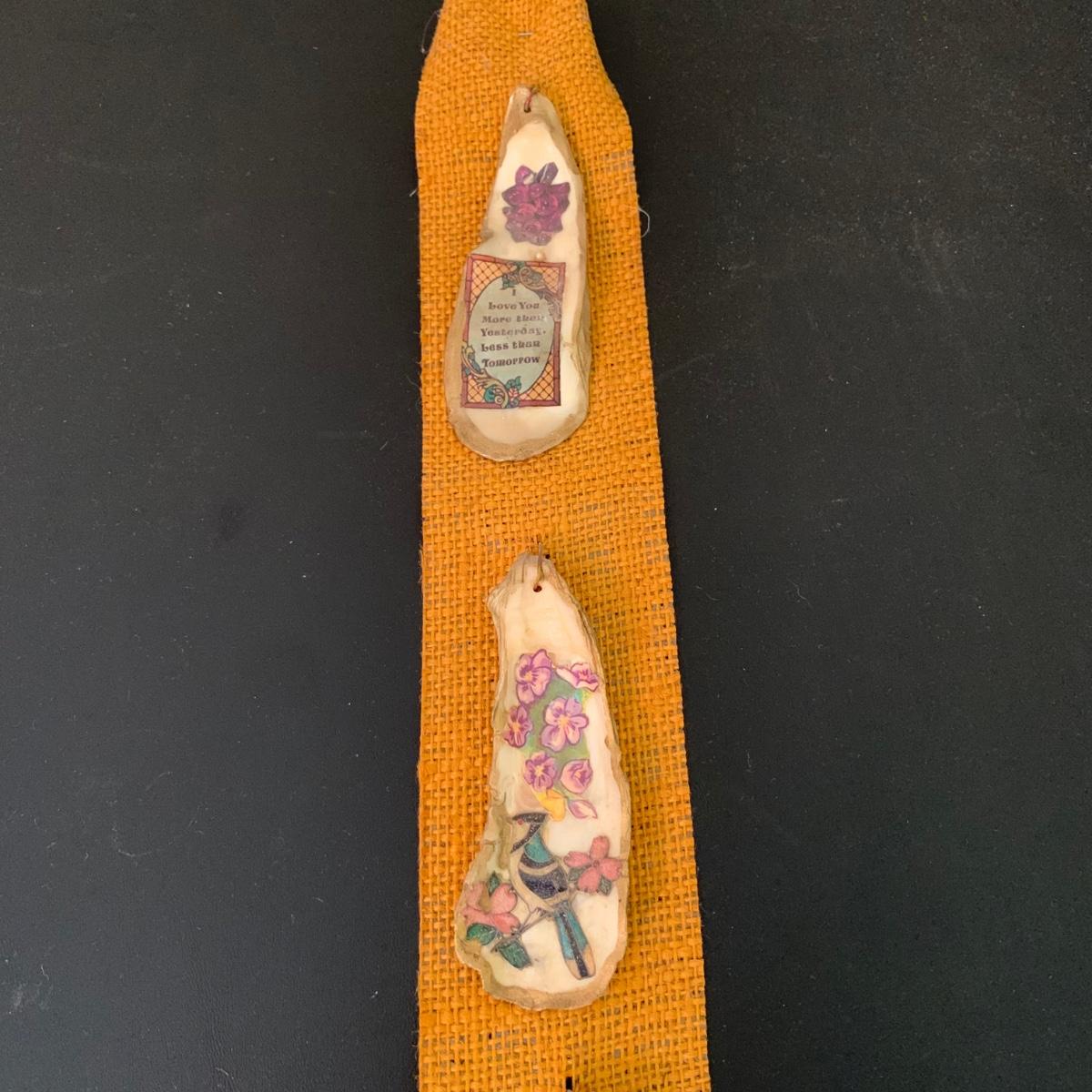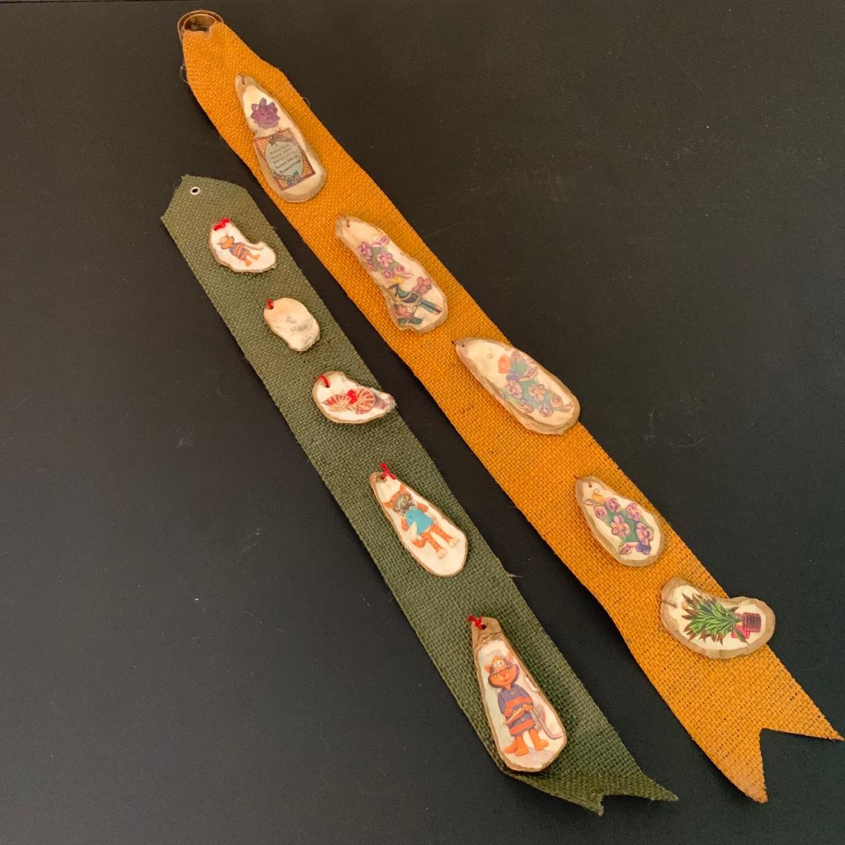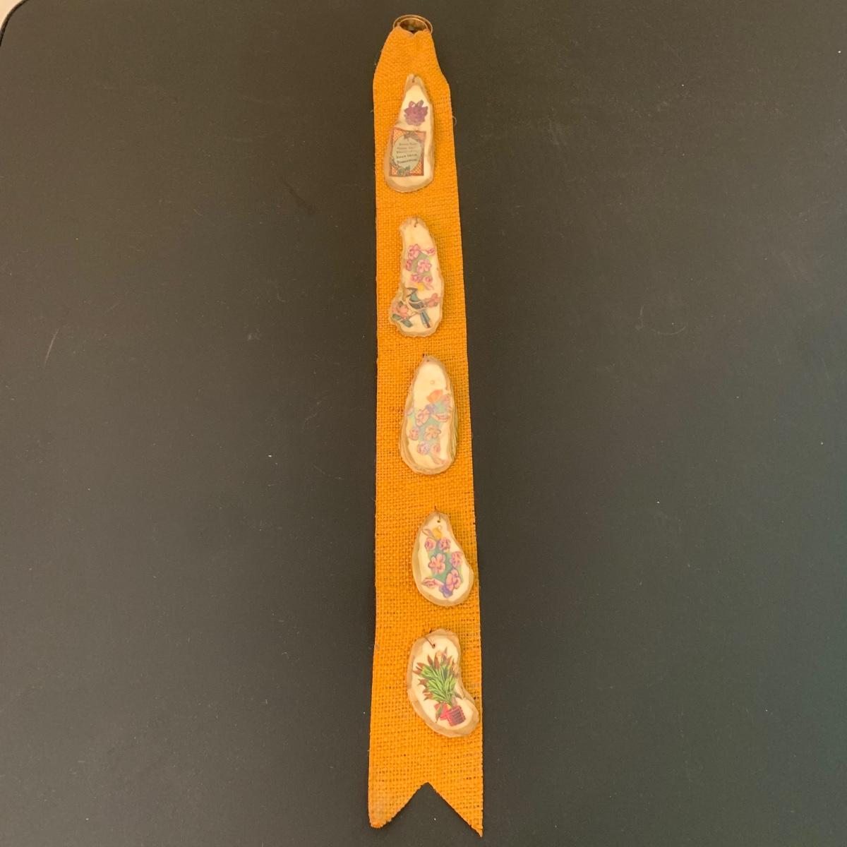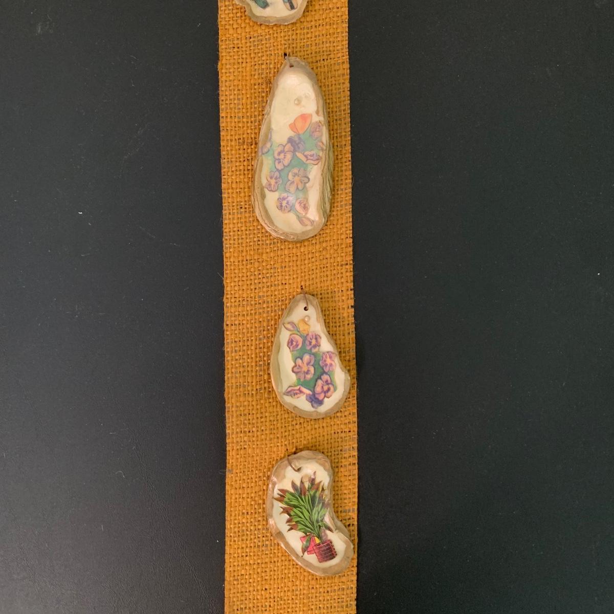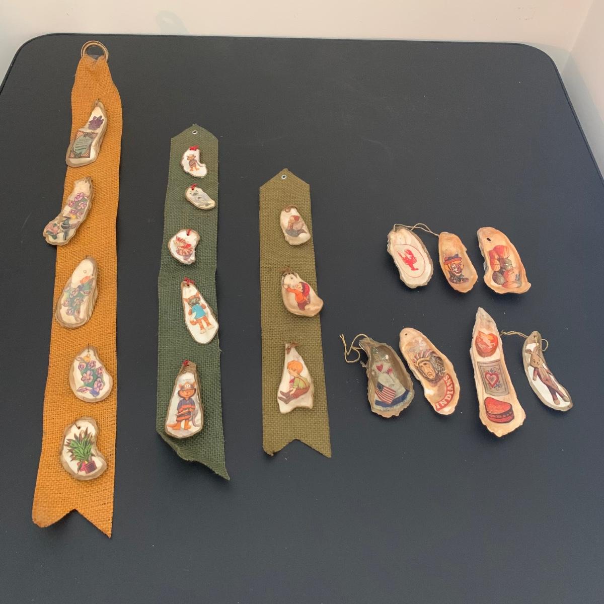 This lot includes three linen sashes decorated with oyster shells. The shells are decorated with what appears to be paper and paint. The lot also includes oyster art for the garden and ornaments. The largest sash measures about 27in. Shipping available.