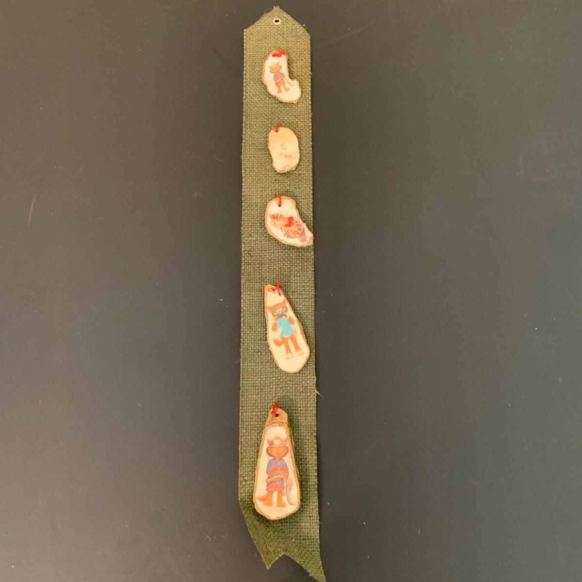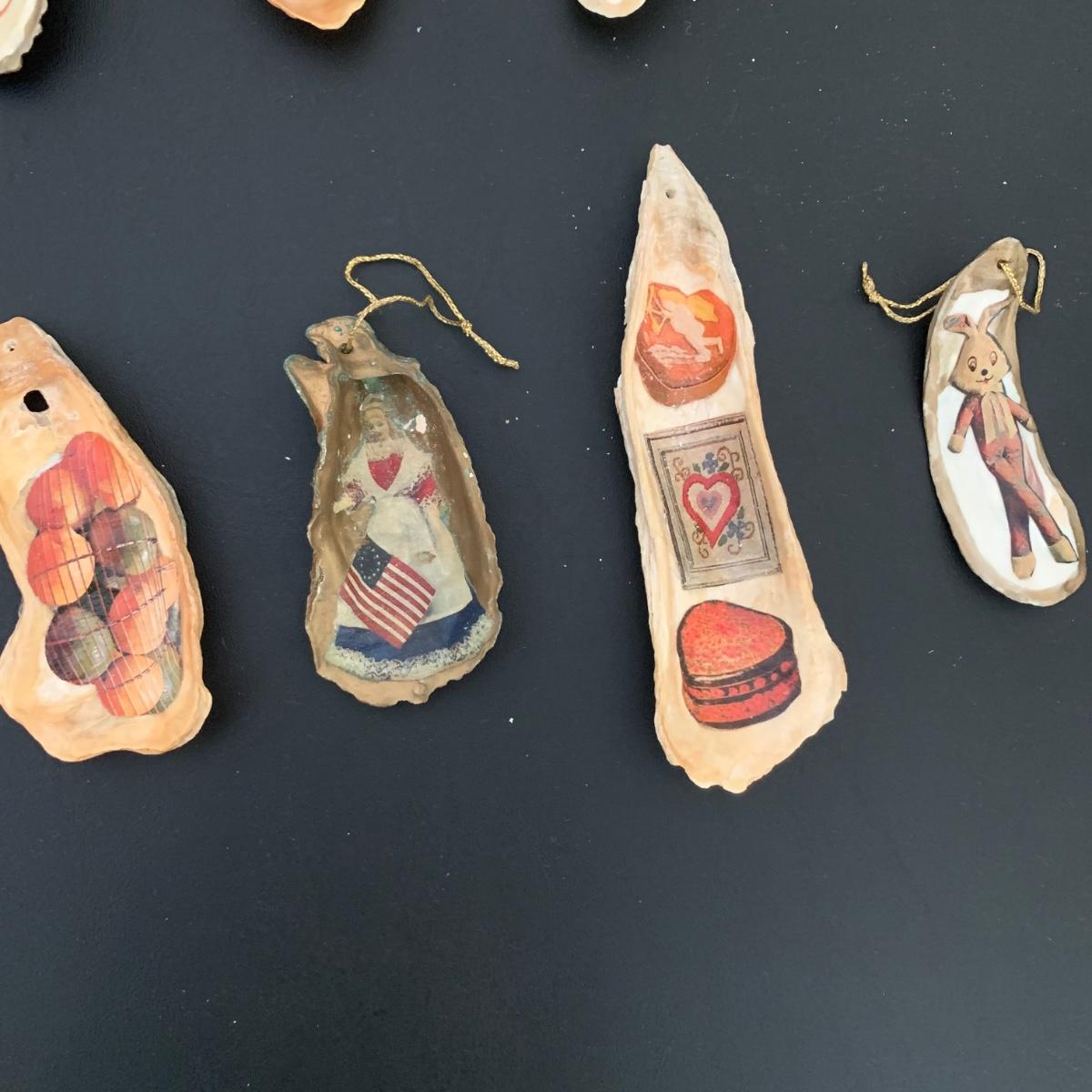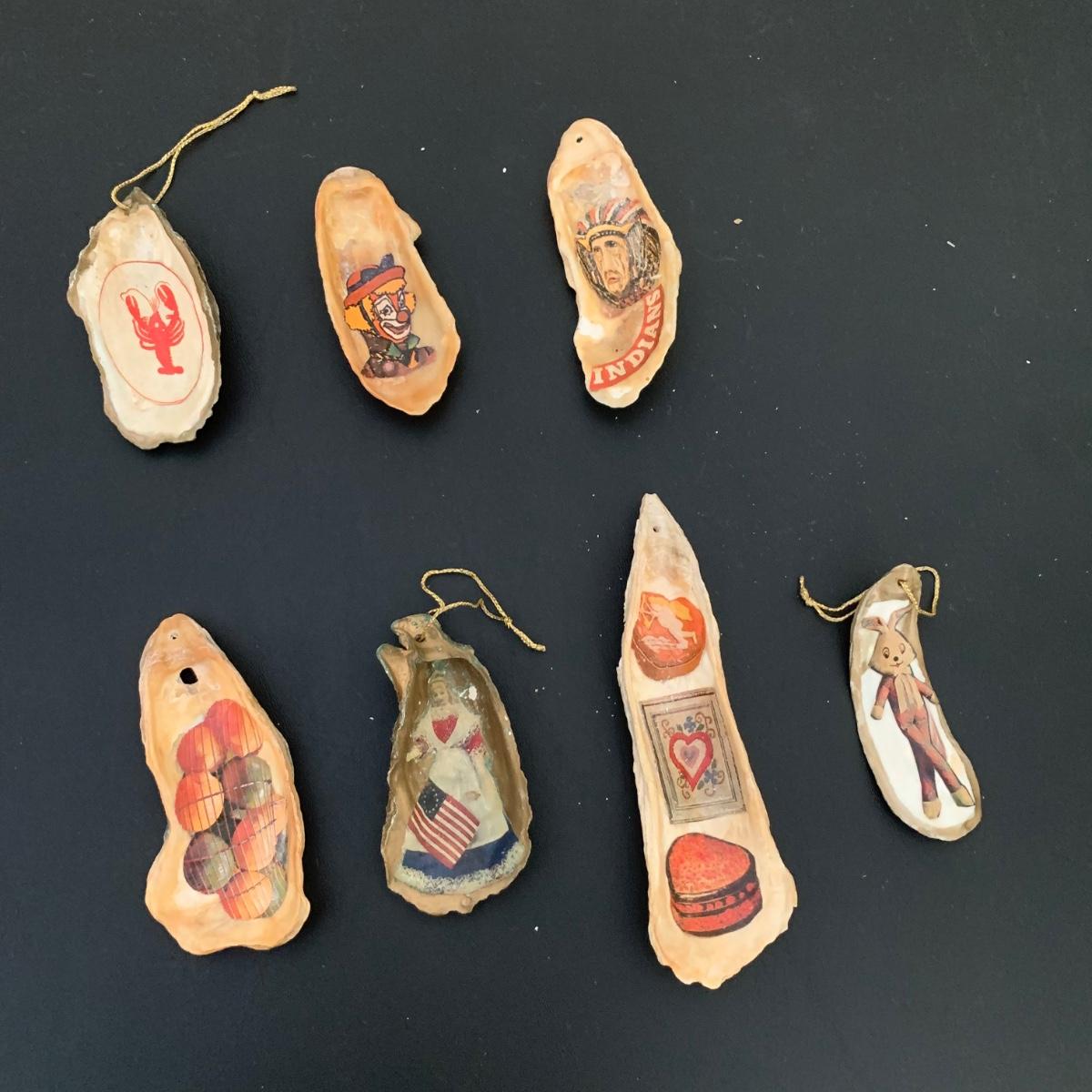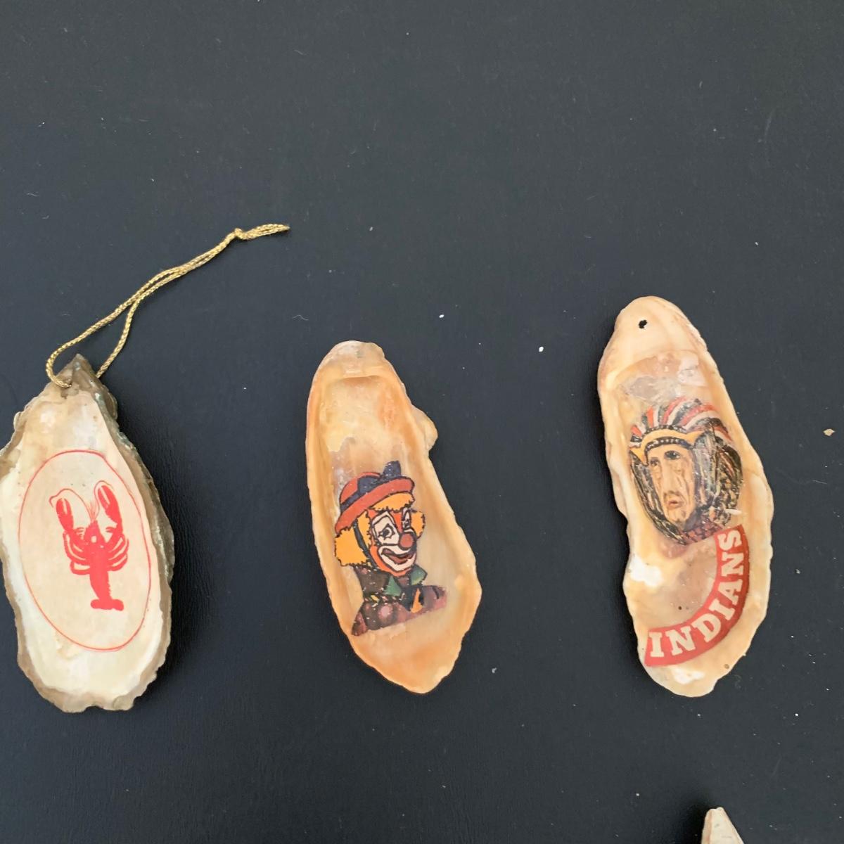 This lot includes three linen sashes decorated with oyster shells. The shells are decorated with what appears to be paper and paint. The lot also includes oyster art for the garden and ornaments. The largest sash measures about 27in. Shipping available.