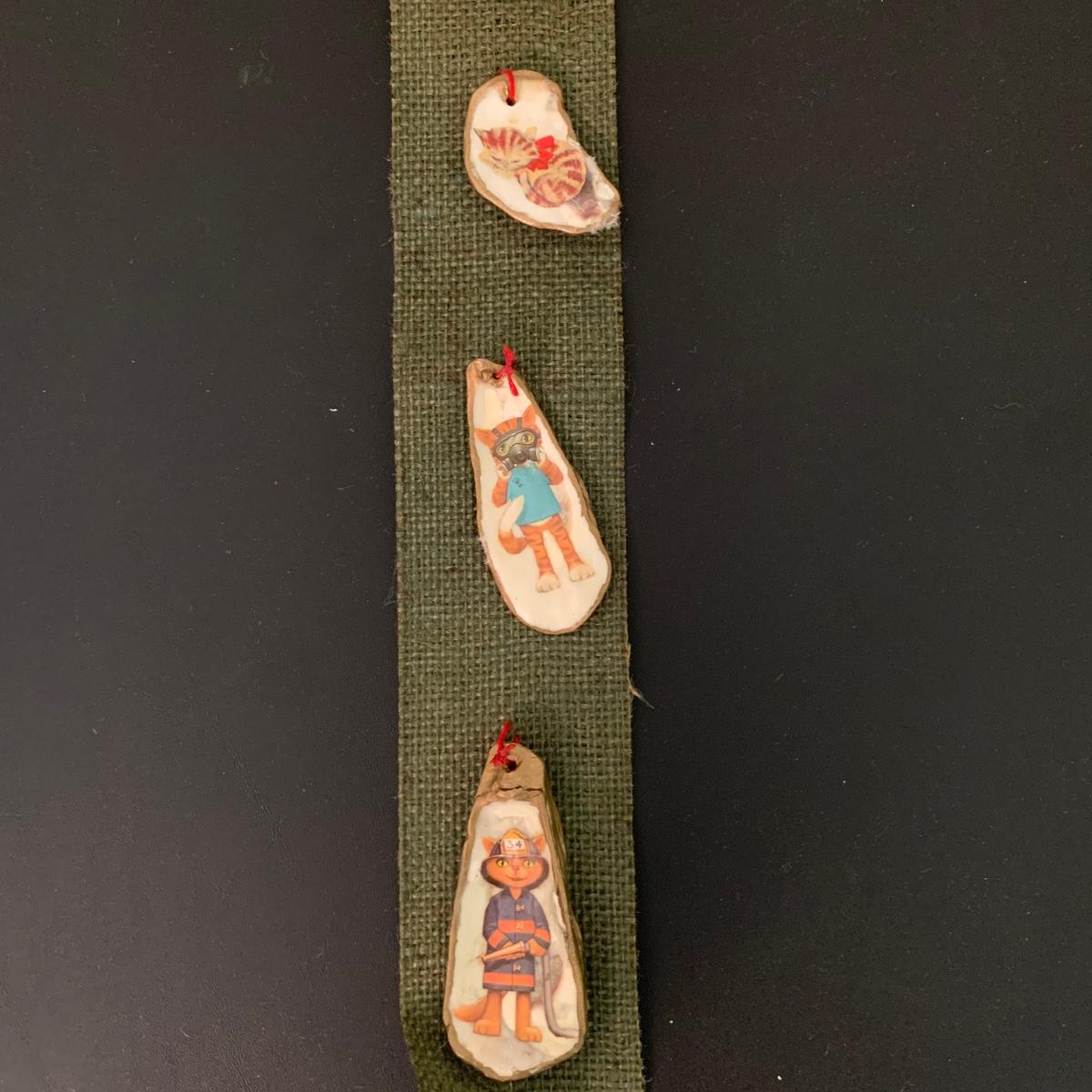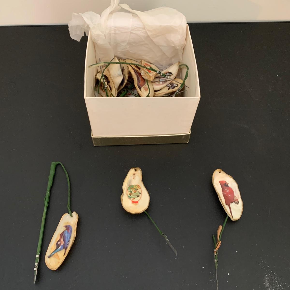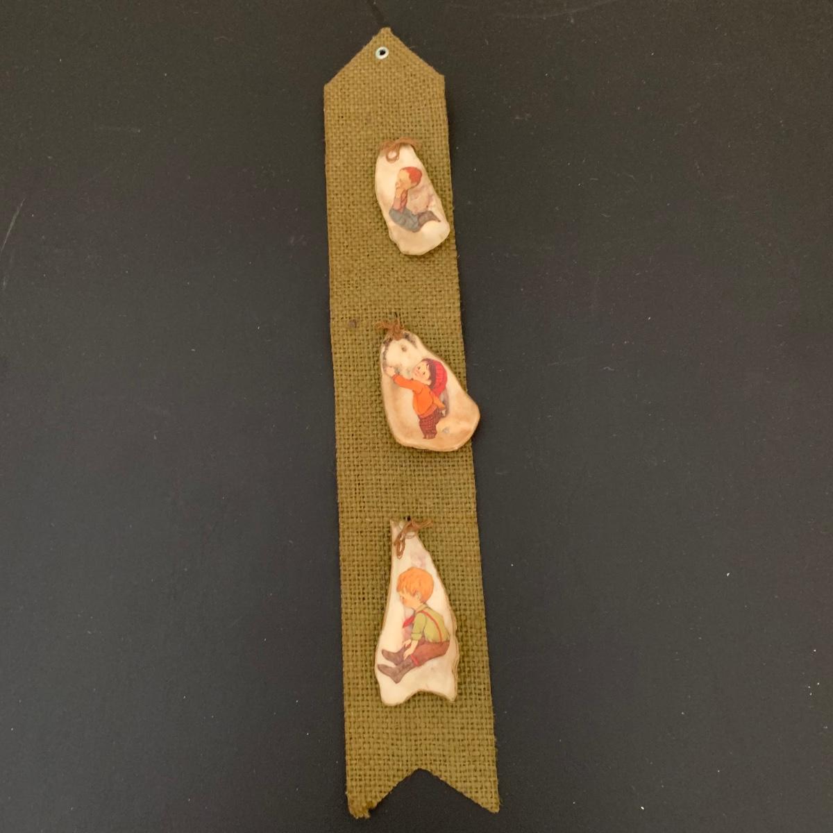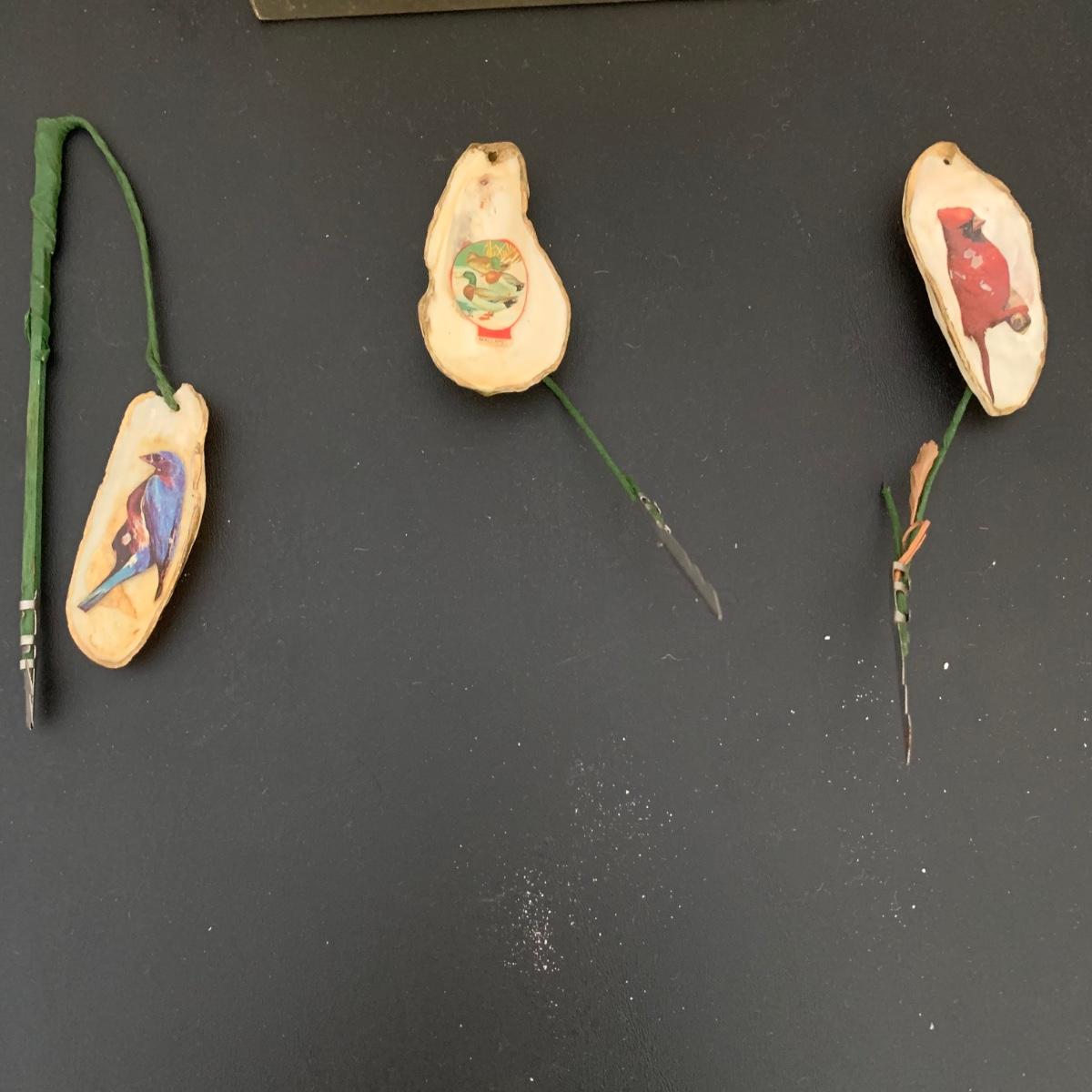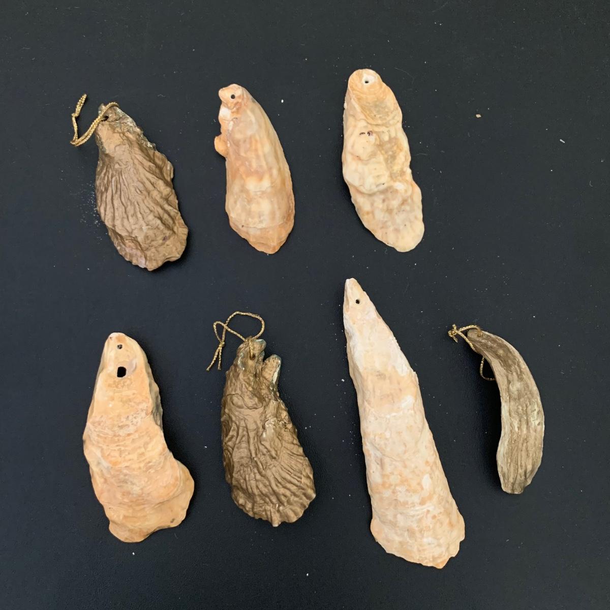This lot includes three linen sashes decorated with oyster shells. The shells are decorated with what appears to be paper and paint. The lot also includes oyster art for the garden and ornaments. The largest sash measures about 27in. Shipping available.