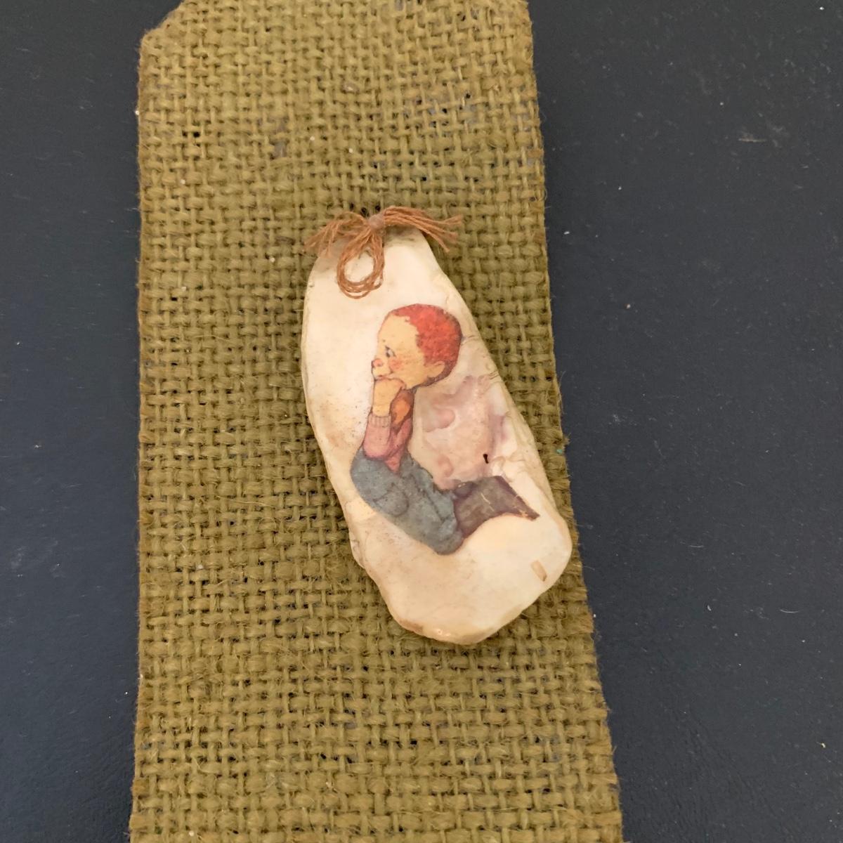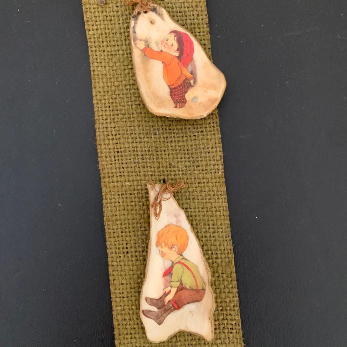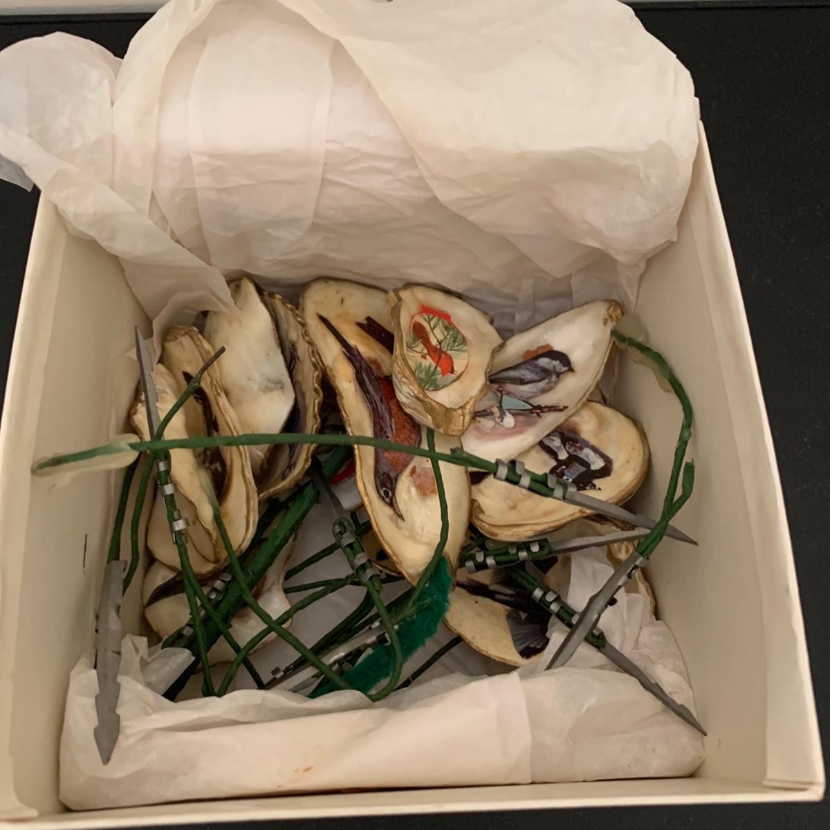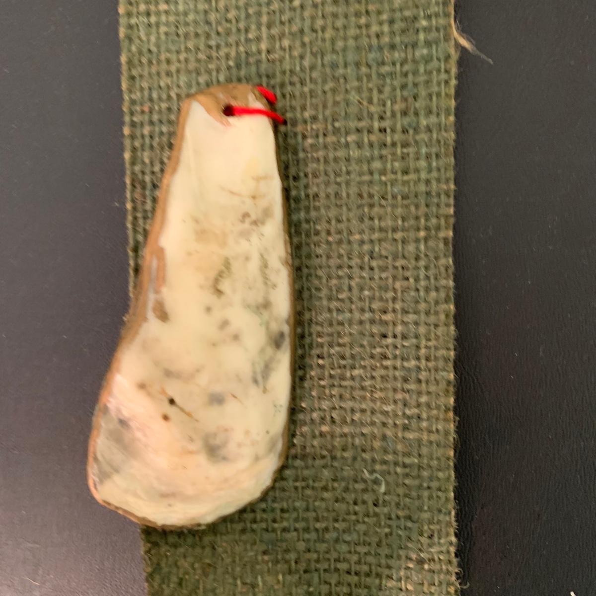 This lot includes three linen sashes decorated with oyster shells. The shells are decorated with what appears to be paper and paint. The lot also includes oyster art for the garden and ornaments. The largest sash measures about 27in. Shipping available.