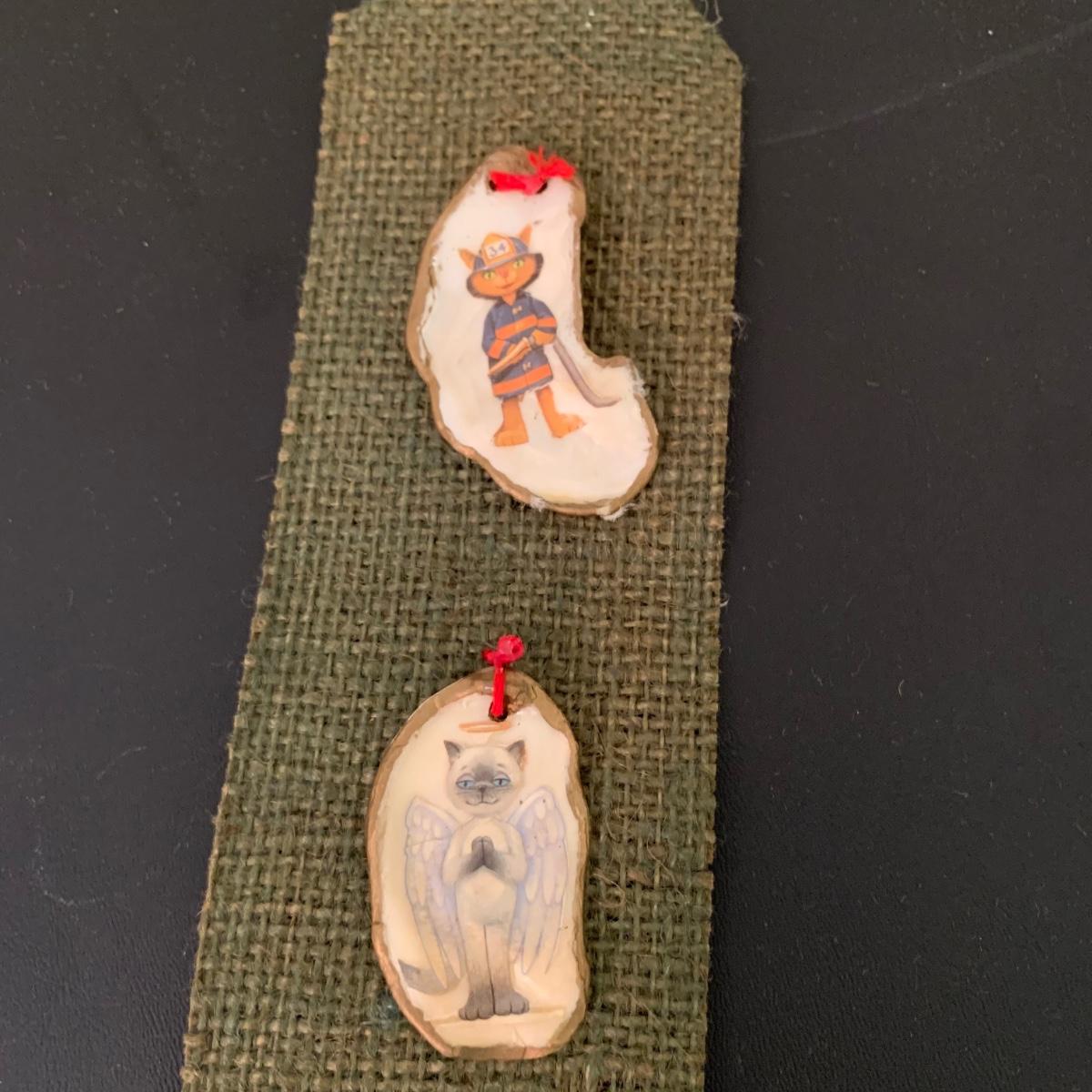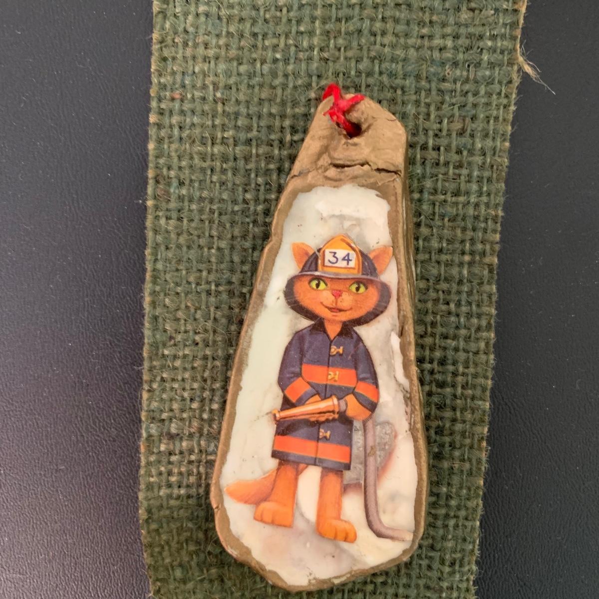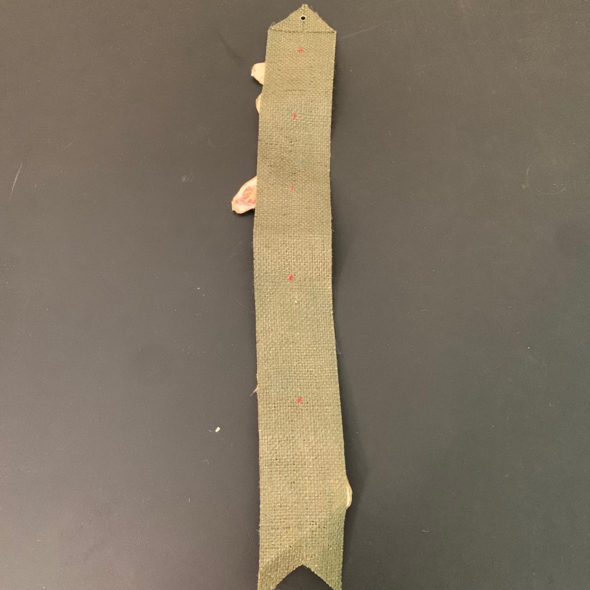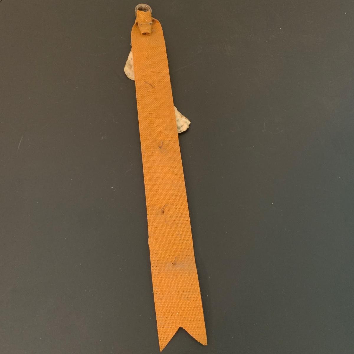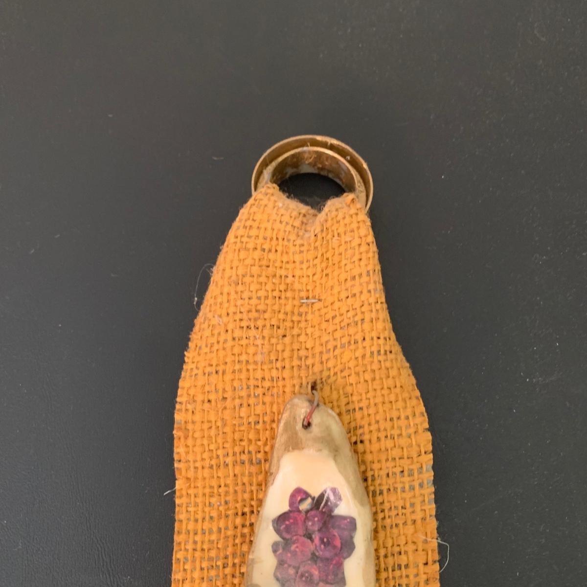 This lot includes three linen sashes decorated with oyster shells. The shells are decorated with what appears to be paper and paint. The lot also includes oyster art for the garden and ornaments. The largest sash measures about 27in. Shipping available.