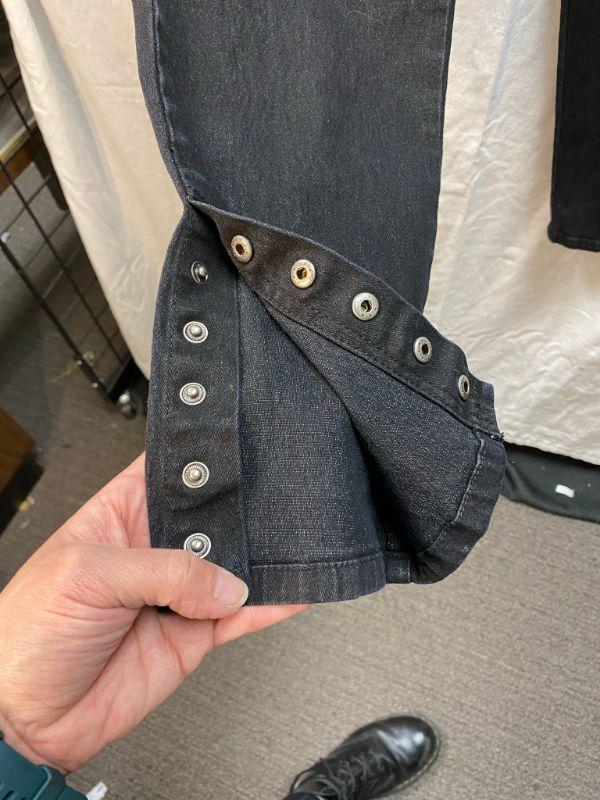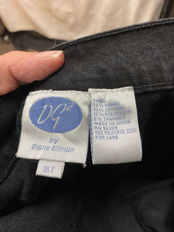 DG2 by Diane Gilman black denim jeans. Black rinse with studded snaps at the ankle. They have a tapered ankle, may be skinny jeans, does not say the cut on the tags. They do have some stretch to fabric. Size 16T. Good condition.