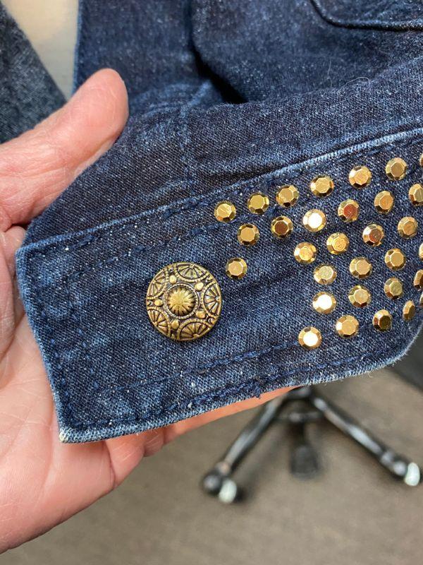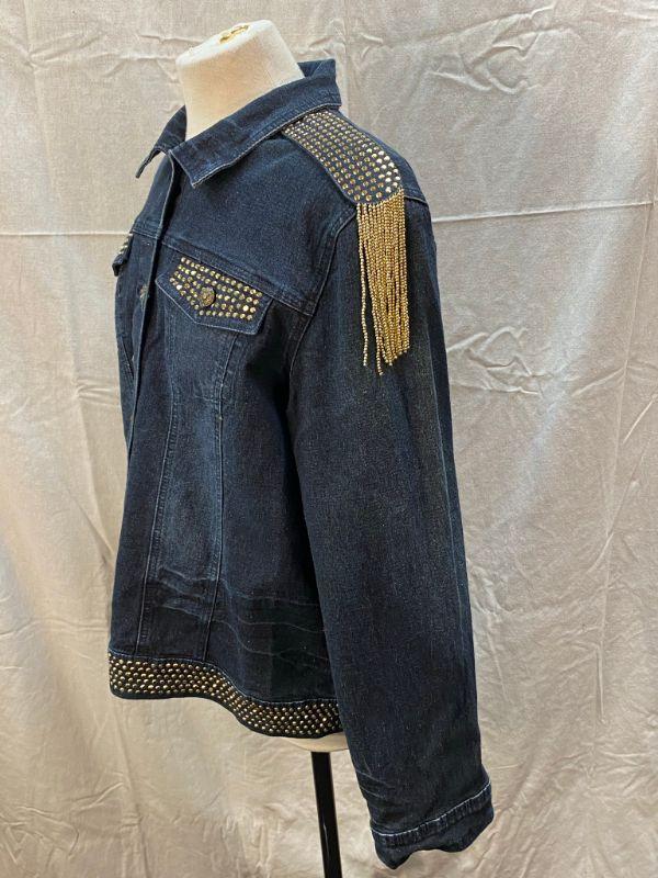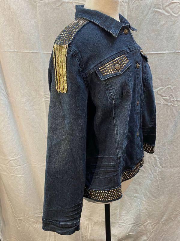 DG2 by Diane Gilman embellished denim jacket. Medium blue wash. Gold tone sequin embellishment to the waist band, pocket flaps, and shoulders. Shoulders also have beaded fringe hanging from them. No pockets. Size XL. Good condition, only missing a couple sequins near button.