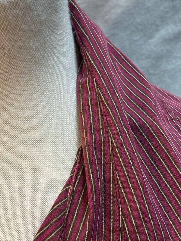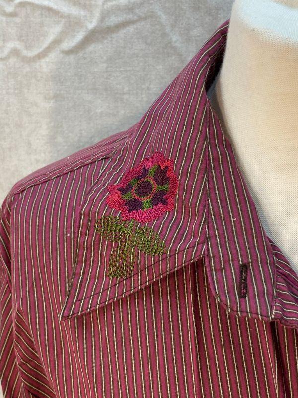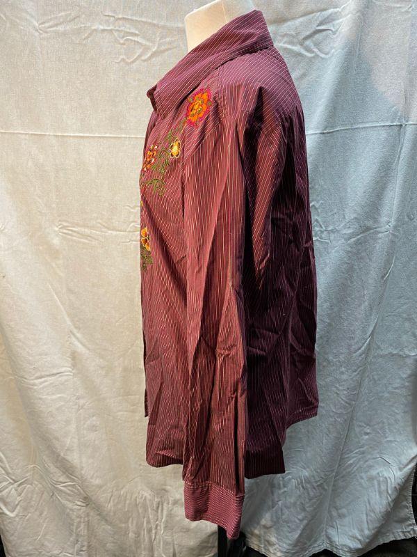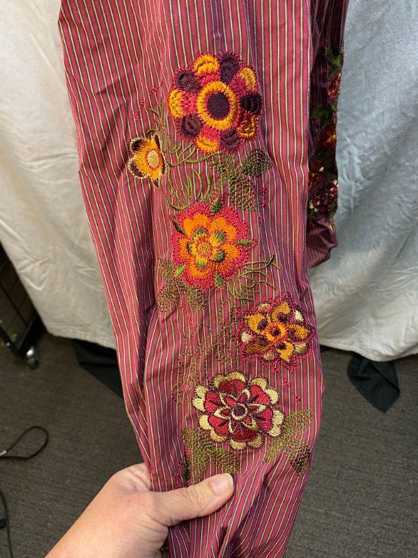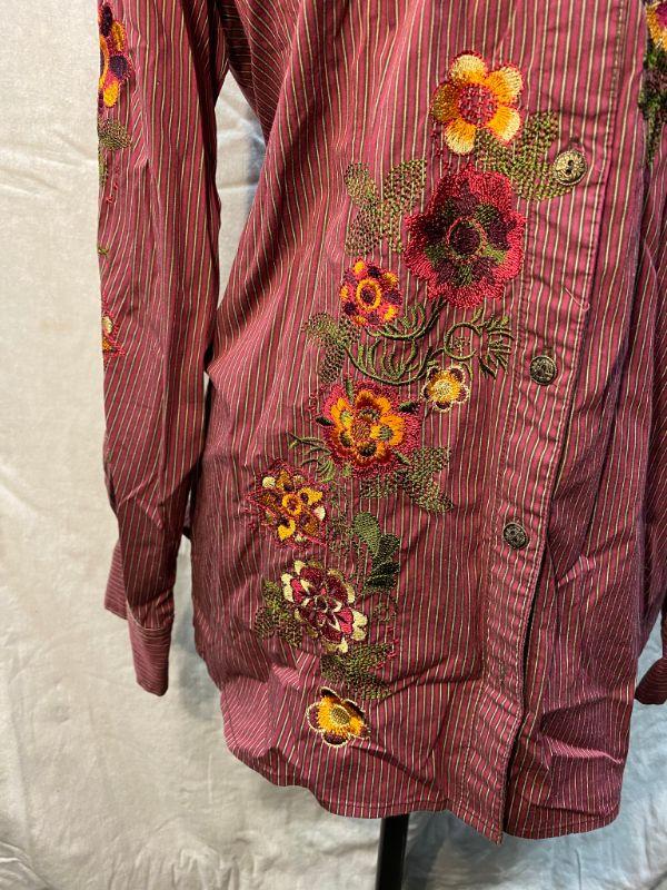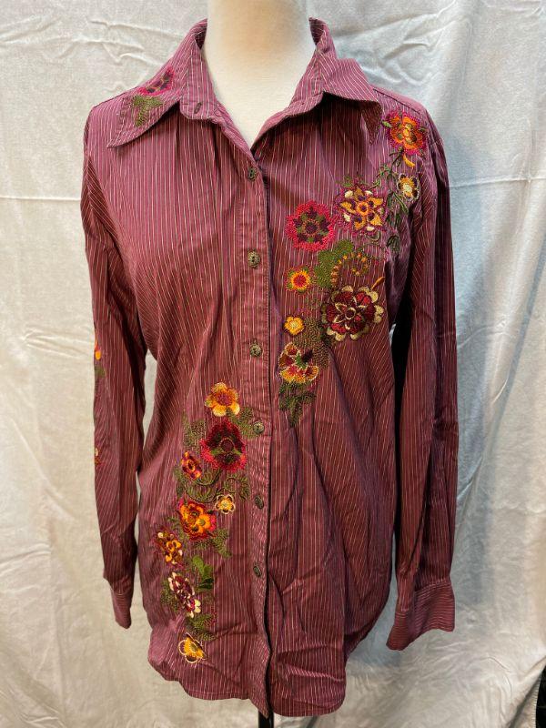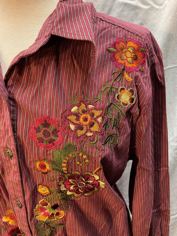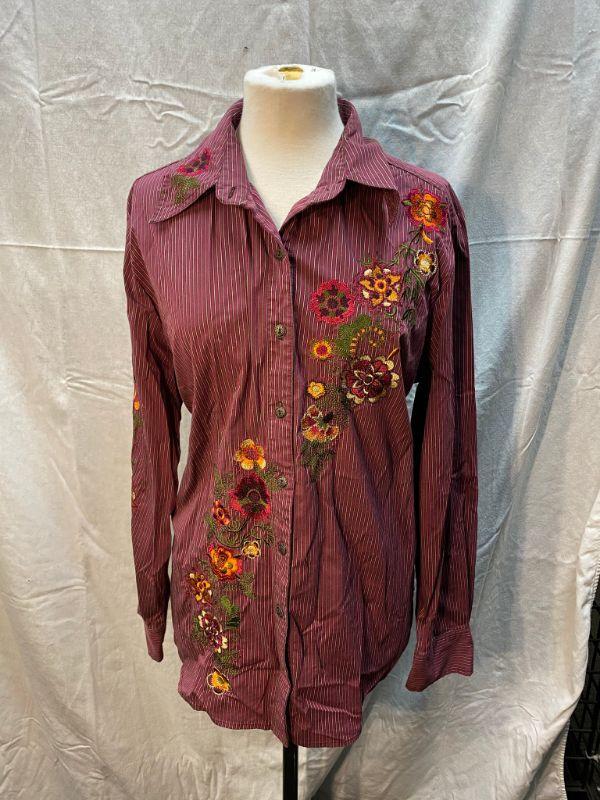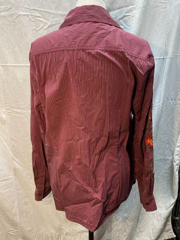 DG2 by Diane Gilman brick red pin stripe shirt. Button front. Floral embroidery goes from left shoulder to right hip. There is also embroidery on the right side of collar and right sleeve. A little wrinkled but in good condition. Size XL.
