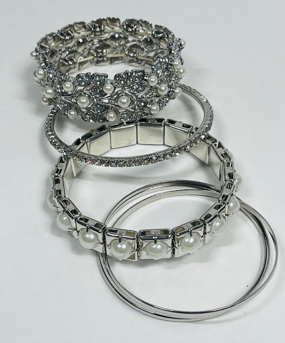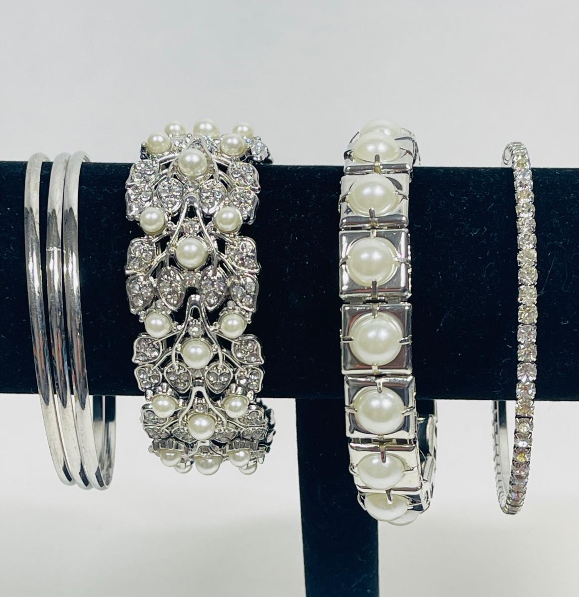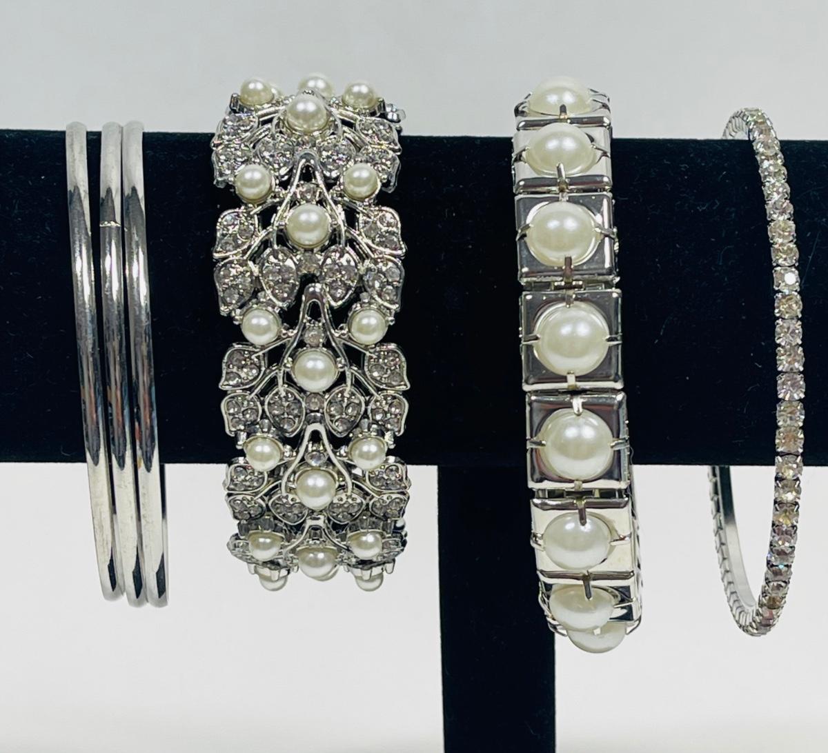 Lot of 6 Bracelets Bangles Silver tone Rhinestones Faux Pearls