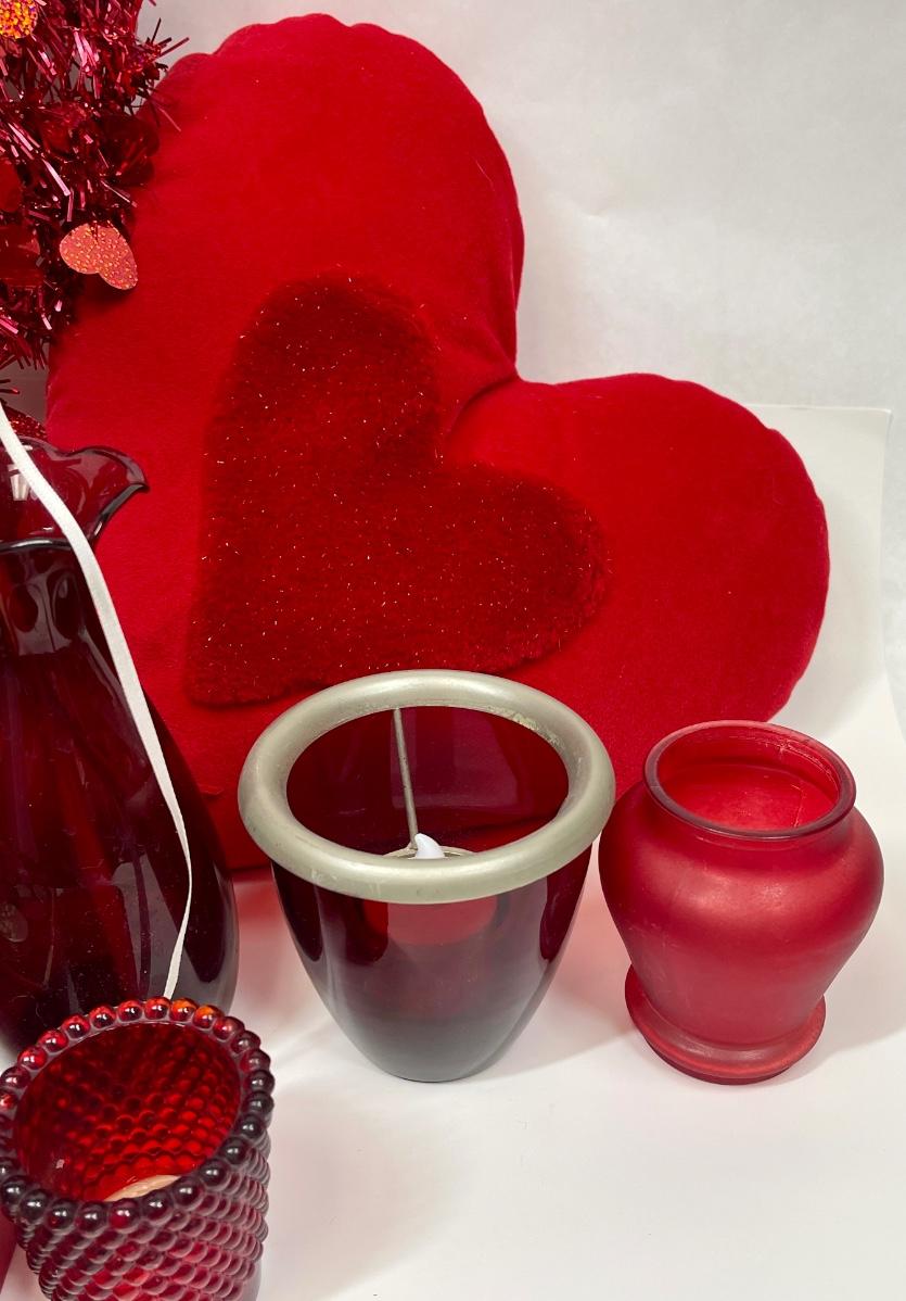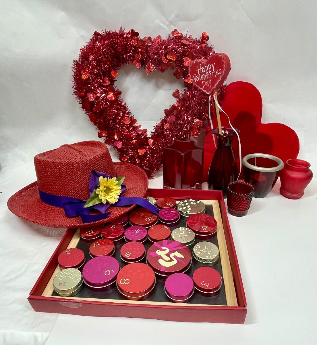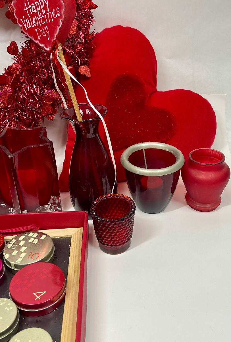 Lot of LOVE DECOR red wreath, hat, candleholders, vase, mini can calendar, etc