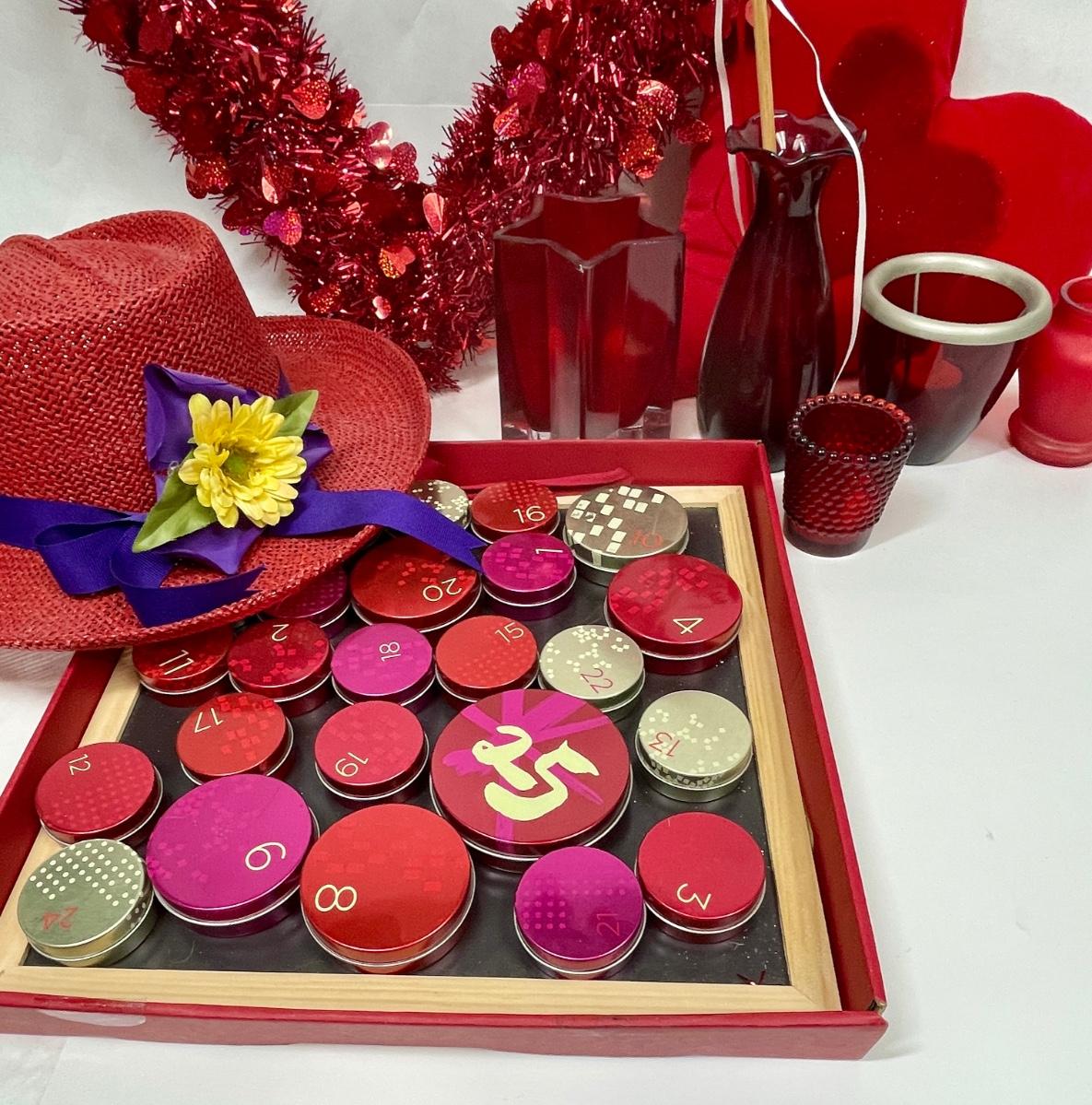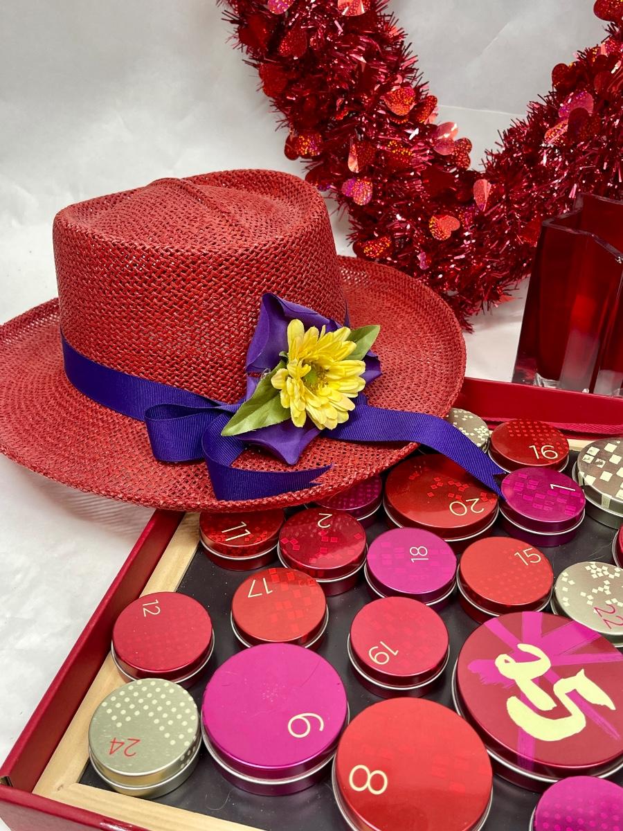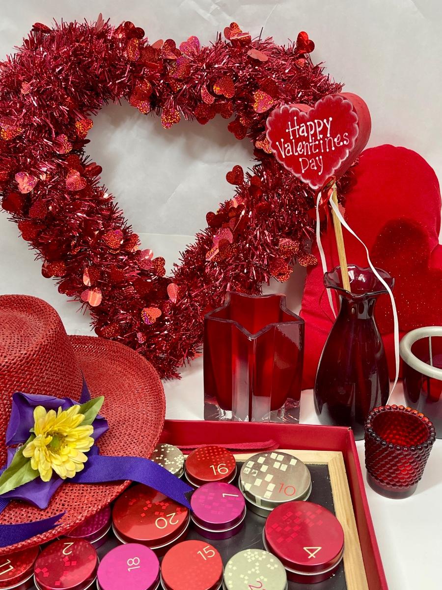 Lot of LOVE DECOR red wreath, hat, candleholders, vase, mini can calendar, etc