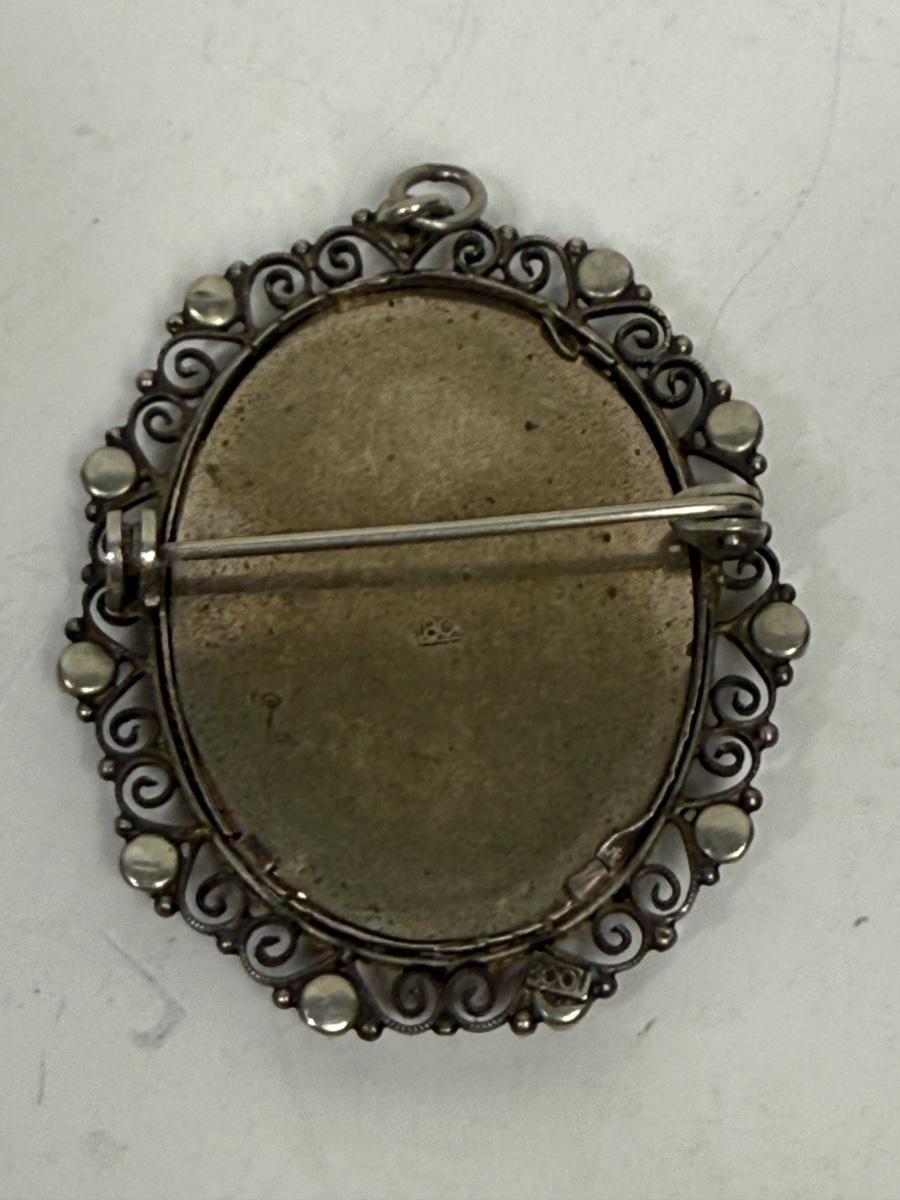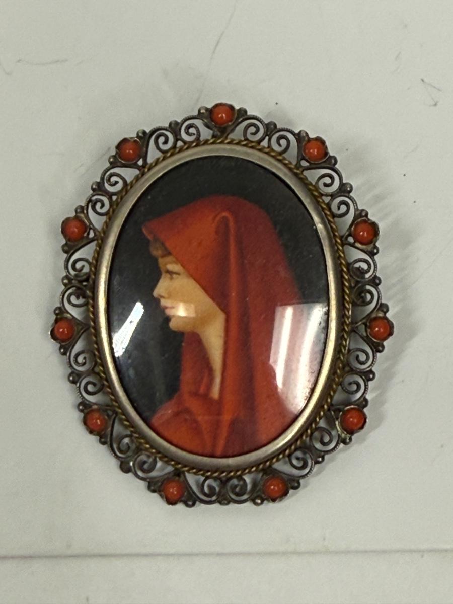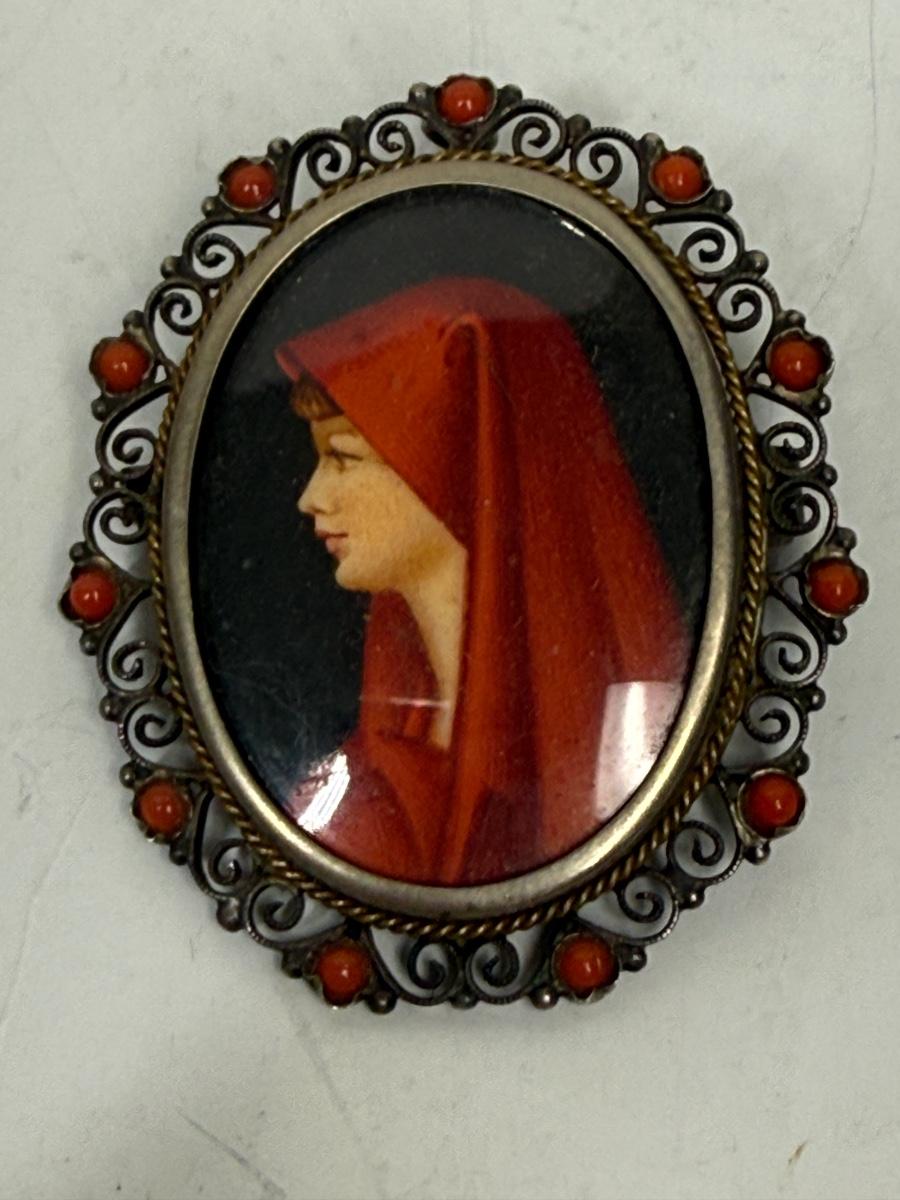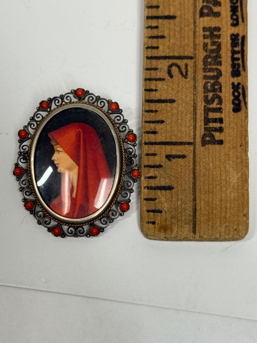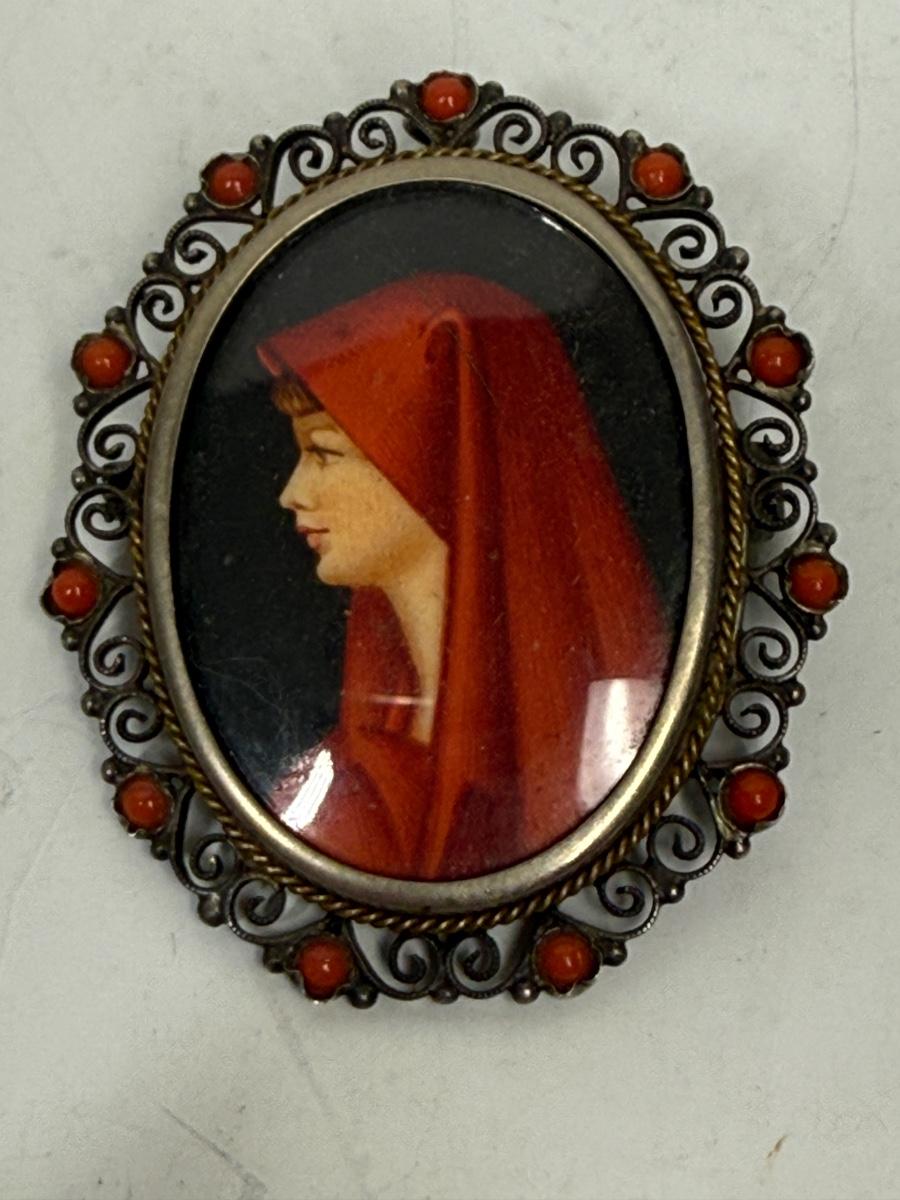 Miniature Portrait of Saint Fabiola in 800 Silver Brooch Pendant Filigree Setting | Italy