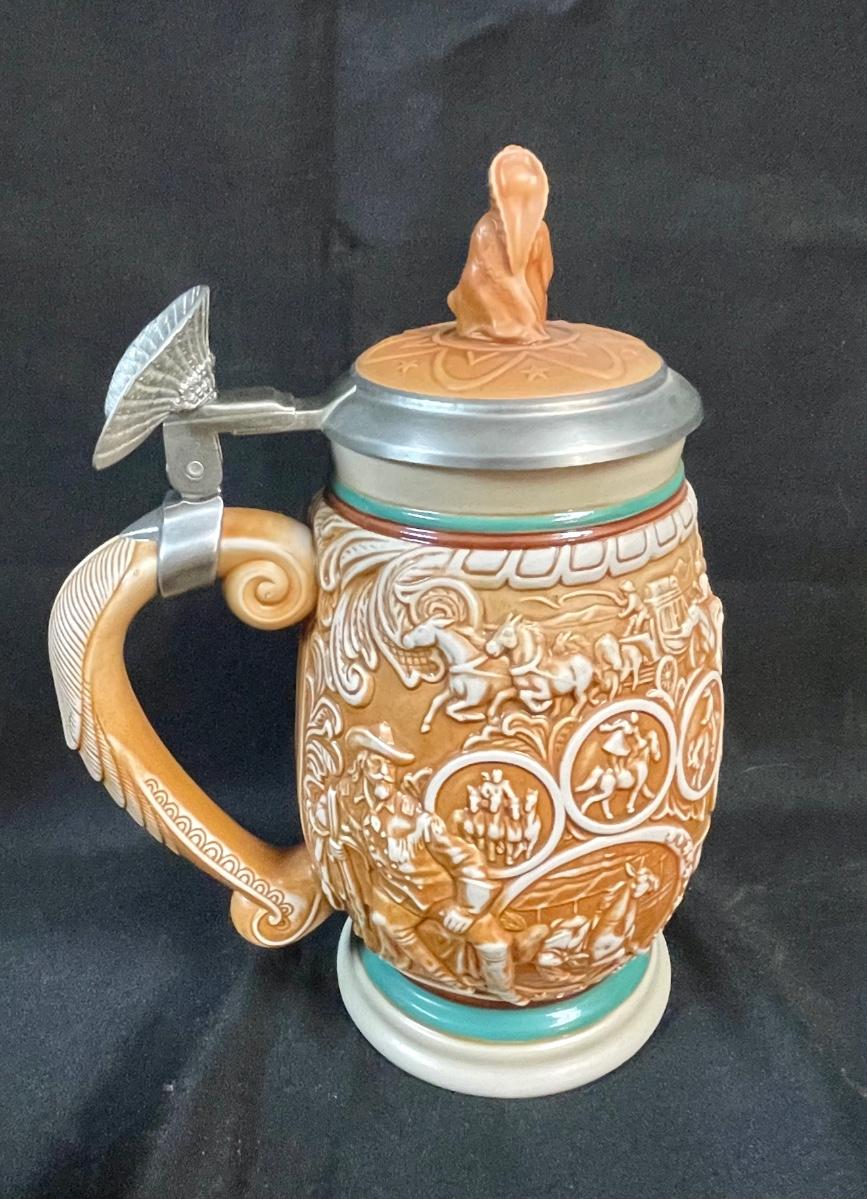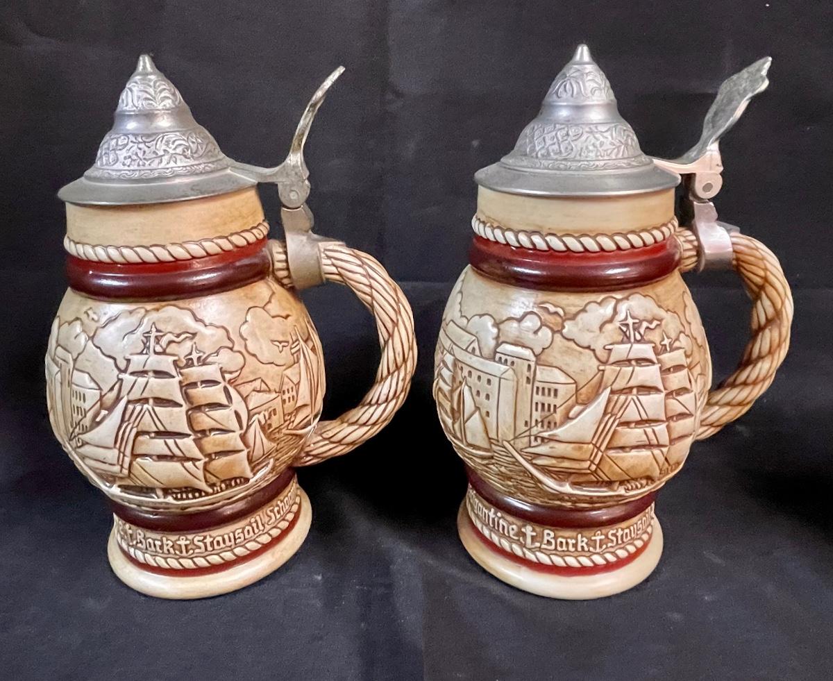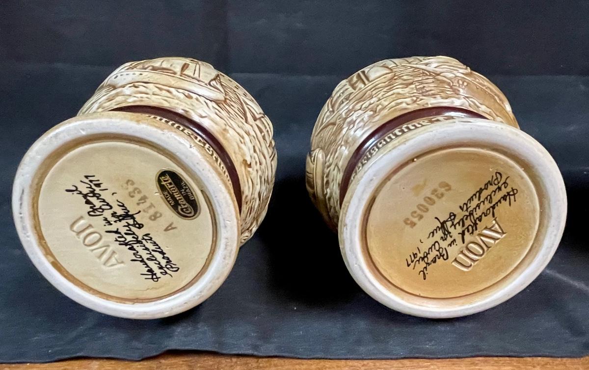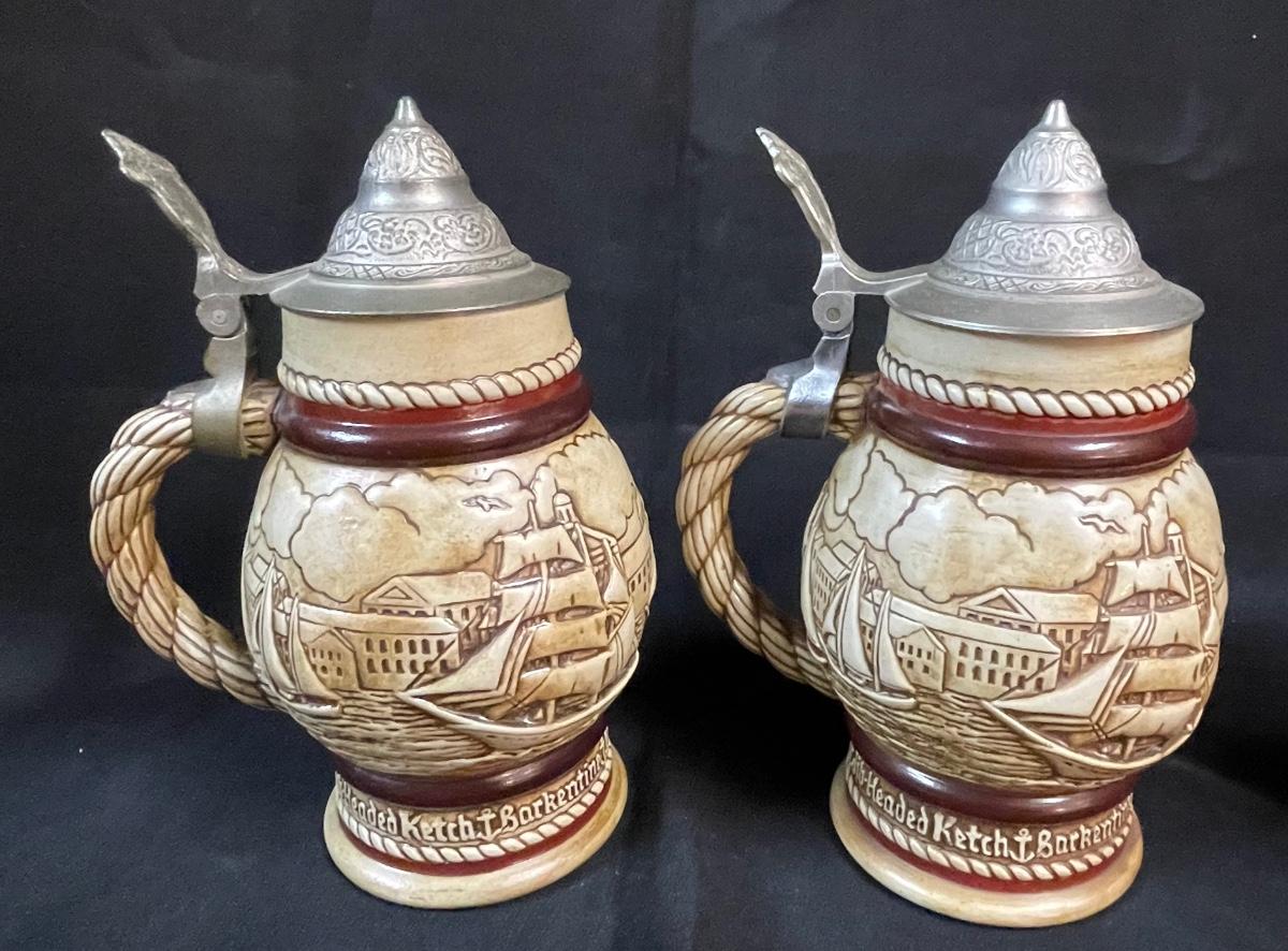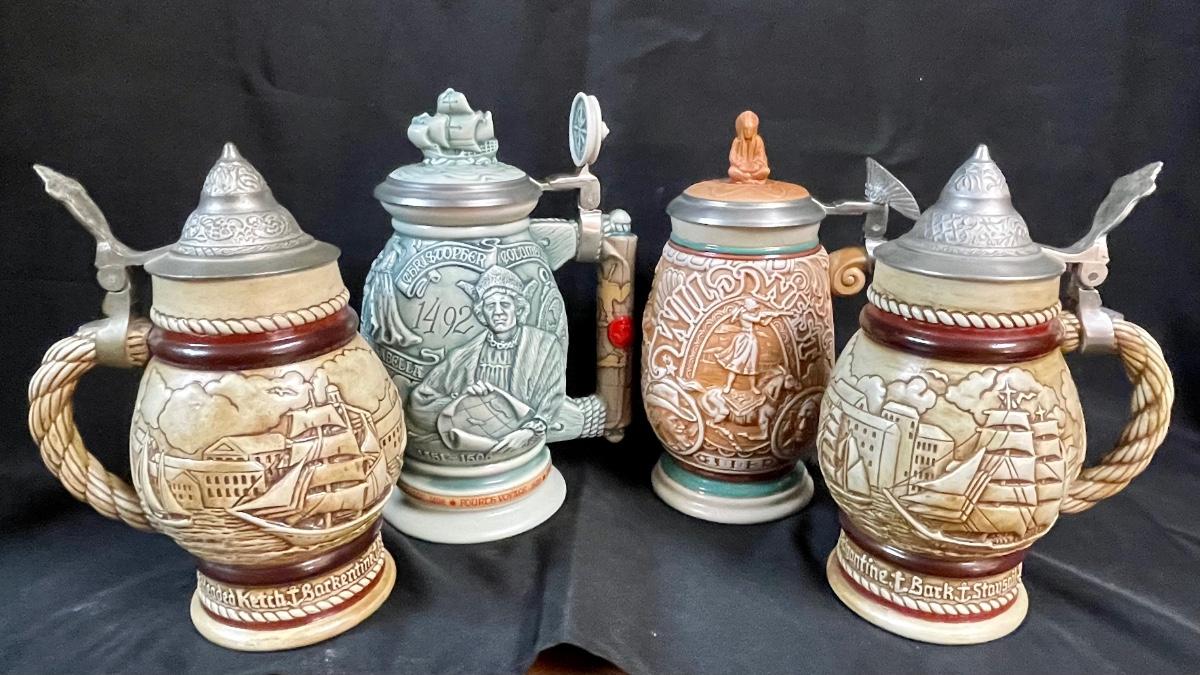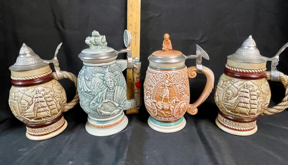 Beer Stein Lot - 4 AVON Beer Mugs Steins with sculpted sides and figural tops Early America theme