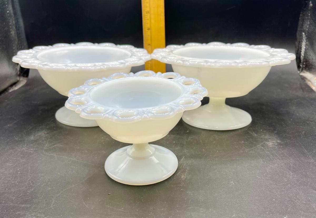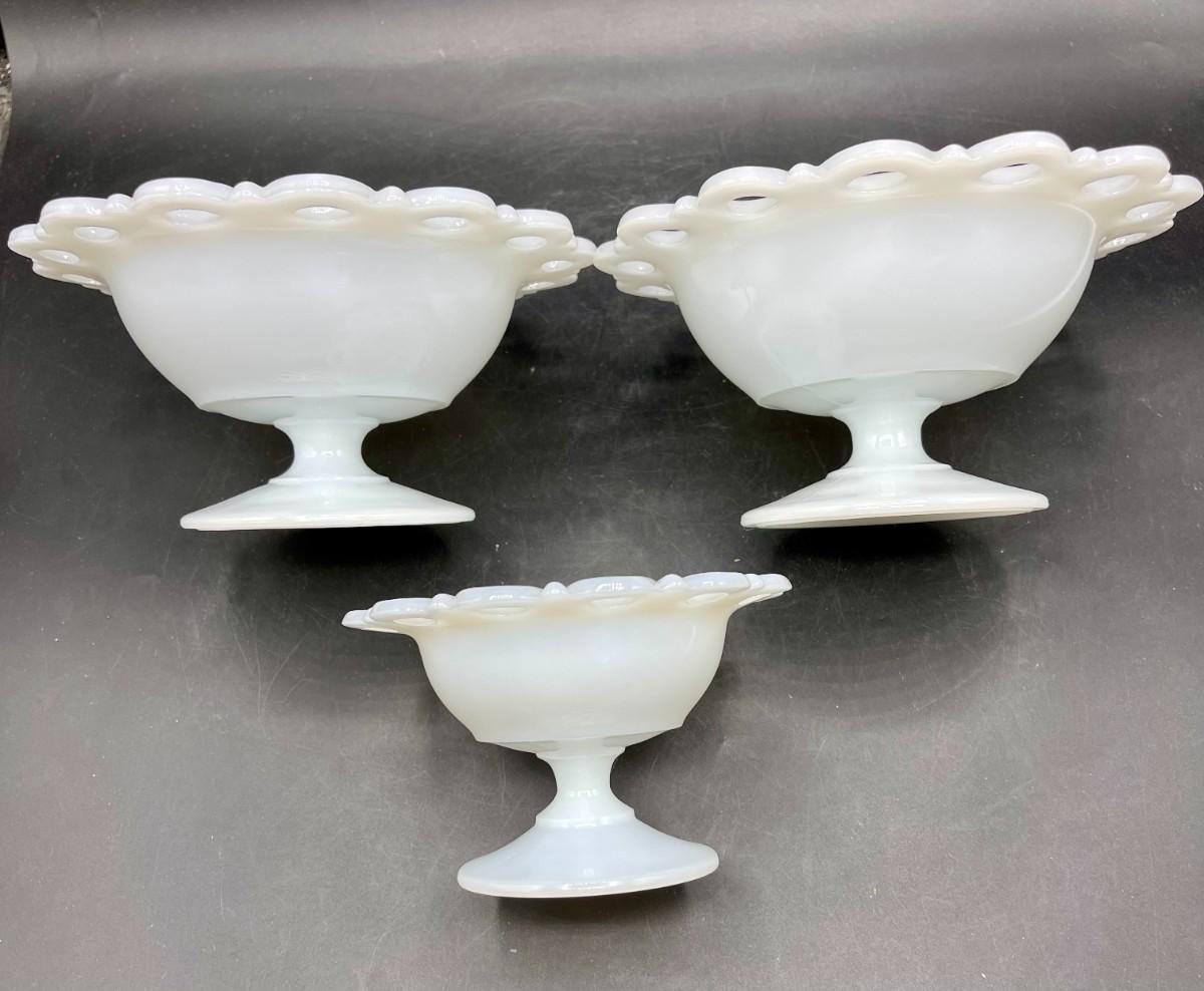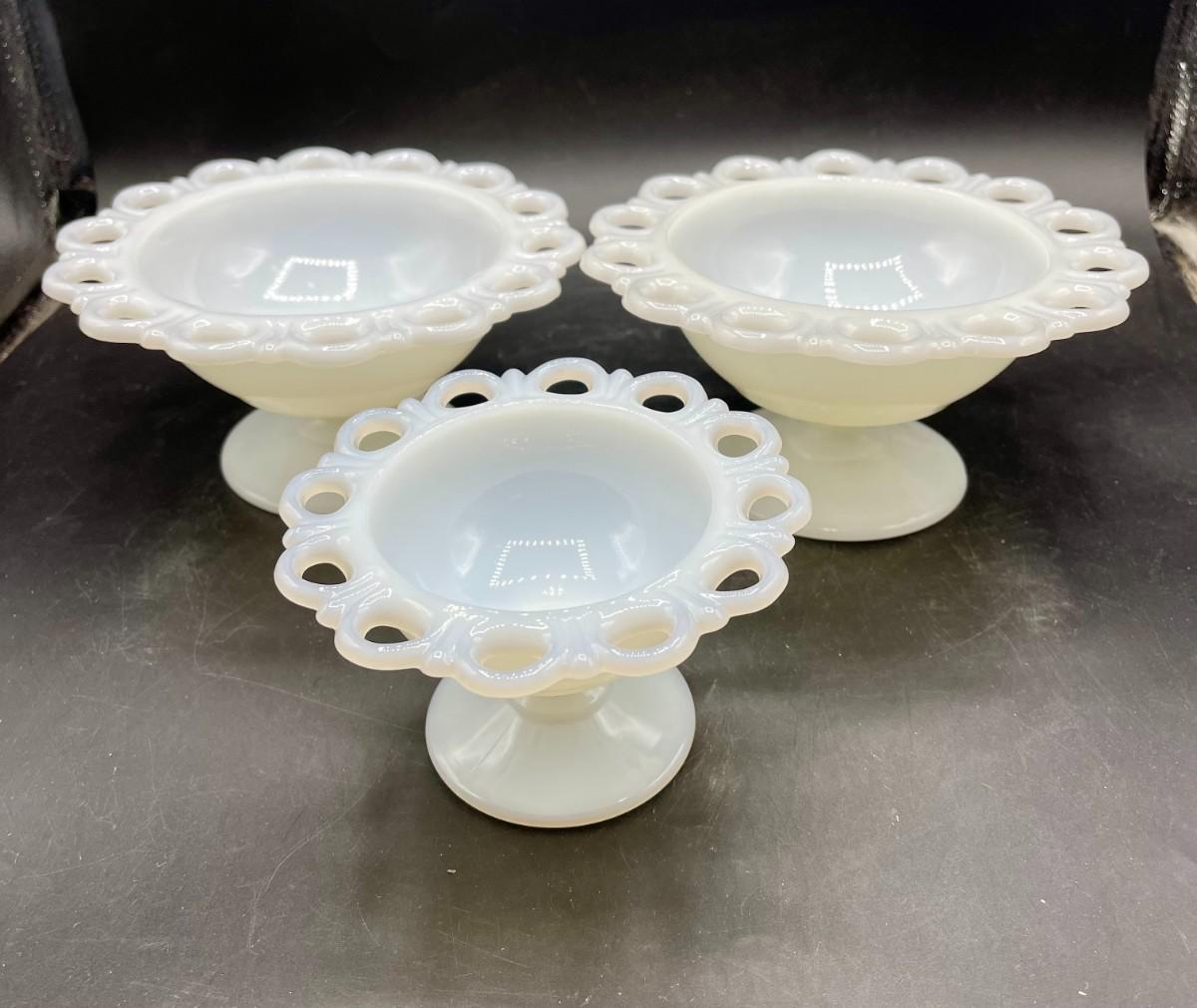 3 Vintage Milk Glass Lace Edge Footed Pedestal Compotes