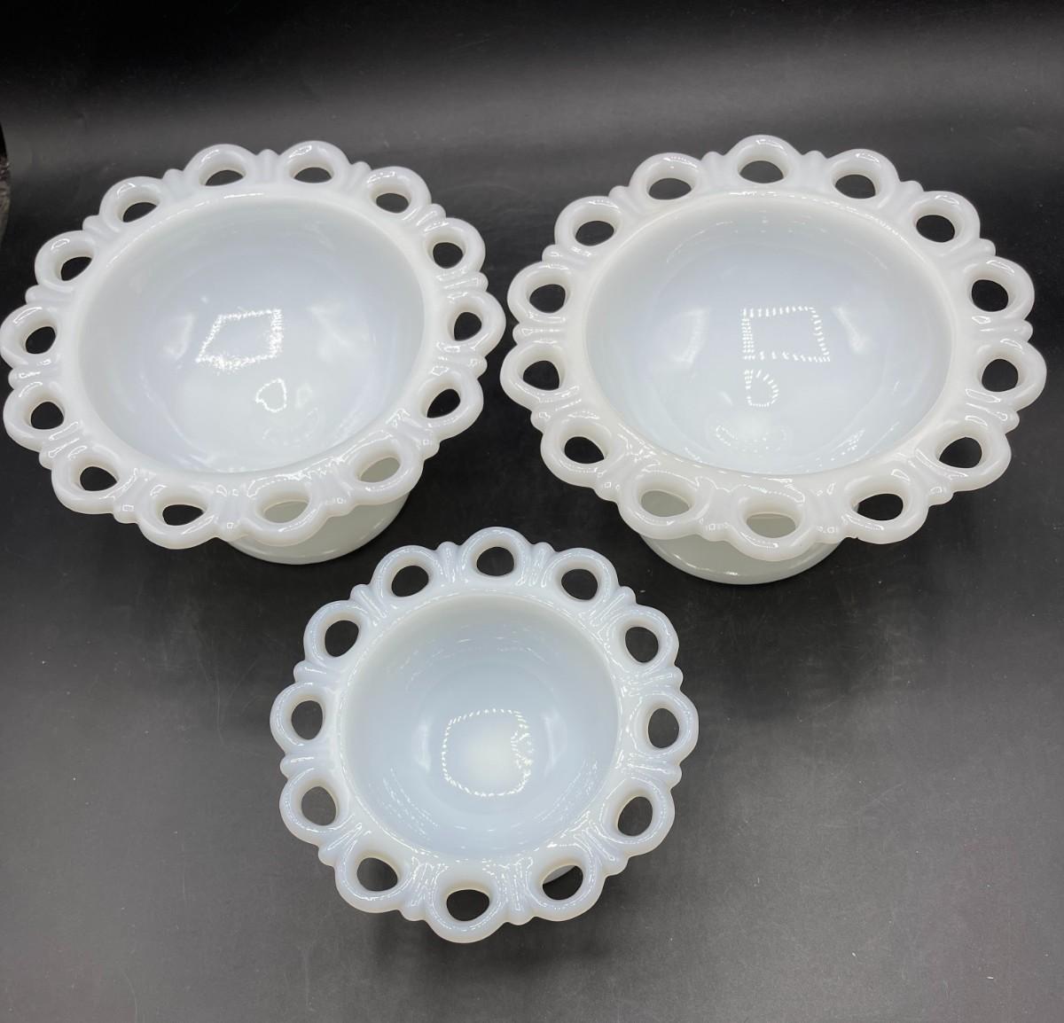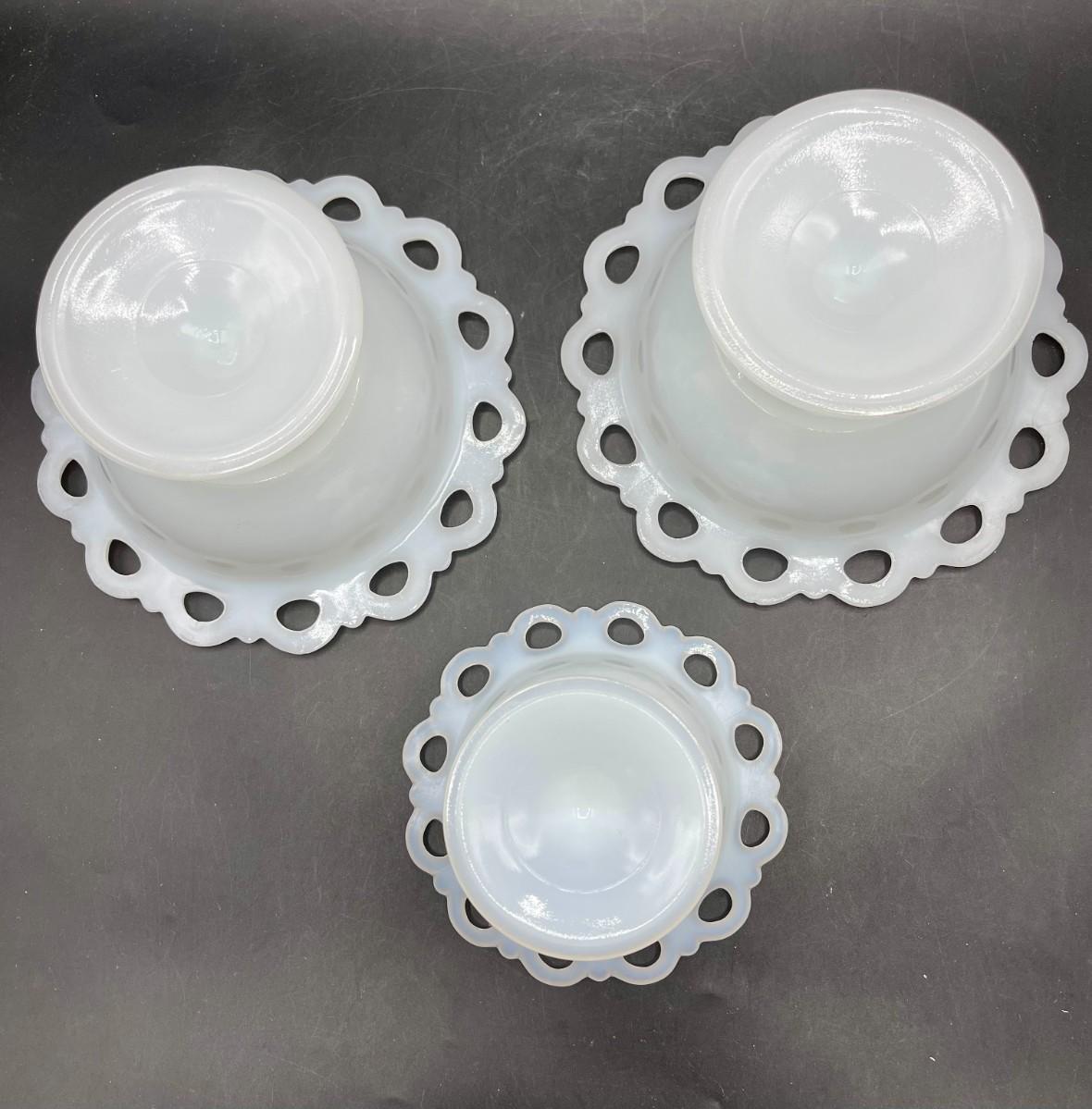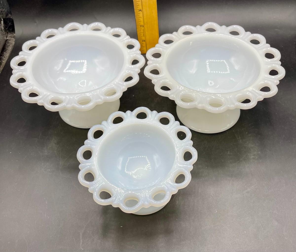 3 Vintage Milk Glass Lace Edge Footed Pedestal Compotes
