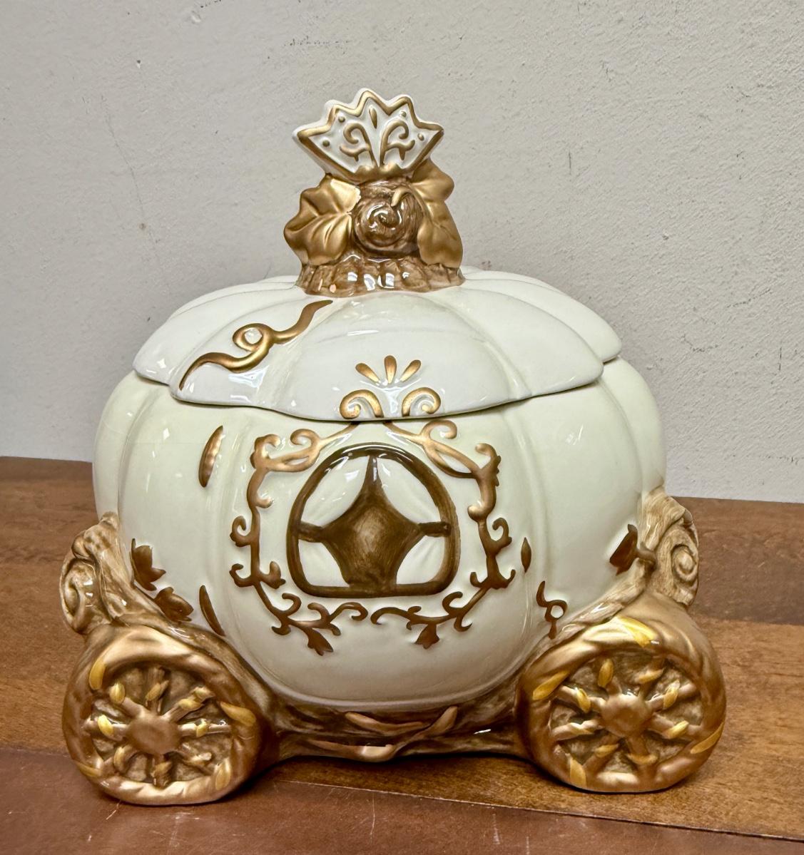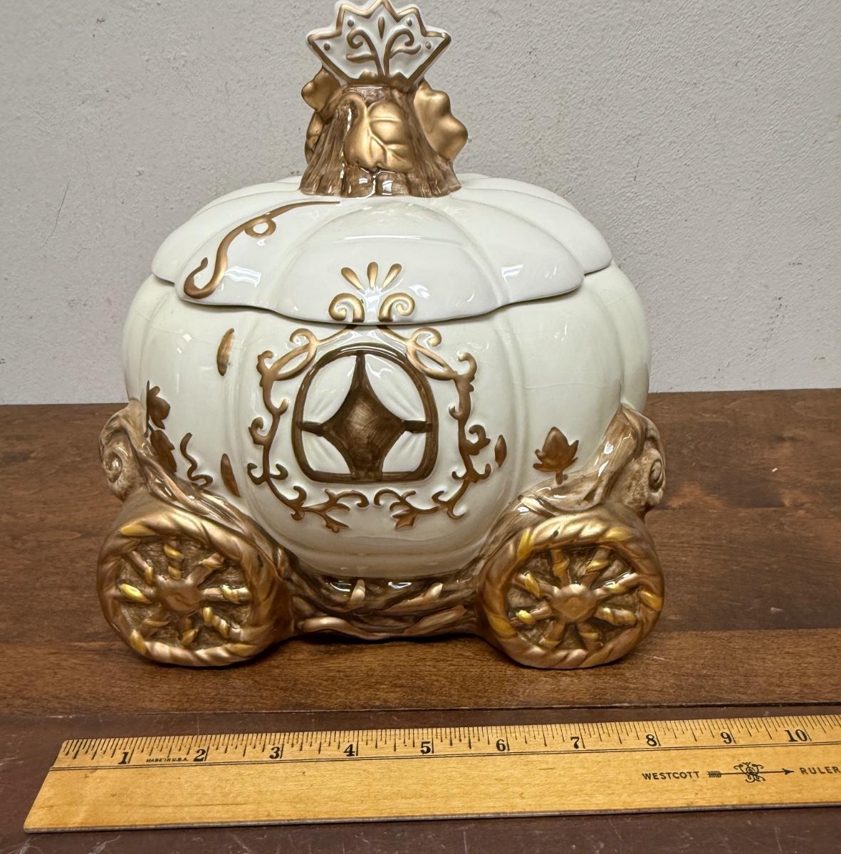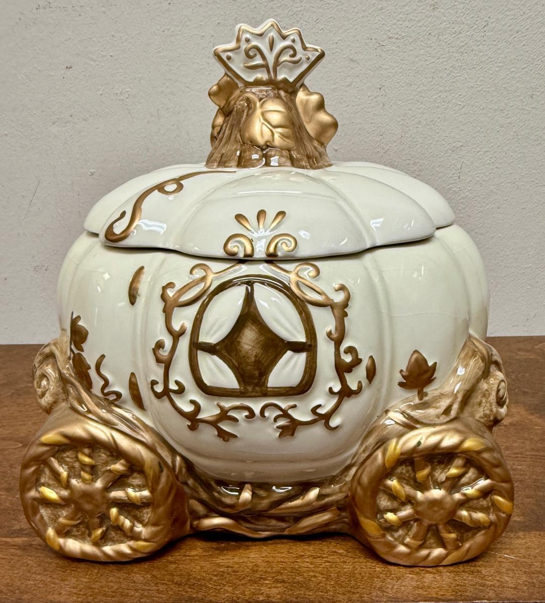 David’s Ceramic Cinderella Cooke Jar Carriage Gold & Ivory