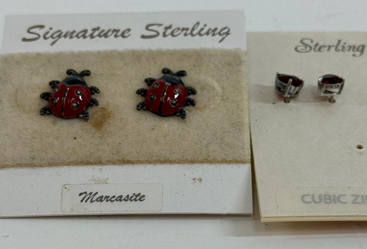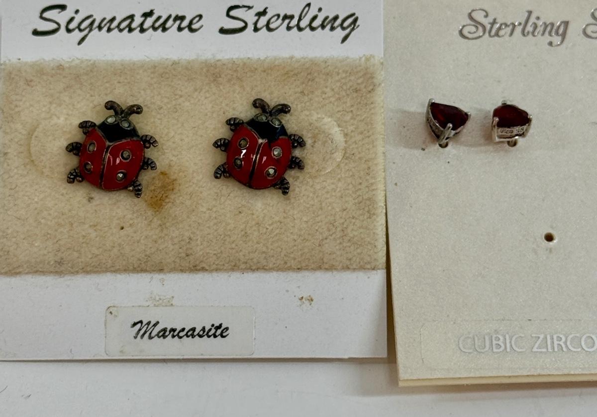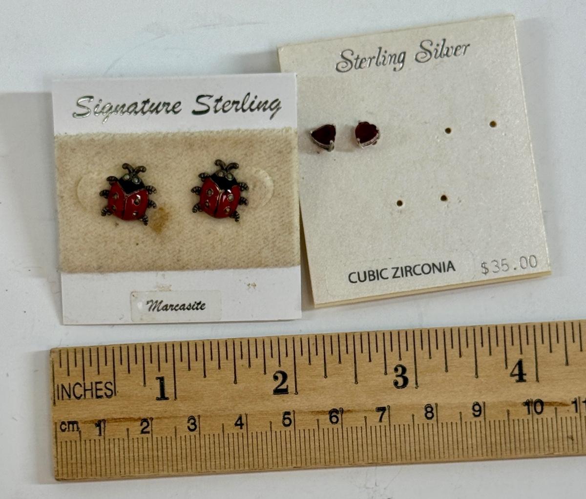 Both for pierced ears. One set is small red faux rubies, the other set is a pair of red ladybugs. Good condition.