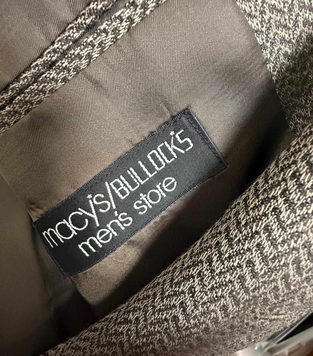 Medium brown color, 100% wool, made in Korea for Macy's/Bullock's Men's Store. 3-button traditional style. Good condition.