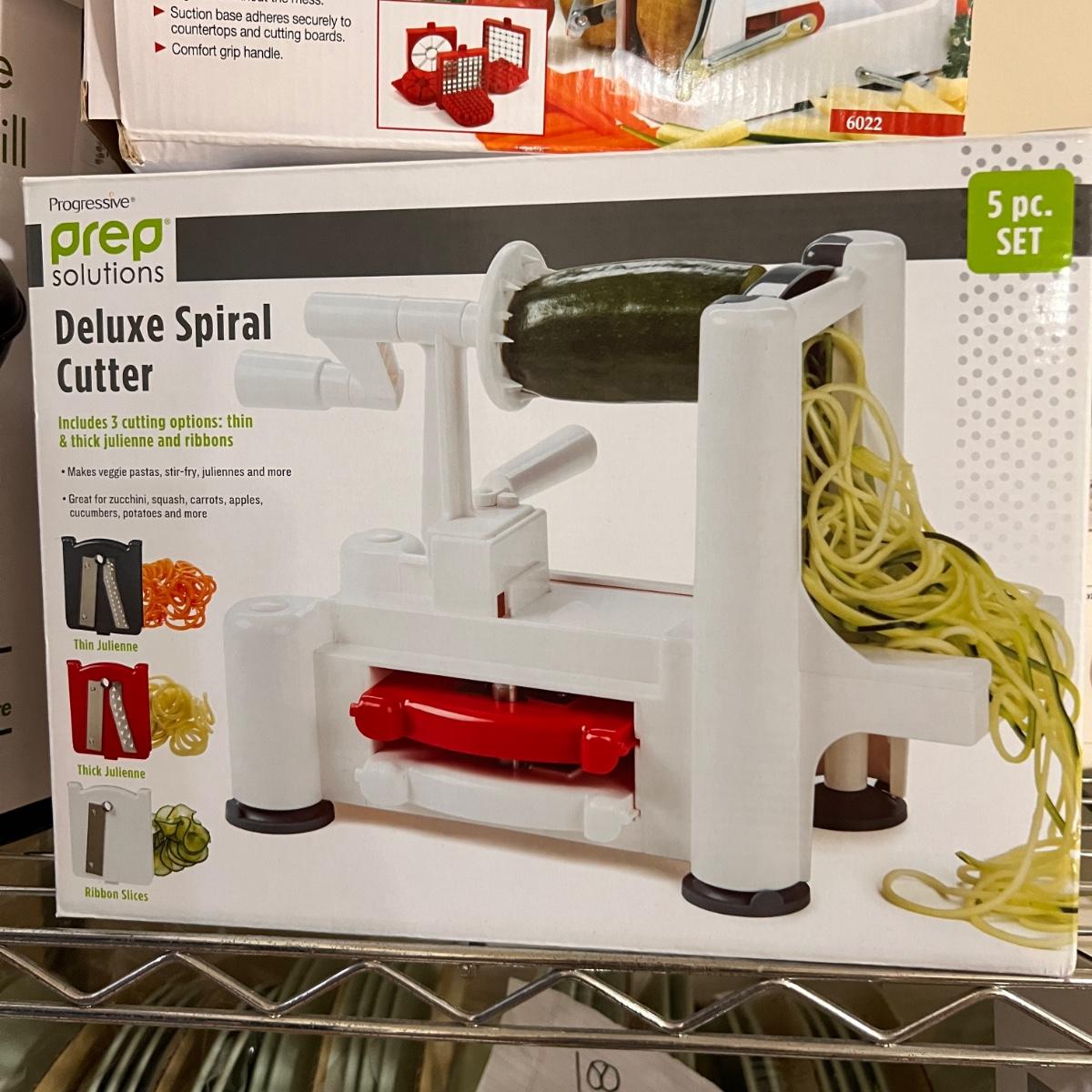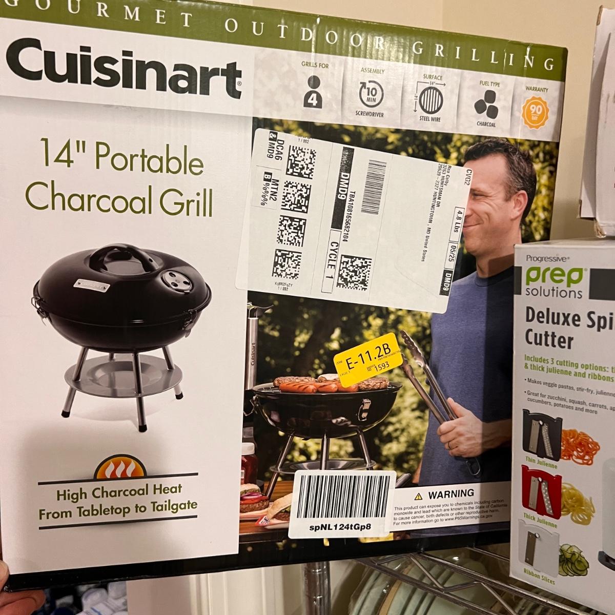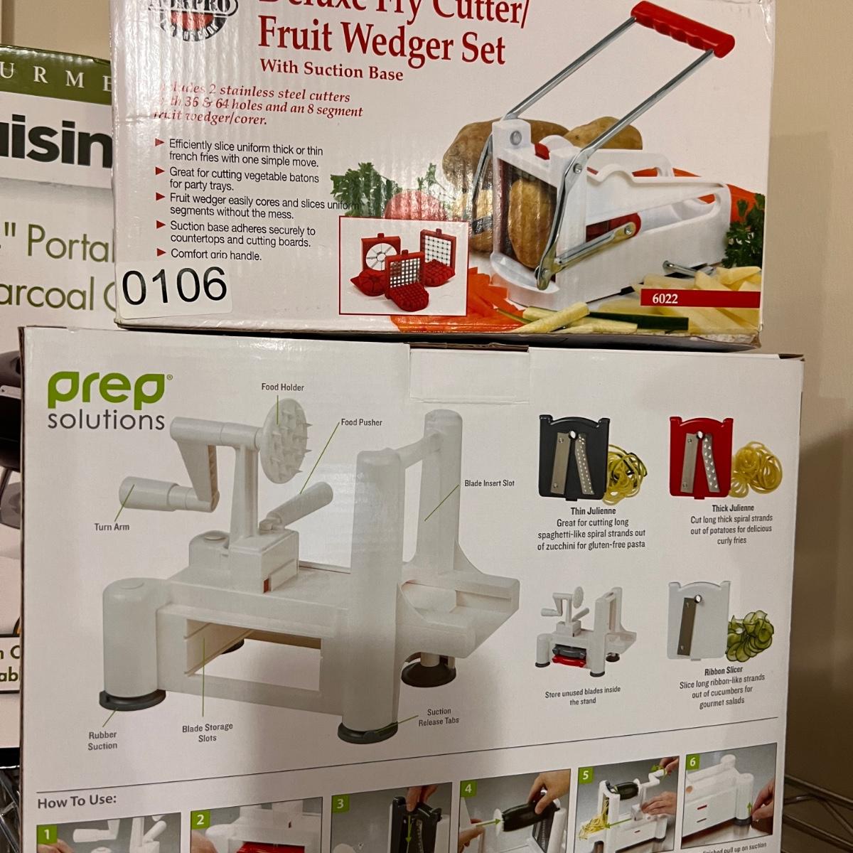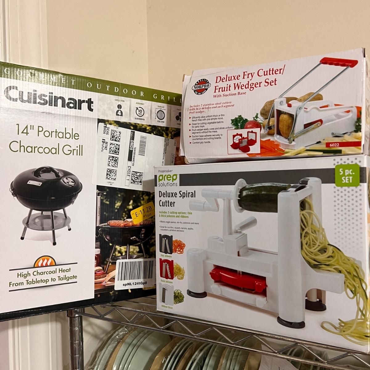 Cuisinart 14" portable grill new in box, Deluxe fry cutter/fruit wedger set new in box, Prep Solutions Spiral vegetable cutter new in box.
