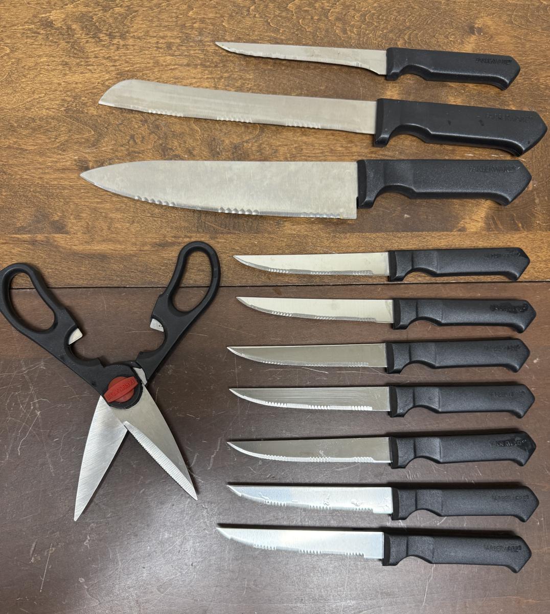 Incomplete set: 7 Steak Knives, Chef Knife, Bread Knife, Boning Knife and Scissors. All in good condition, but may need sharpening.